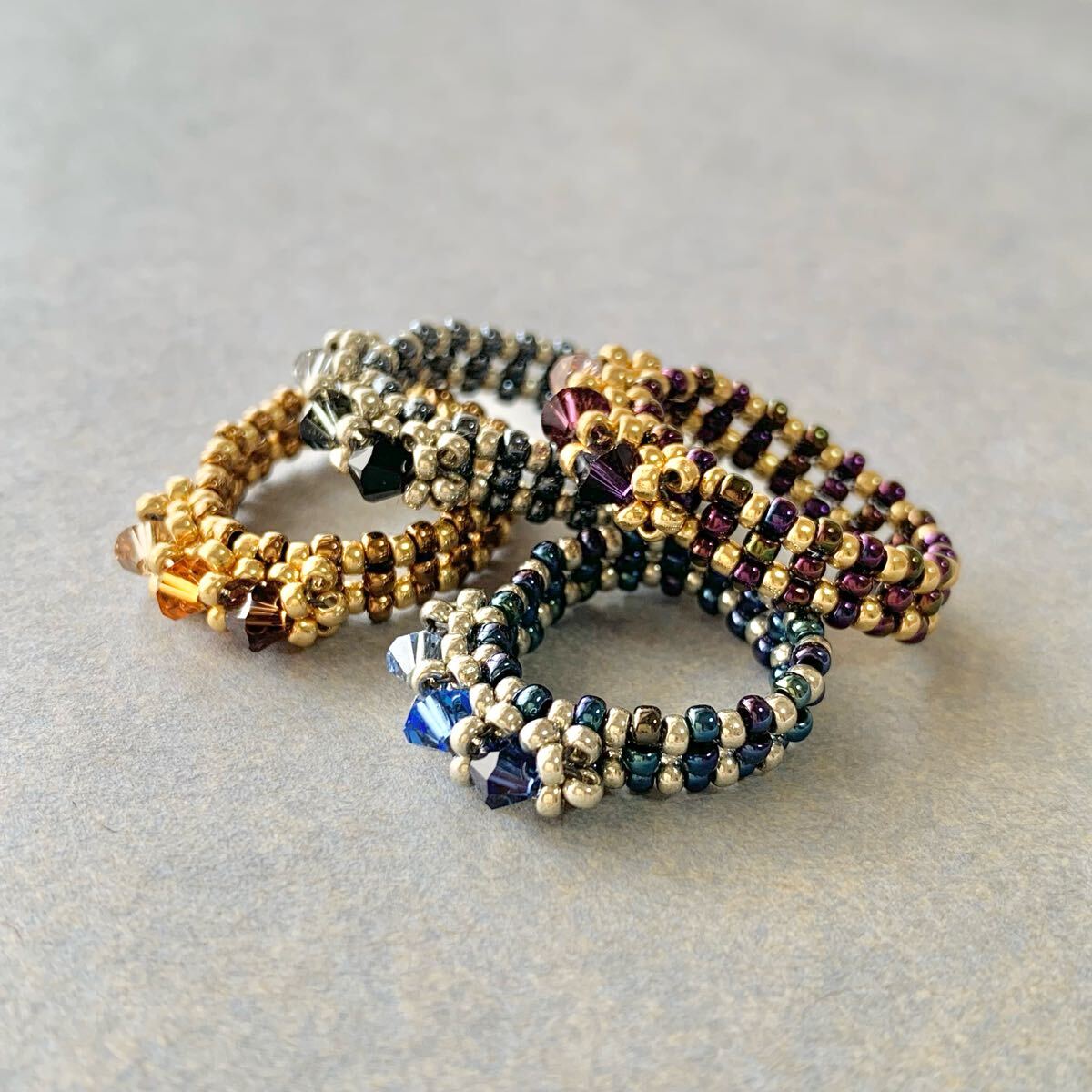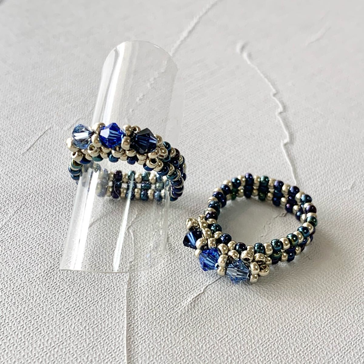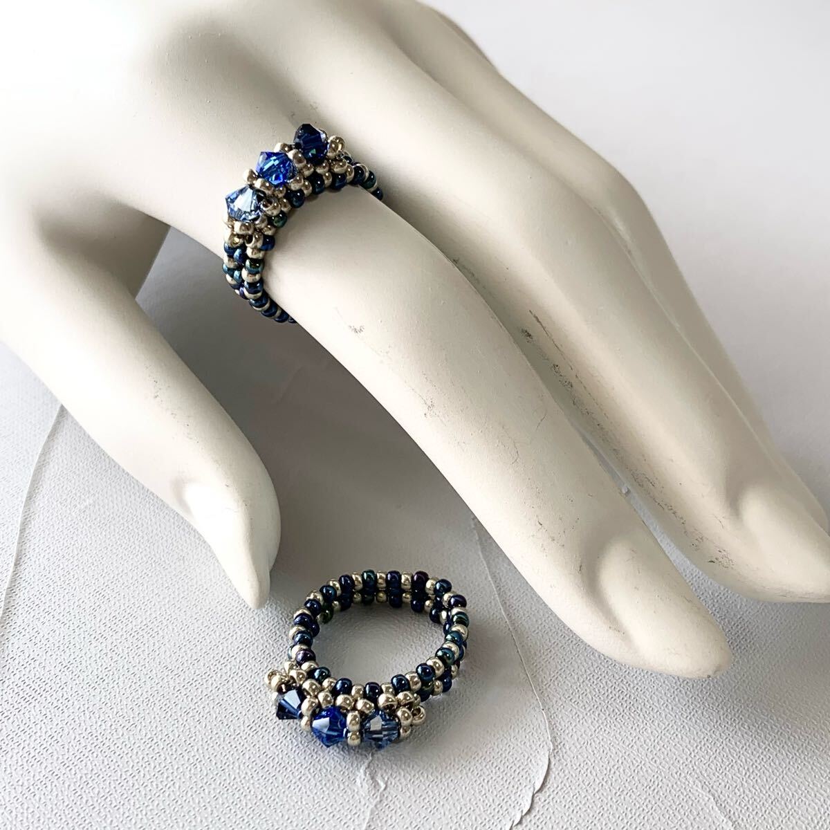 深みのあるブルーとシルバーのコントラストが美しいリングです。グラデーションにあしらったスワロフスキークリスタルビーズが光を浴びるたびに輝き、指元を華やかに彩ります。丁寧に編み上げたビーズのリングは指に優しくフィットし、様々なシーンでお使いいただけます。上品なデザインながらも存在感があり、お手持ちのアクセサリーとの重ね付けも楽しめます。ご自身へのご褒美に、大切な方へのプレゼントに、この煌めくリングはいかがですか?