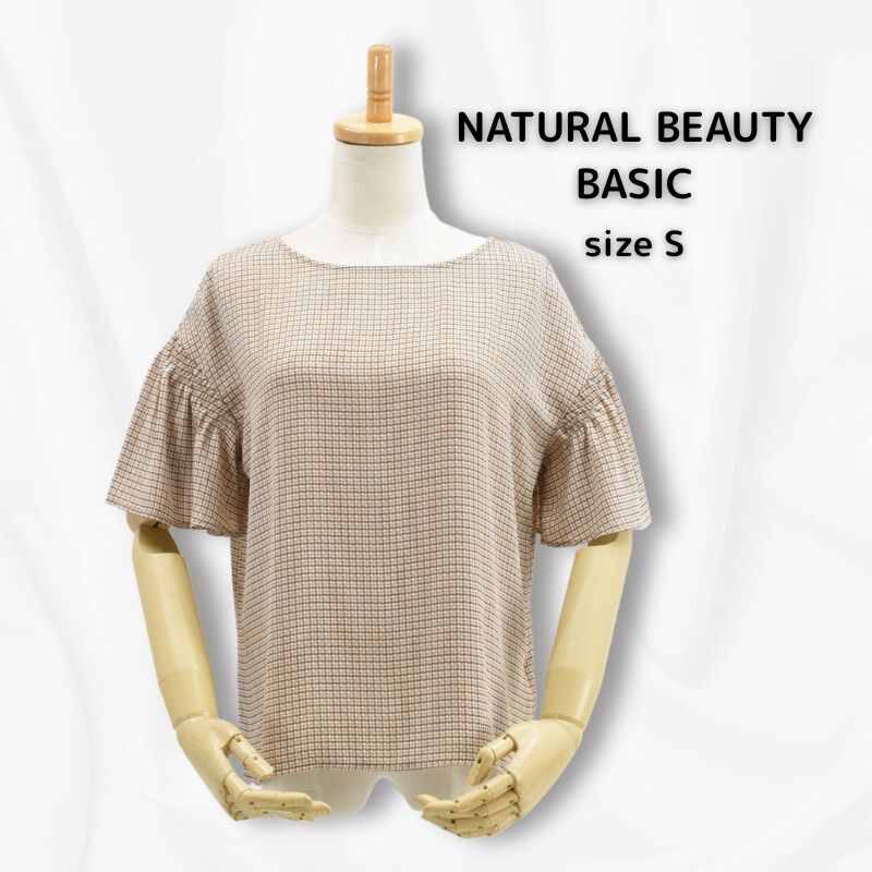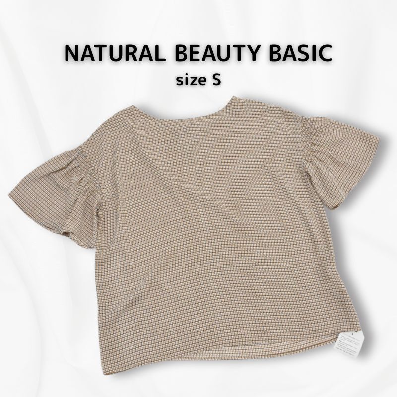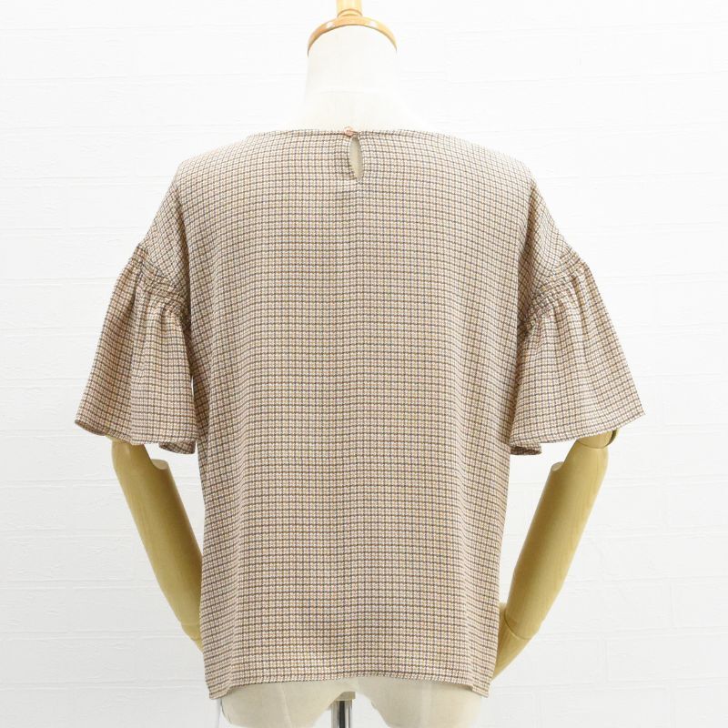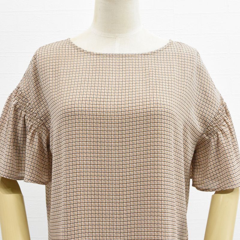 夏に向けた薄手のチェック柄の素材で、袖がフレア袖デザインになっています。