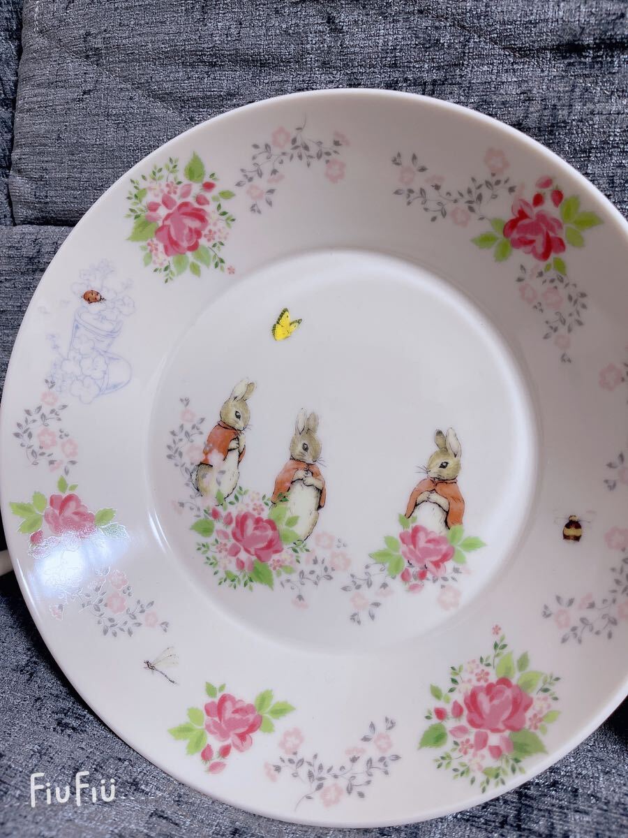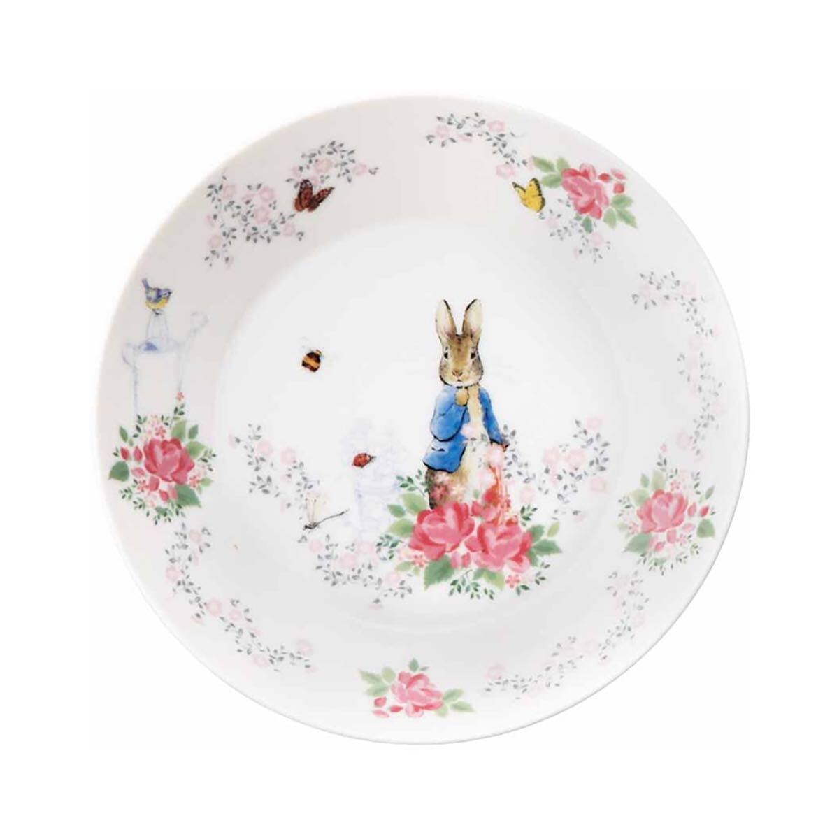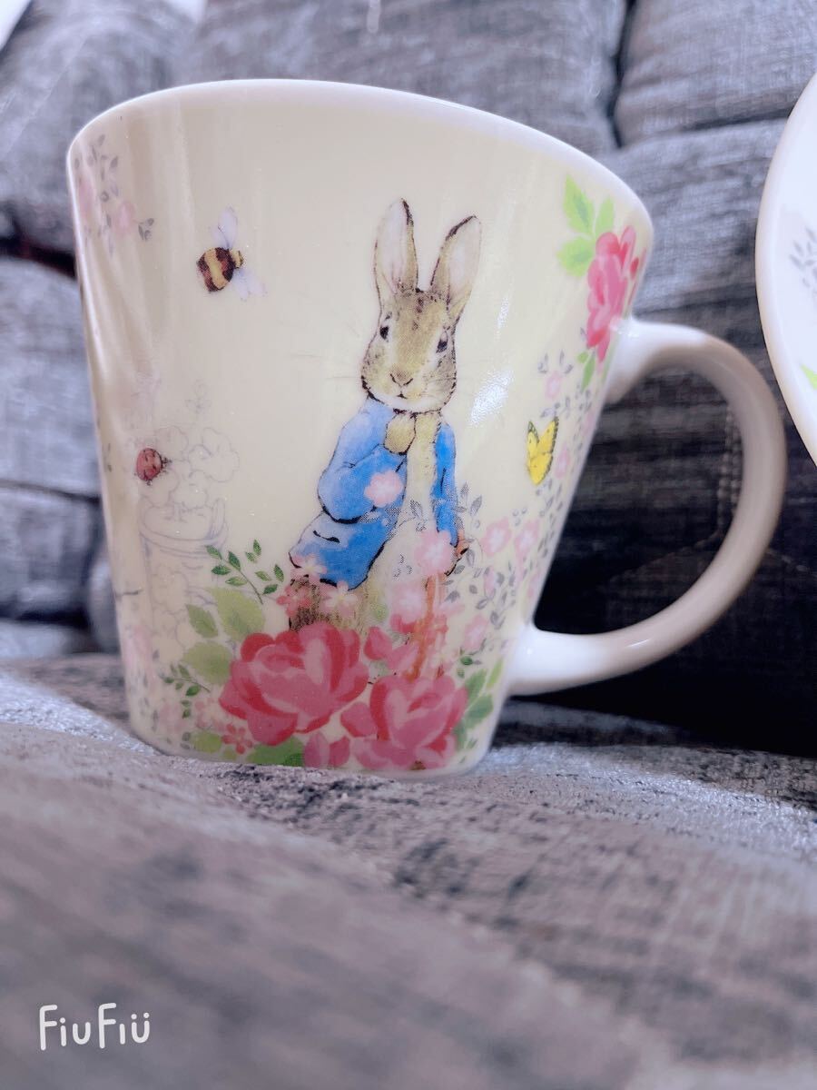 ふんわりとしたピンクのフラワーガーデンにたたずむピーターラビットが可愛らしいお皿+マグカップです。