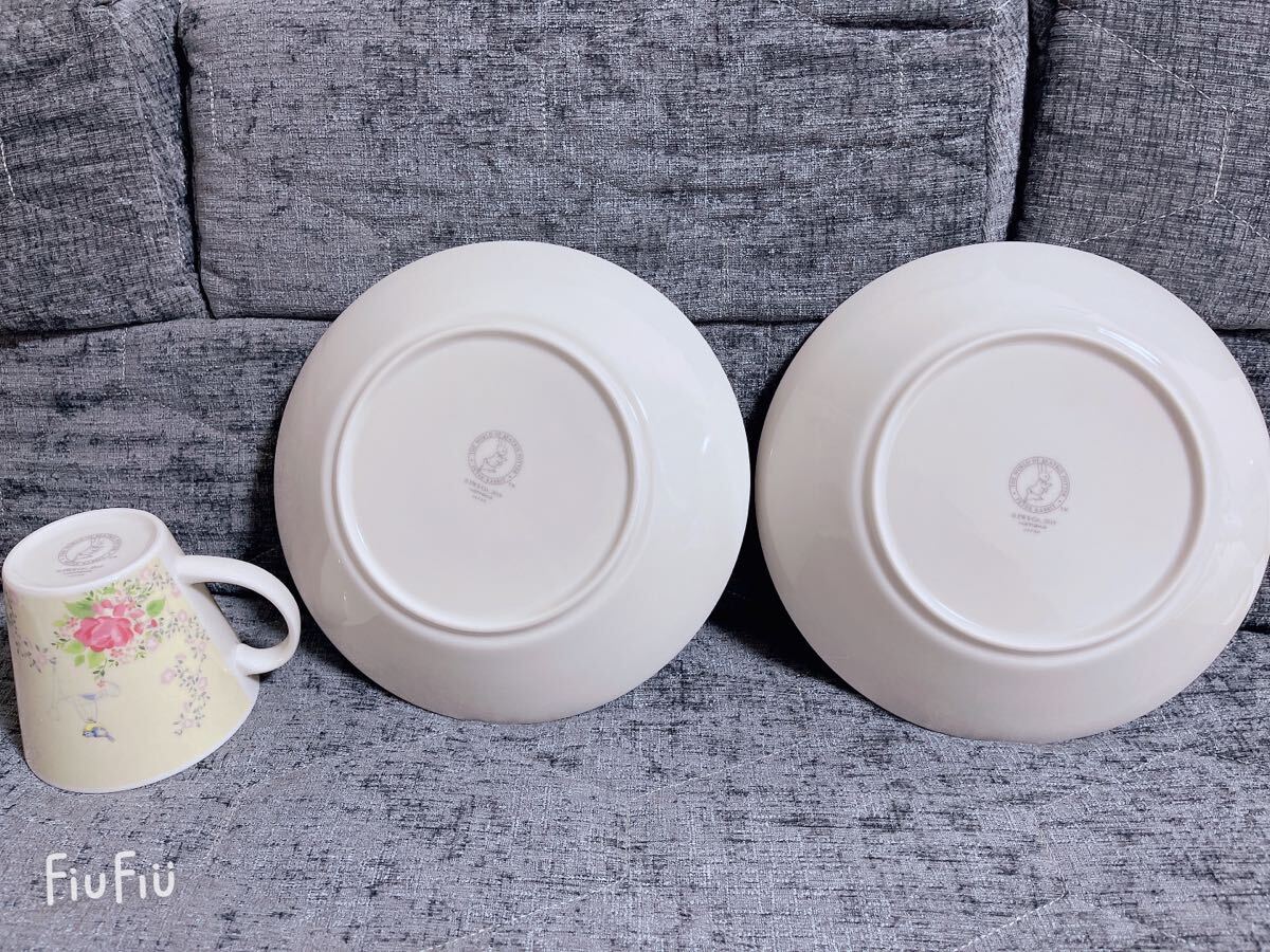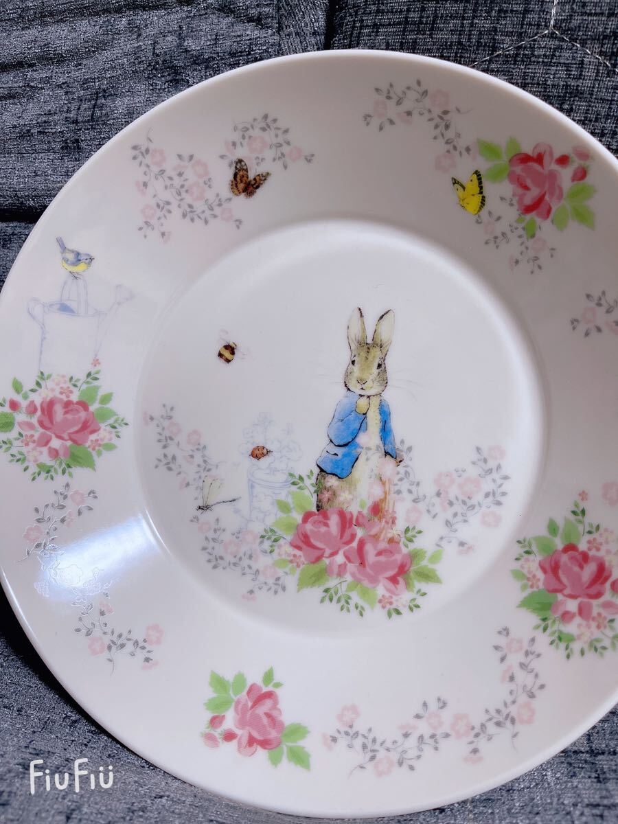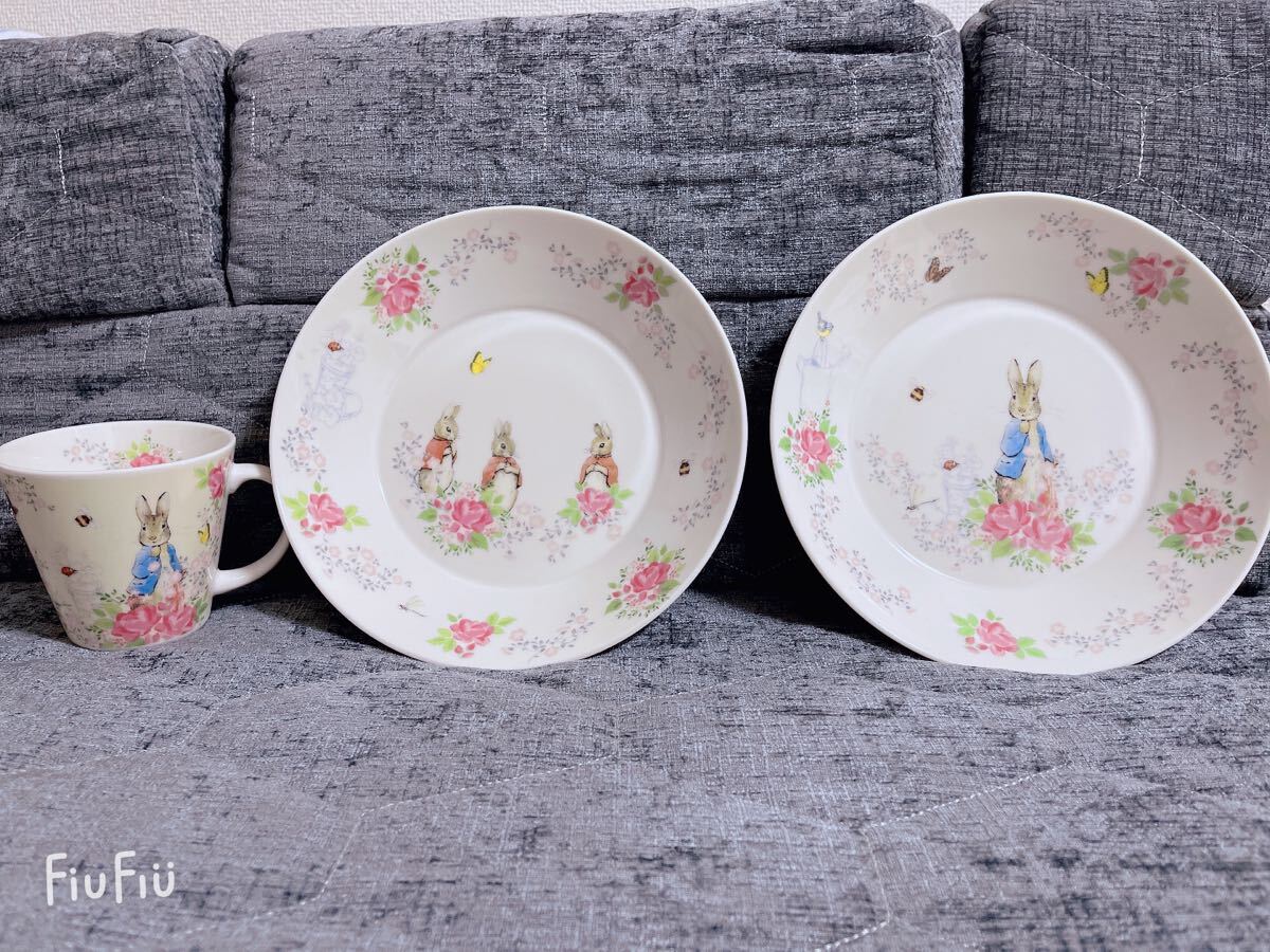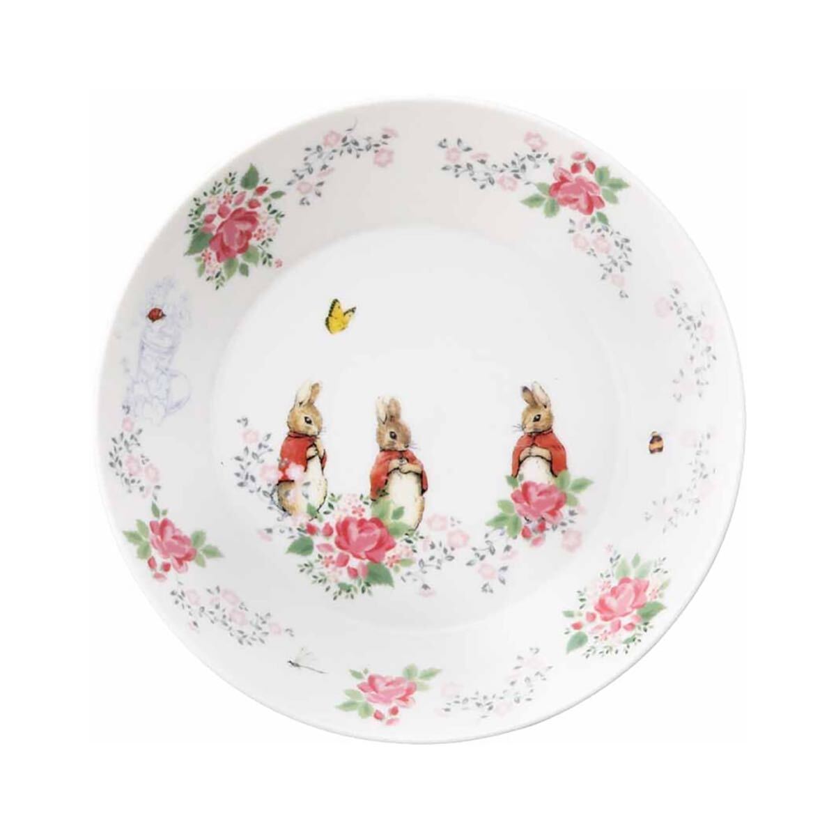 ふんわりとしたピンクのフラワーガーデンにたたずむピーターラビットが可愛らしいお皿+マグカップです。