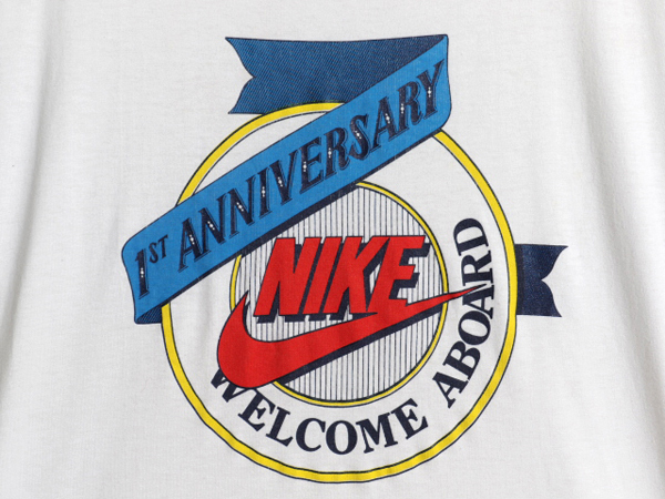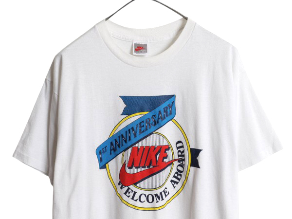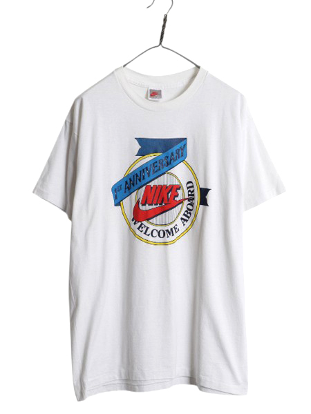 90年代のオールド 初期銀タグ ナイキのプリント 半袖Tシャツです。 復刻ではない当時のオリジナル 素材は、50% POLYESTER・50% COTTON 柔らかい着心地抜群の素材が使用されています。 希少な MADE IN USA (アメリカ製) 裾、袖、共にシングルステッチのオールドボディ フロントに、ビッグスウッシュロゴと 1st Anniversary Welcome Aboard のプリント入り 90年代ナイキらしいシンプルながら 存在感のあるグッドデザイン 合わせやすいホワイトボディー 世界的人気で高額で取引される オールドナイキの当時物 これ一枚で様になる商品です。 |