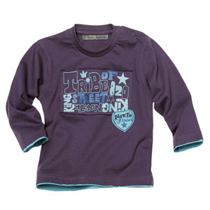 落ち着いた紫地に文字プリントとワッペン刺繍が入っています。