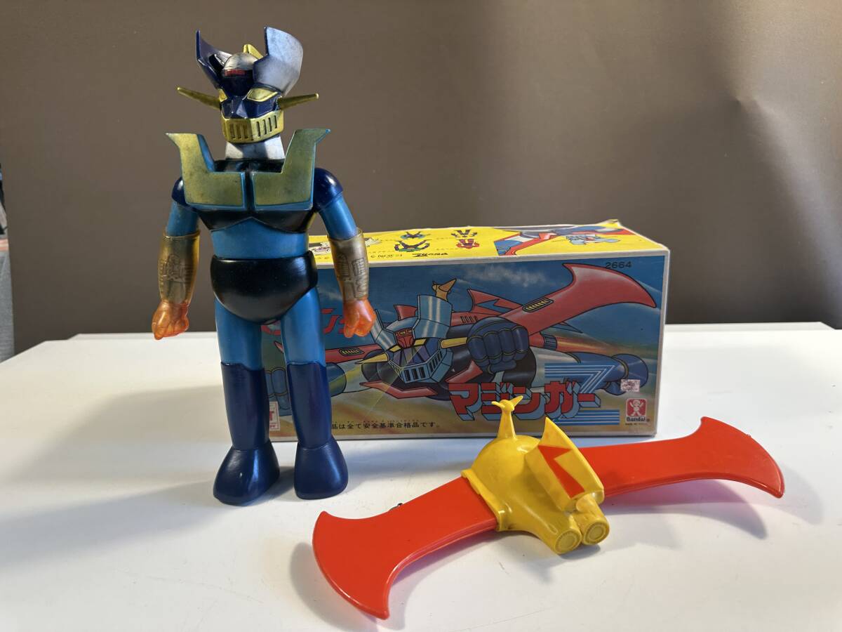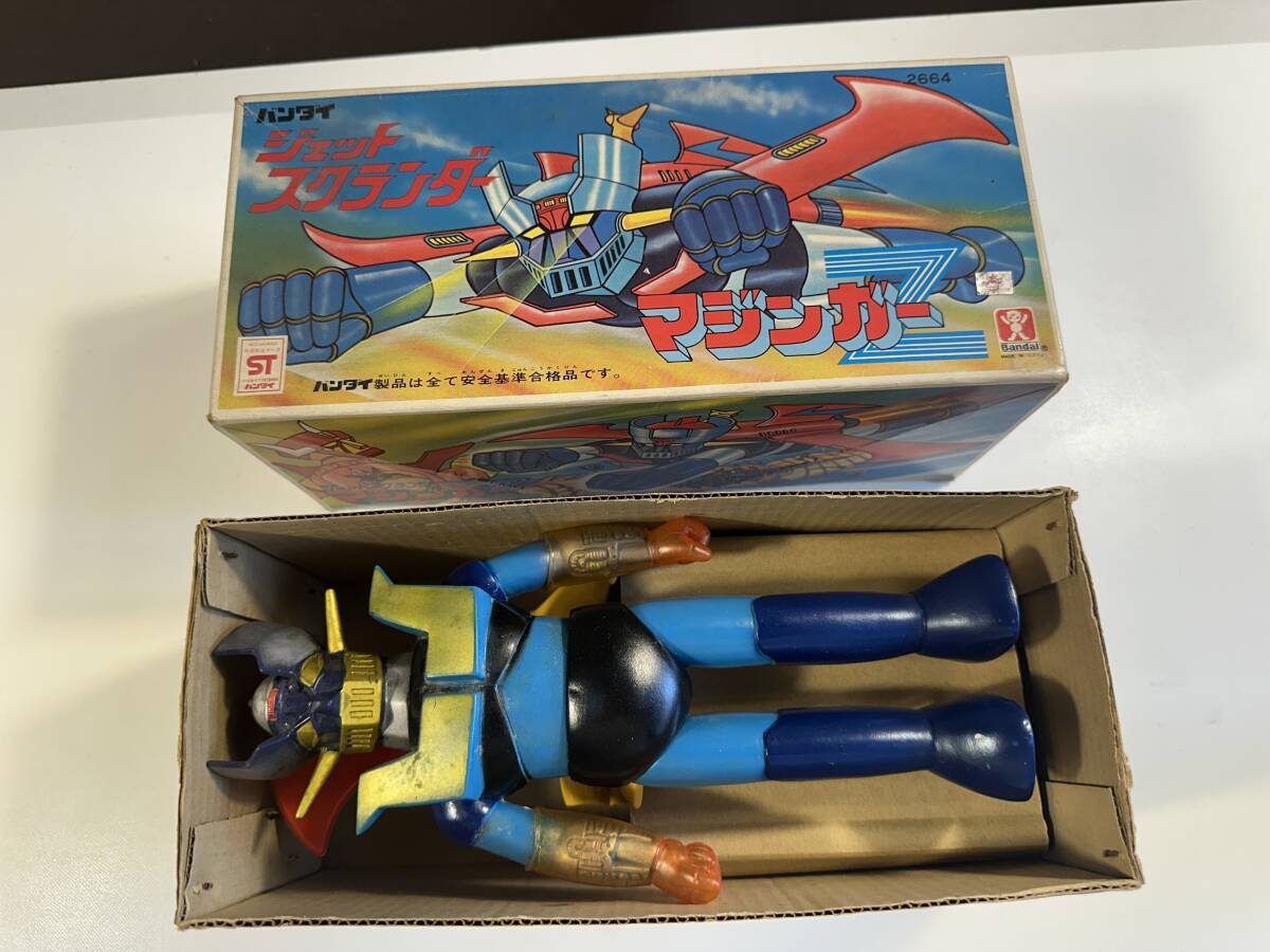 ・商品名 マジンガーZ ジェットスクランダー付き 全長27.5㎝ 自立します。 ブーツ底に以下記載あります。 ダイナミックプロ 東映動画 バンダイ 箱付き サイズ 30.5㎝×13.5㎝×13㎝ ・状態 ソフビ 目立つ汚れ/キズ等は無いと思います。 経年落下で色落ち細かい汚れ少しあります。 ジェットスクランダーの黄色い部分に薄い汚れあります。 箱 当時モノにしては、きれいな状態だと思います。 写真参考にて、判断をお願いいたします。経年保管品ですので見逃し等有るかもしれませんので、ご理解していただける方にて、お願いいたします。神経質な方は、すみませんが、ご遠慮ください。 現状販売ノークレーム・ノーリターンでお願い致します。 | ||||