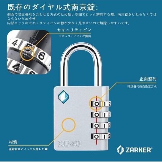 ダイヤル式ロックのセキュリティ:暗証番号は安全性を高めるために10,000通りの組み合わせが可能。ほとんどの南京錠は、ダイヤル下のセキュリティピンが1つだけの構造のために簡単に開けられてしまいます。ZARKERは4つのセキュリティピンを備えており、盗難から守り、セキュリティ性を高めます。