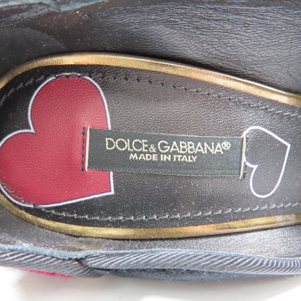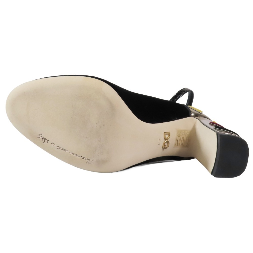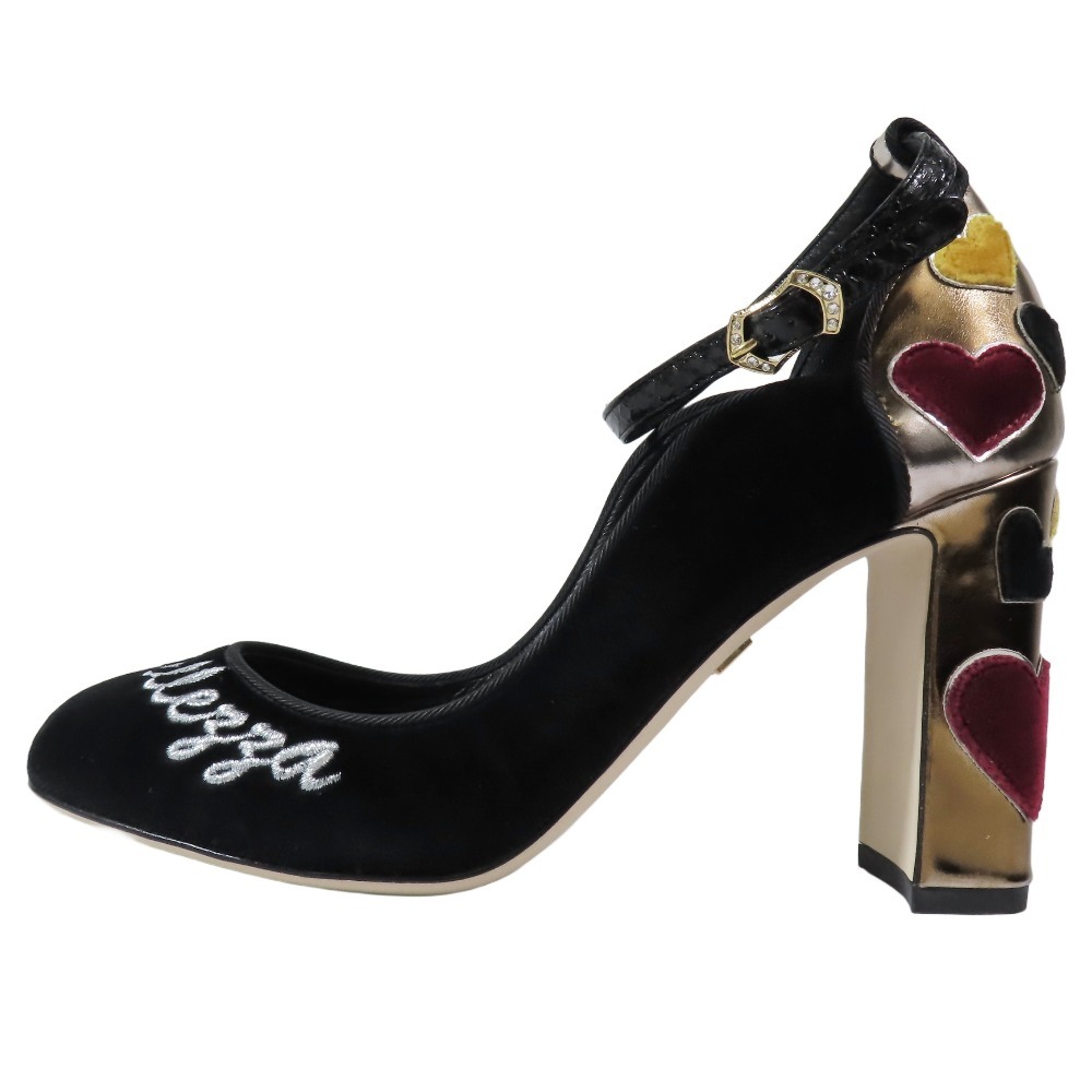 未使用 DOLCE&GABBANA ドルチェ&ガッバーナ ベロア パンプス アンクルストラップ ハートモチーフ 刺繍 37.5 ブラック ゴールド