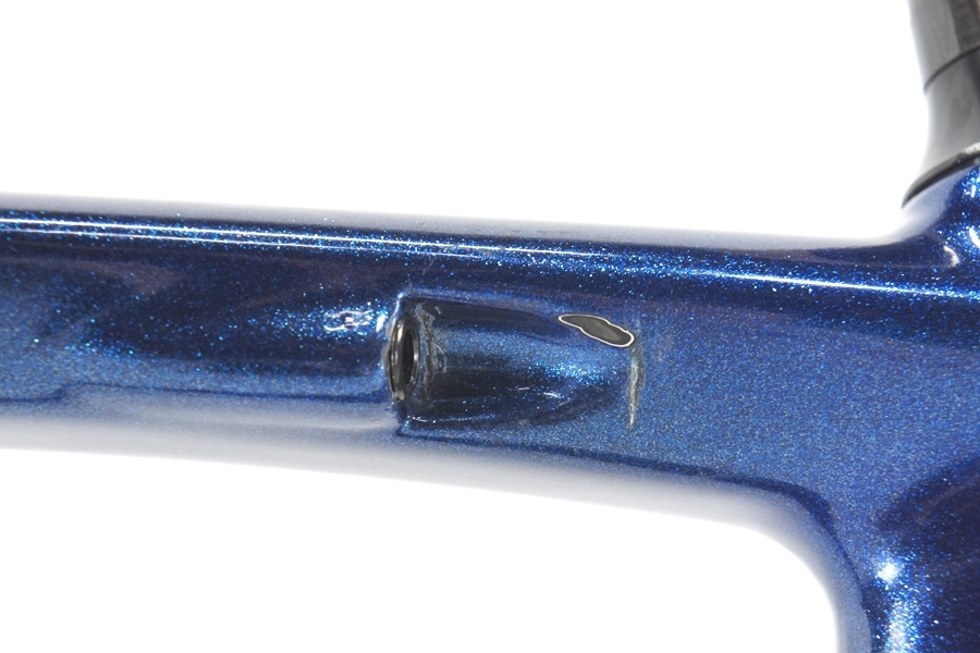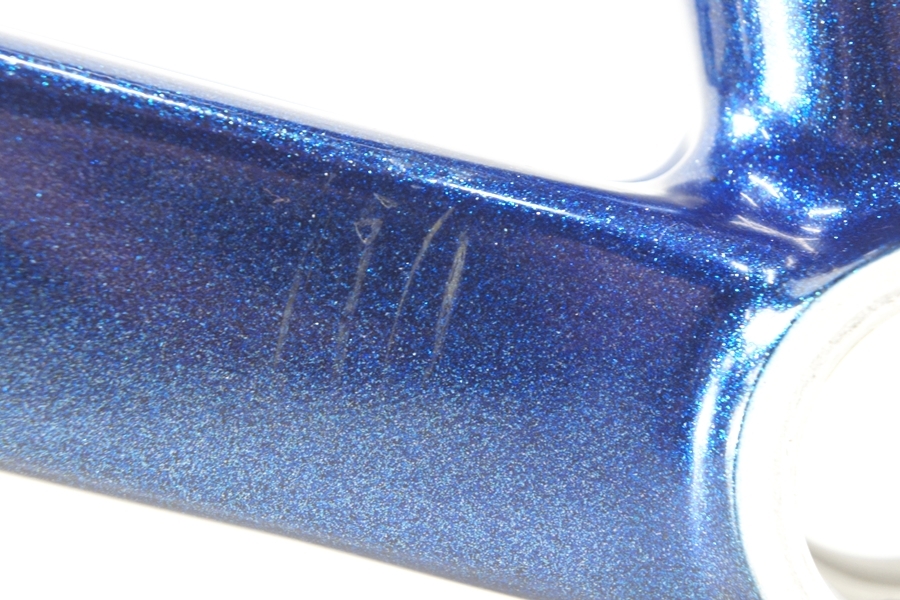 ヘッドパーツにサビ、右チェーンステー・シートステー・シートチューブ・トップチューブ右側など、フレーム各所にキズがあり、トップチューブのアウター受けフロント側が固着しており、全体的に使用感のあるお品物となります。