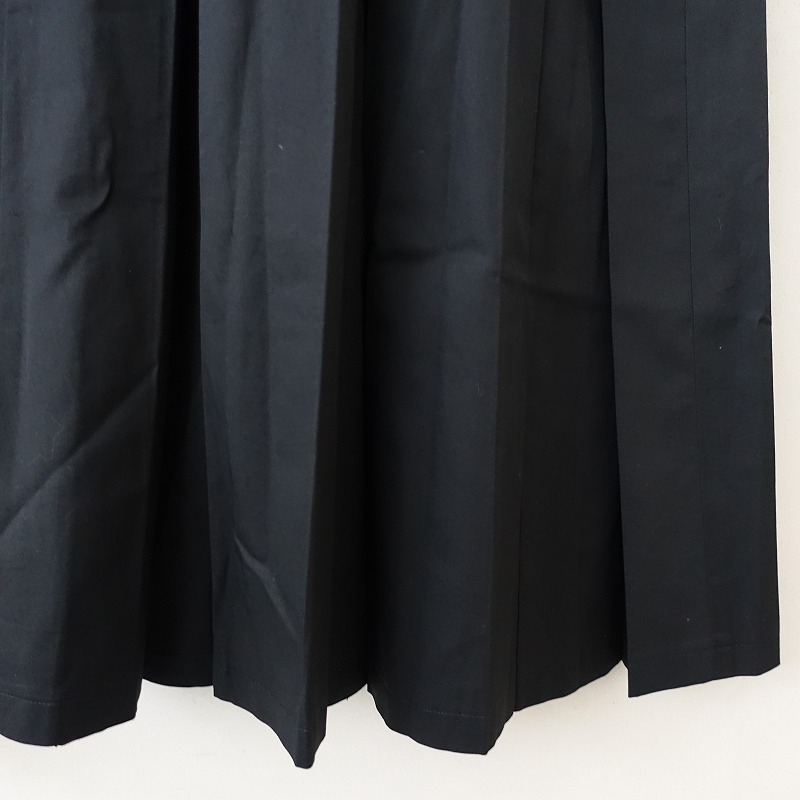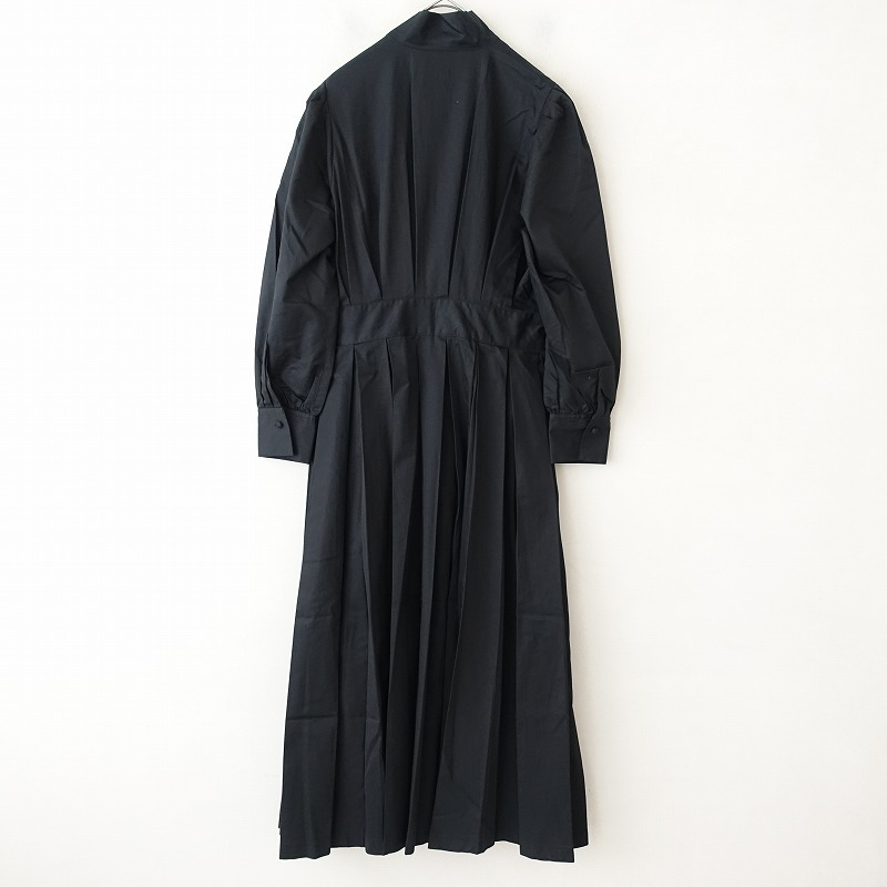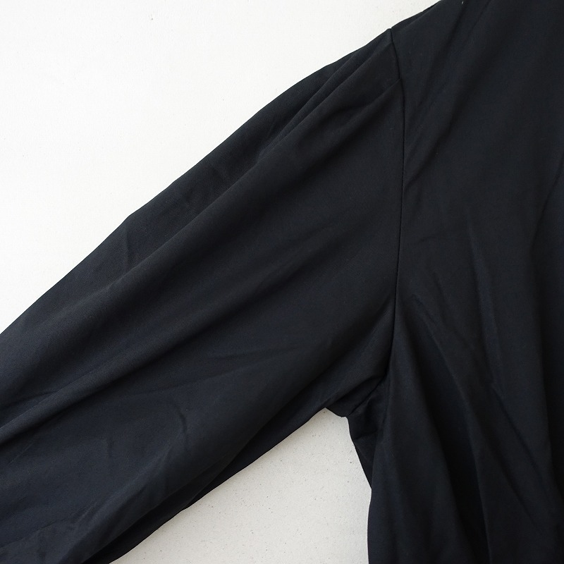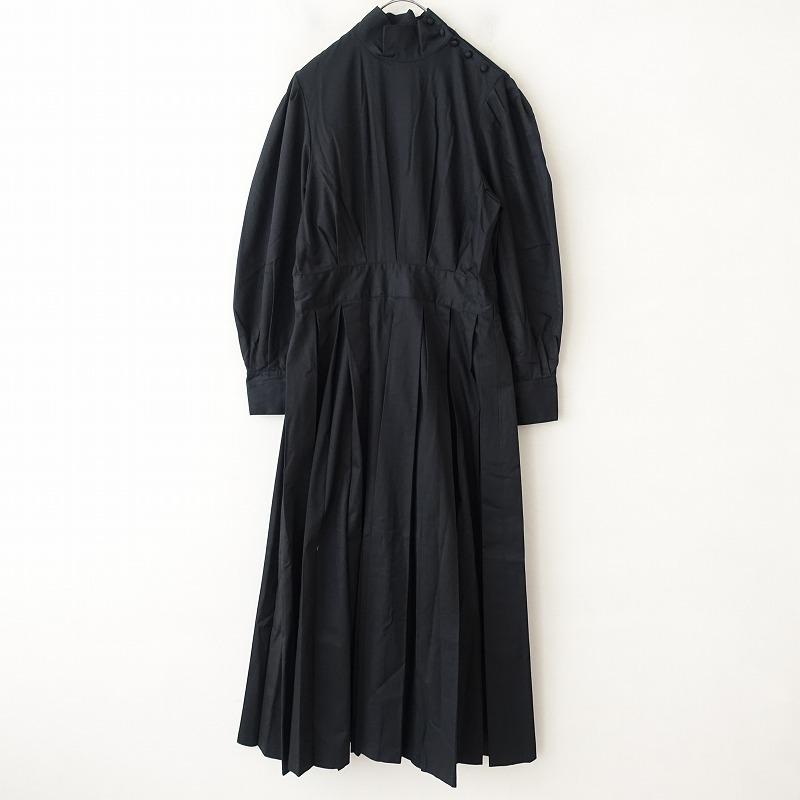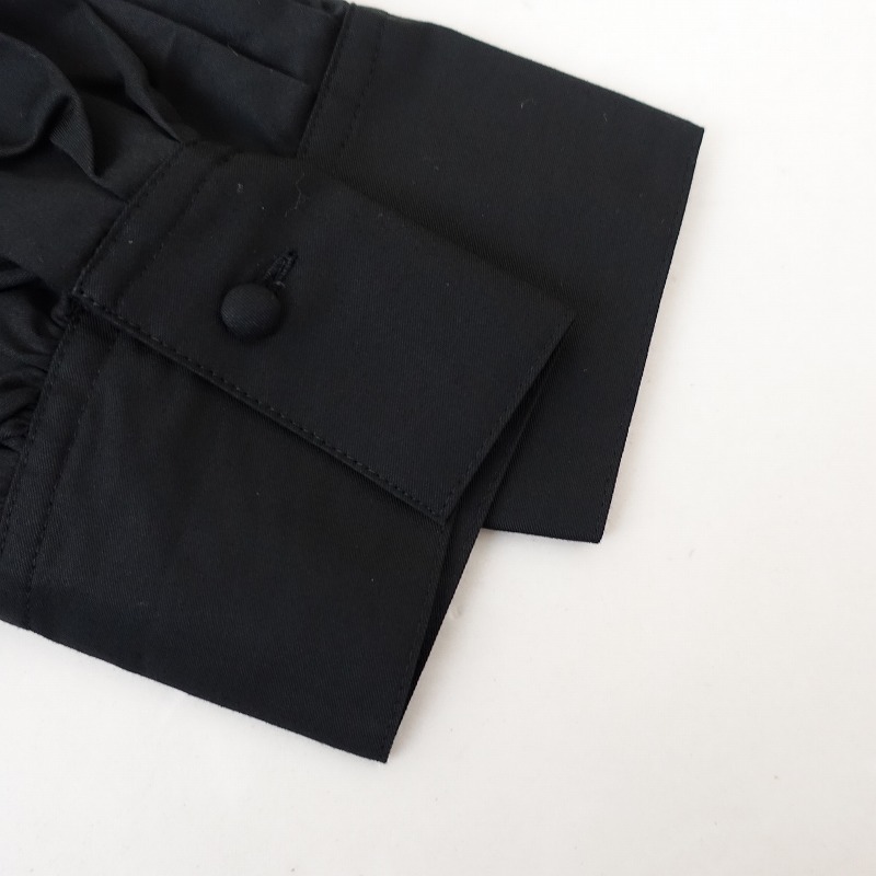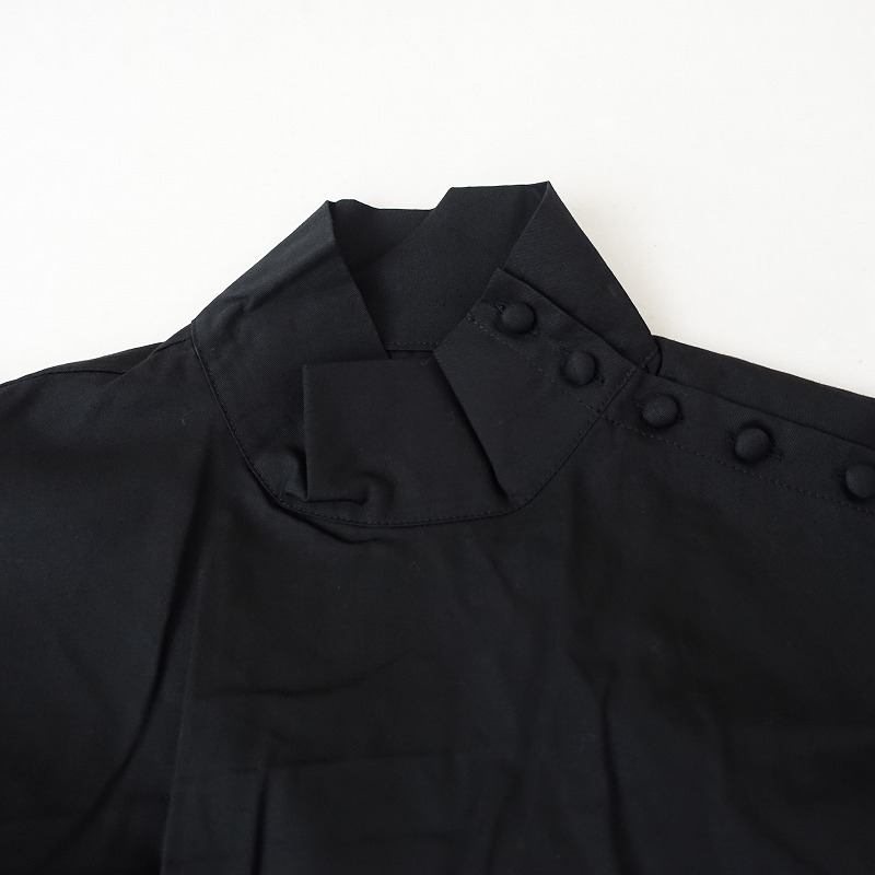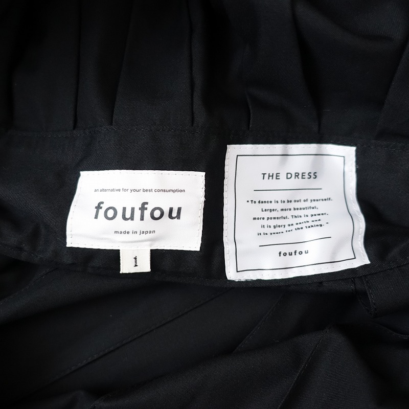 foufouのTHE DRESSです。カラーはブラックで、ツイル地です。ウエストボックスタック切り替えが施されており、袖付け部分にタック、袖口にギャザー入りです。左肩にボタン付きのプルオーバータイプで着脱でき、左サイドに着脱用ファスナー付きで、袖口はボタン留めです。ポケット・裏地は付いておりません。 |