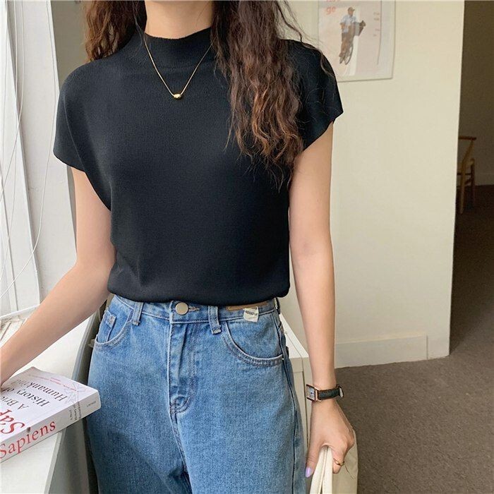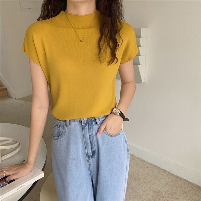 ハーフタートルネック ニット セーター レディース 春 夏 半袖 トップス アイスシルク スリムフィット シンプル サマーニット ニットトップス プルオーバー カジュアル お洒落 韓国ファッション