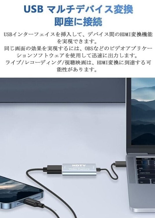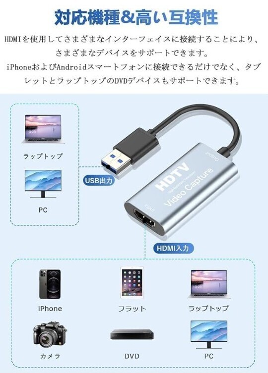 USB3.0 & HDMI 変換アダプタ HD画質録画 HD1080P/4Kパススルー機能 HDMI ビデオキャプチャー ゲーム録画/HDMIビデオ録画/ライブ配信用キャプチャー ボード 電源不要 小型軽量 低遅延 Switch/PS5/PS4/PS3/Xbox用サポート Windows 7/8/10 Linux OBS Potplayer YouTube Niconico Twitch対応