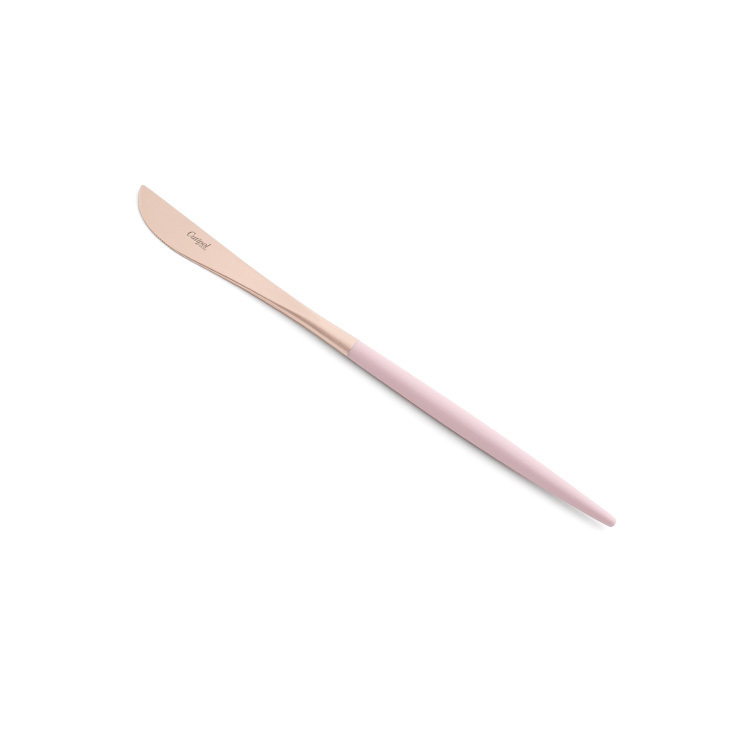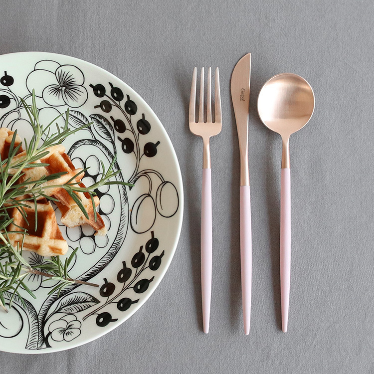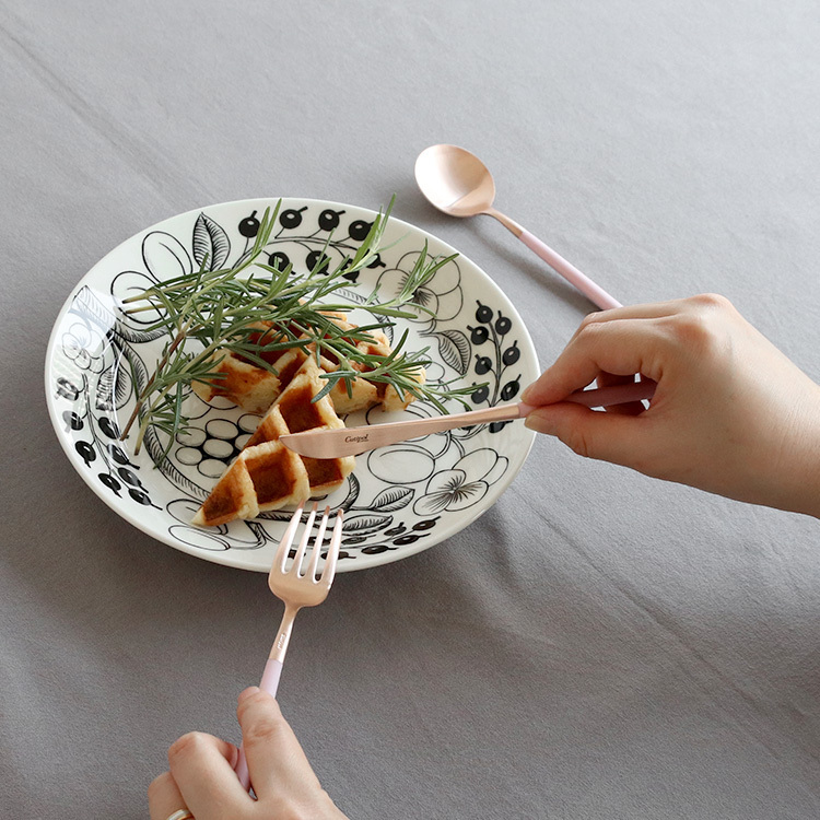| 備考 | 製作工程上、仕上げの段階で磨きをかけるため、未使用の場合、柄の樹脂の色が少し白みを帯びていますが、ご使用される中で色は徐々に濃くなります。 オリーブオイル等を塗付していただくと色が濃くなり、退色も防ぐことができます。 ローズゴールドのめっきには銅が使用されています。酸化や腐食を防ぐため、ご使用後はよく洗い、十分に乾かしてください。食洗浄機のスチーム洗いも避けてください。 |