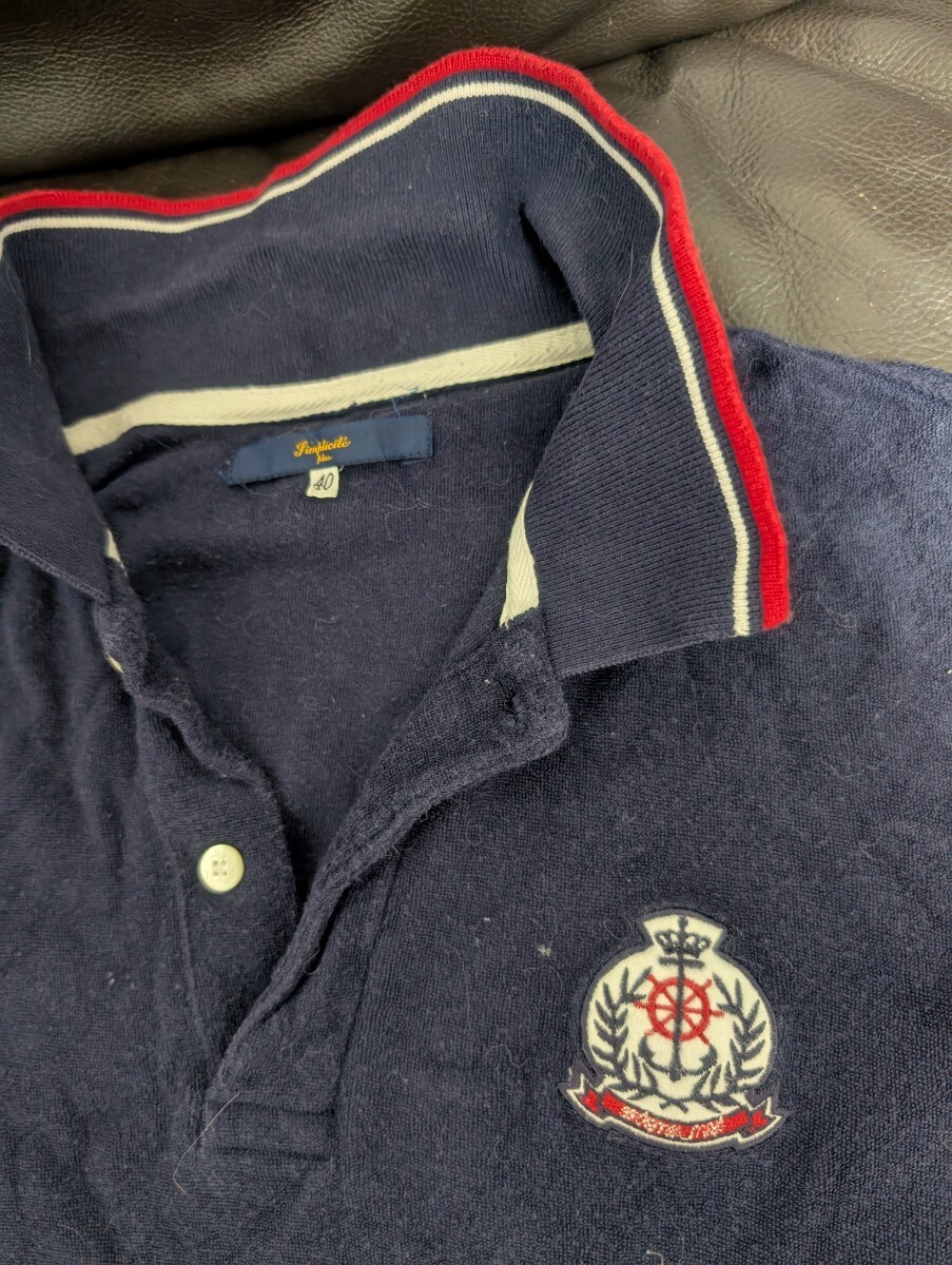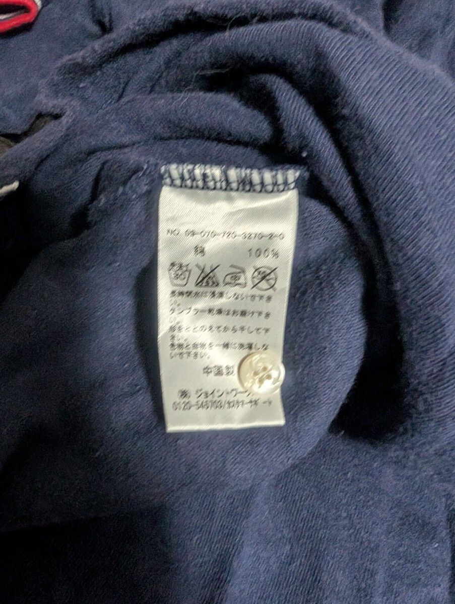 お色は、紺、襟、袖先が赤と白ライン、胸にワッペンが付いています。
