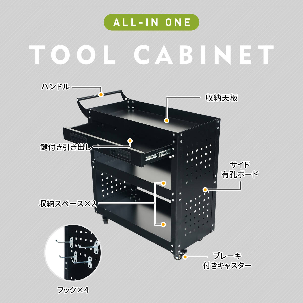 • ◎04【フック付き有孔ボード】両サイドの有孔ボードは、コンパクトながら高い収納力で、スペースを有効活用!付属の4個のフックで工具や小物を簡単に整理整頓でき、見やすく取り出しやすいデザインで作業効率を向上させます。