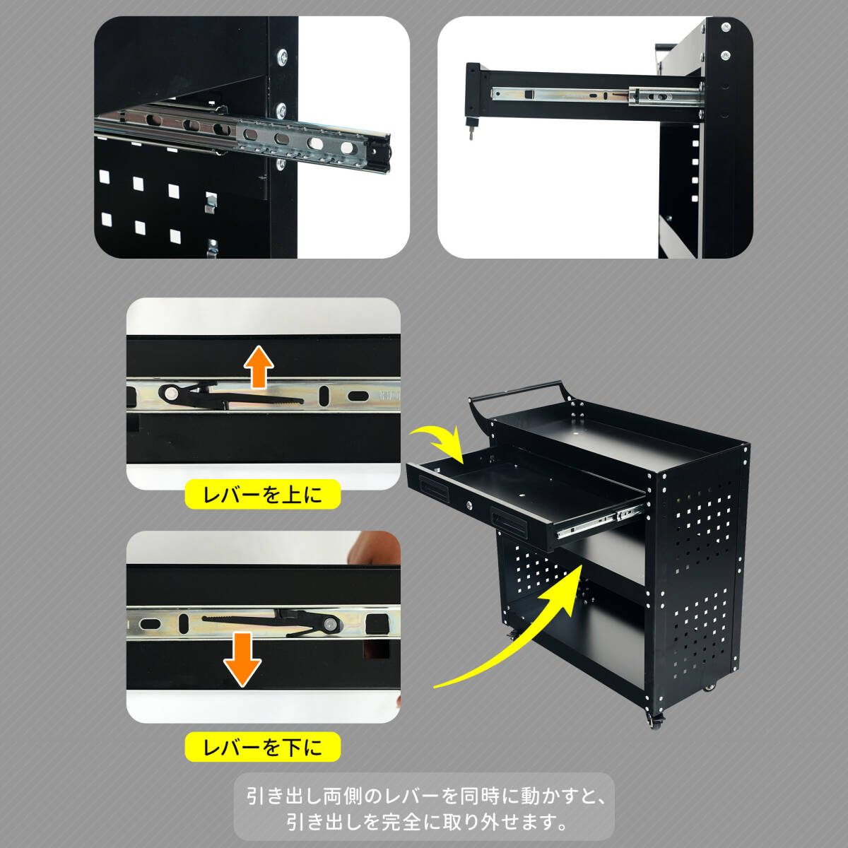 • ◎03 【鍵付き引き出し】頻繁に使う小型工具を種類ごとに整理可能。スムーズなスライド式で取り出しも簡単です!(内寸62*34*7cm) 高品質なスライドレールを採用しており、スムーズに開閉できます。引き出しを完全に取り外せます。【鍵付きで安心】引き出しには鍵が付いており、貴重な工具やアイテムをしっかり守るセキュリティ機能を提供します。