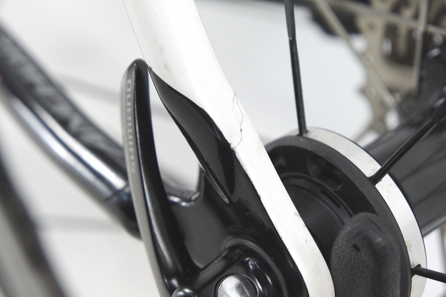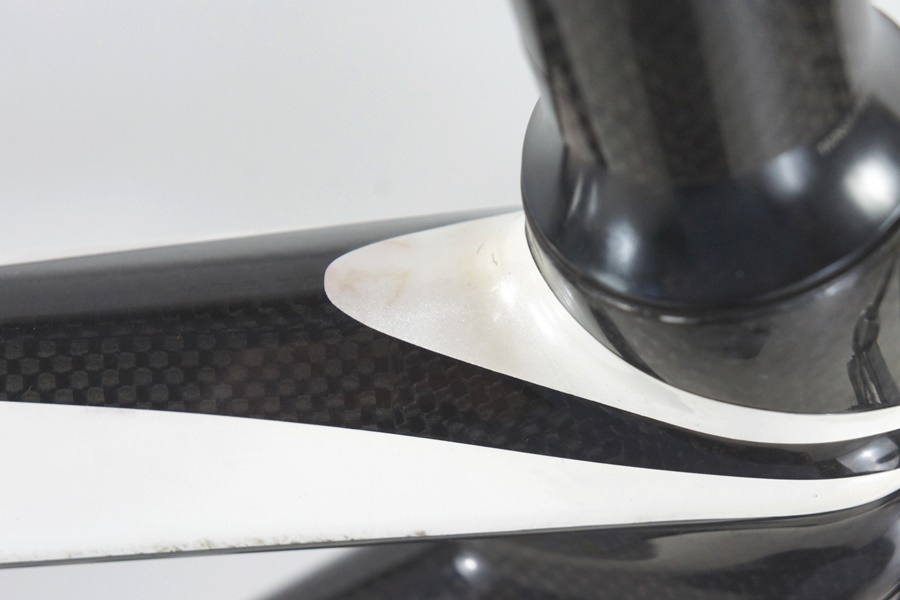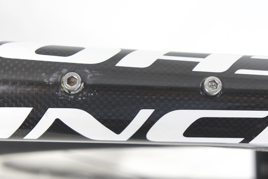 左リアエンド付近に塗装ヒビ、トップチューブ上面のヘッドチューブ側に変色、ボトルケージ取付け台座付近にクリア浮き、フロントディレーラーにサビ、その他車体各所にキズ・スレや細部に汚れがあり、全体的に使用感のあるお品物となります。