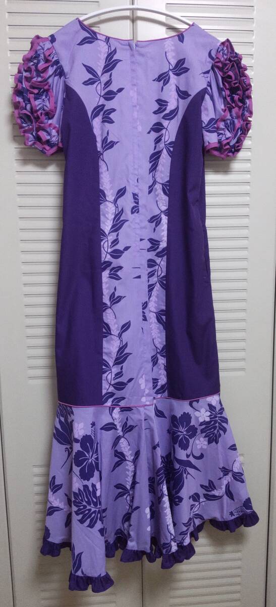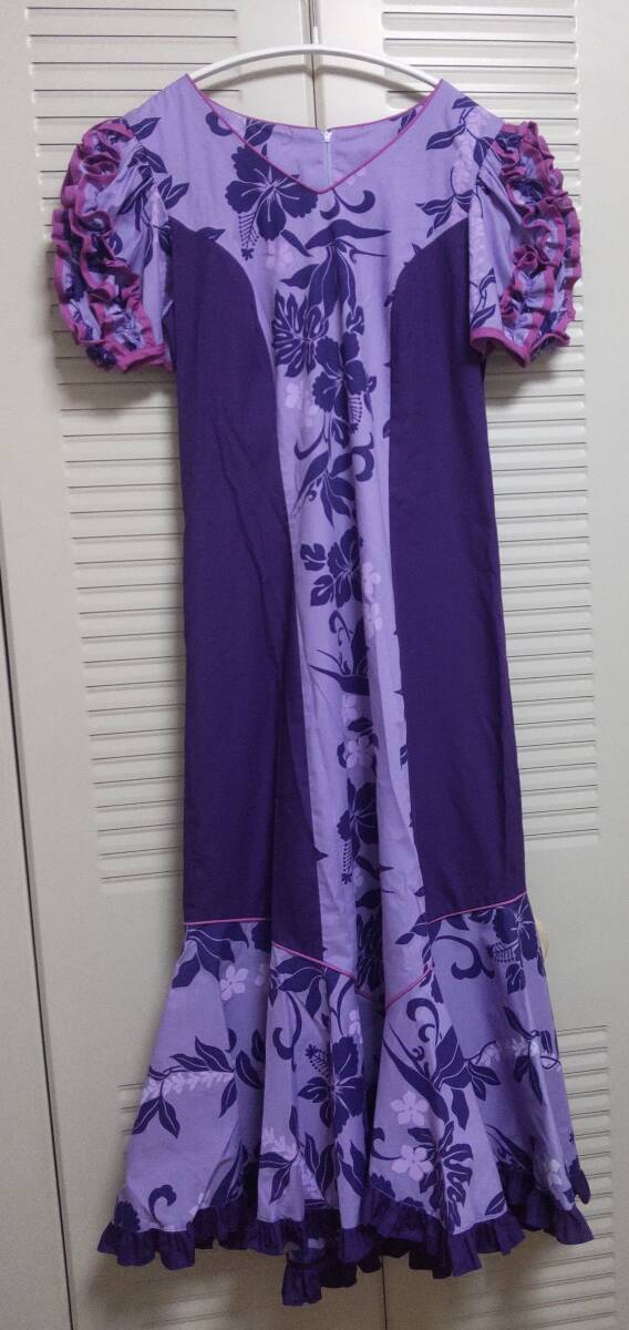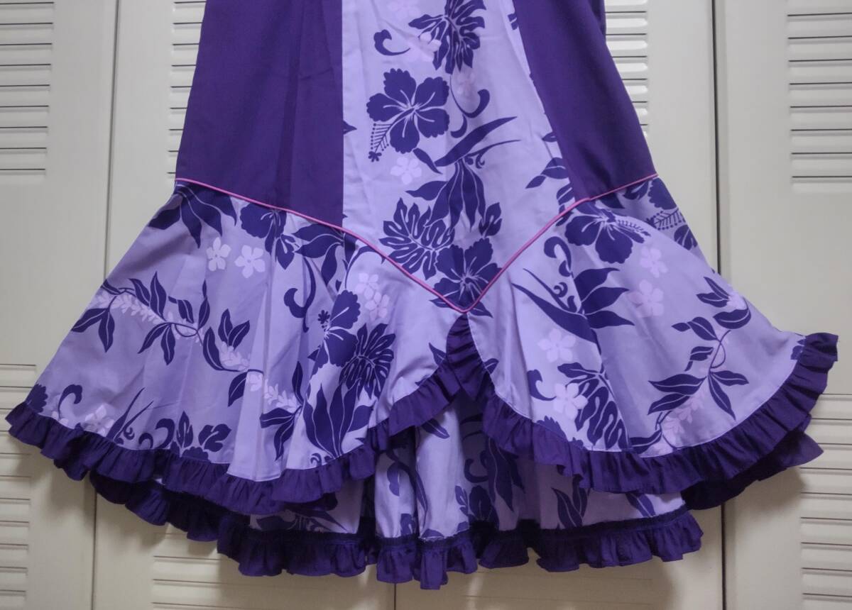 ハワイアンドレス☆ロングワンピース☆ムームー☆フラダンス☆ハイビスカス?×紫×フリル☆美品☆