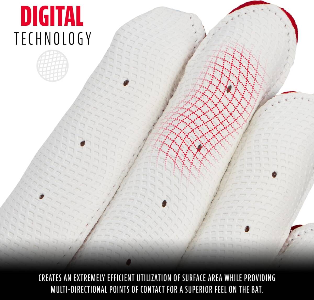 • DIGITAL TECHNOLOGY: Digital etching on the palm maximizes the surface area of the leather and provides multi-directional points of contact for enhanced grip and a superior feel on the bat