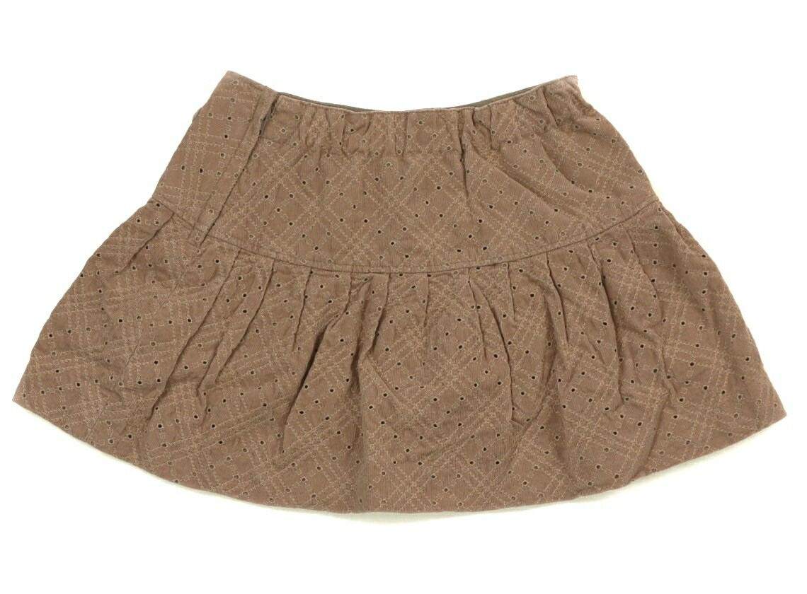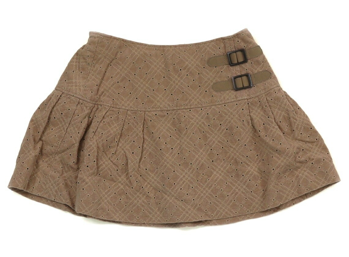 コール地。裏地付き。脇ファスナーあきで、ウエストにはサイズ調整ゴムが付いています。ベルト部分は人工皮革で、一部ひび割れています。
