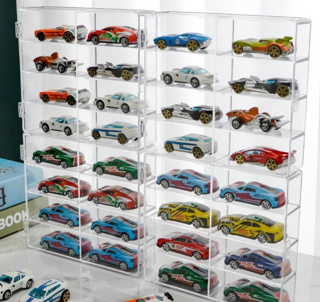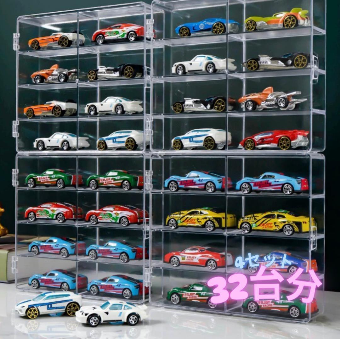 こちらは、1/64サイズのミニカーを最大32台まで収納できる、透明度の高いミニカー収納ケース【4個セット】です。シンプルかつ実用的なデザインで、コレクションを美しく・すっきりと整理したい方におすすめの商品です。
