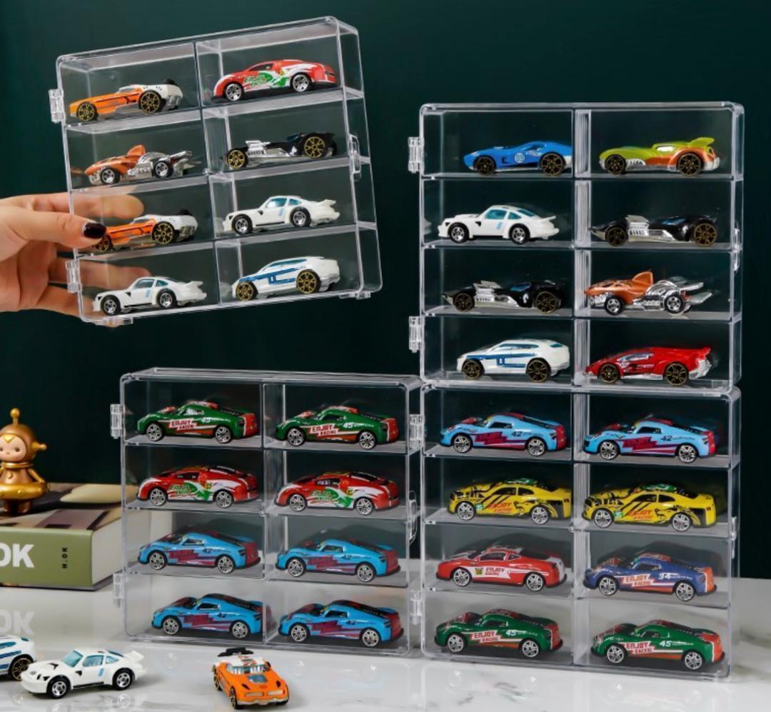 本商品はケース4個セットでの販売です。各ケースには8つのマスがあり、合計で最大32台のミニカーを収納可能。1/64サイズのトミカ(箱抜き)などに対応しており、サイズ感もぴったりです。