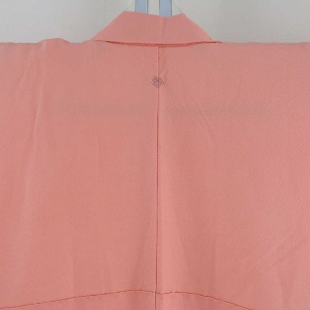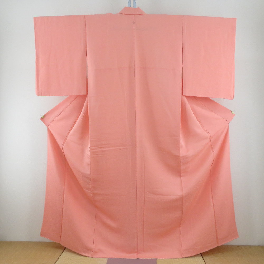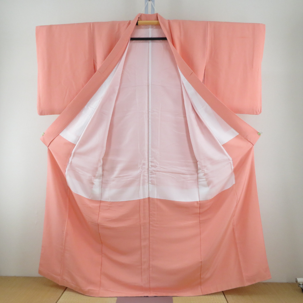 | 色無地 袷 サーモンピンク色 一つ紋 蔦紋 正絹 バチ衿 仕立て上がり着物 身丈160cm |