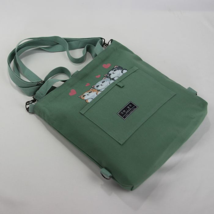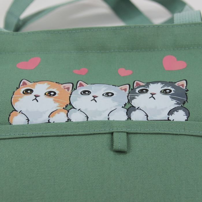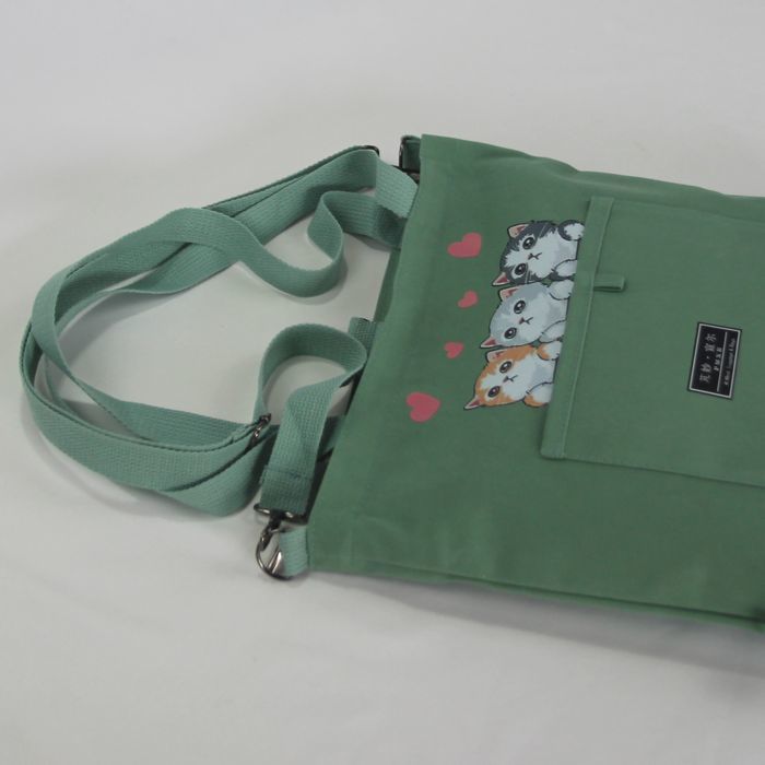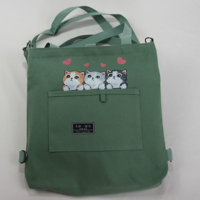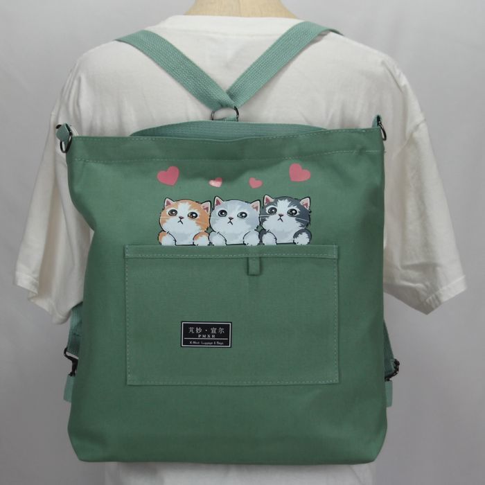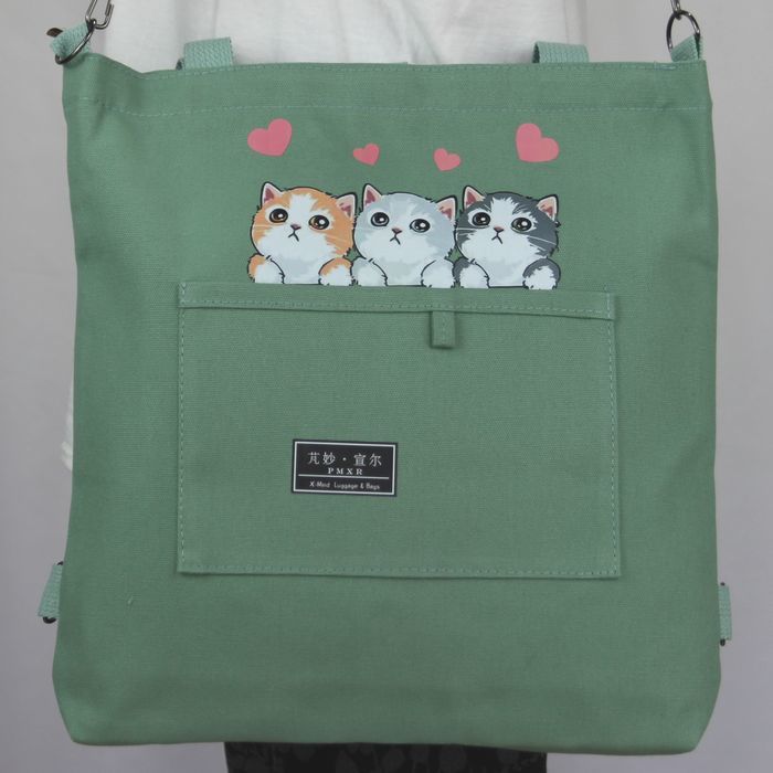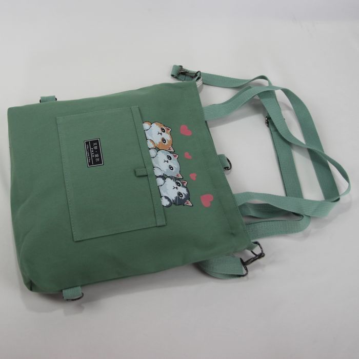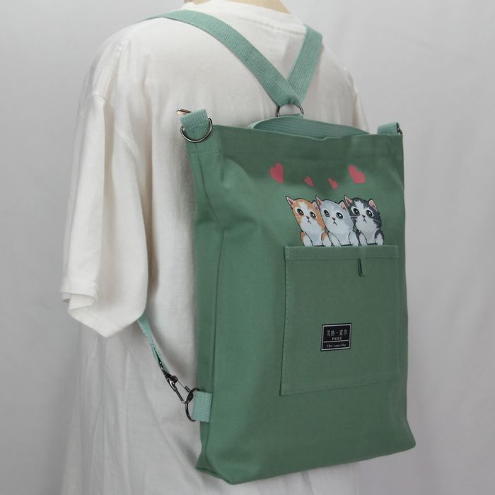 ★猫 猫柄 トートバッグ ショルダーバッグ リュックサック 3wayバッグ かわいい3匹のネコ 若草色 キャンバス ネコ柄 ファスナー プレゼント 普段使い レディース キッズ BA44