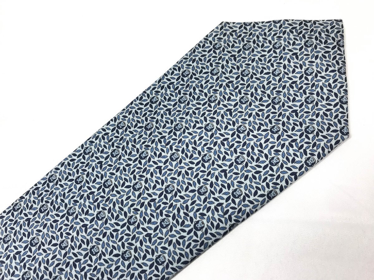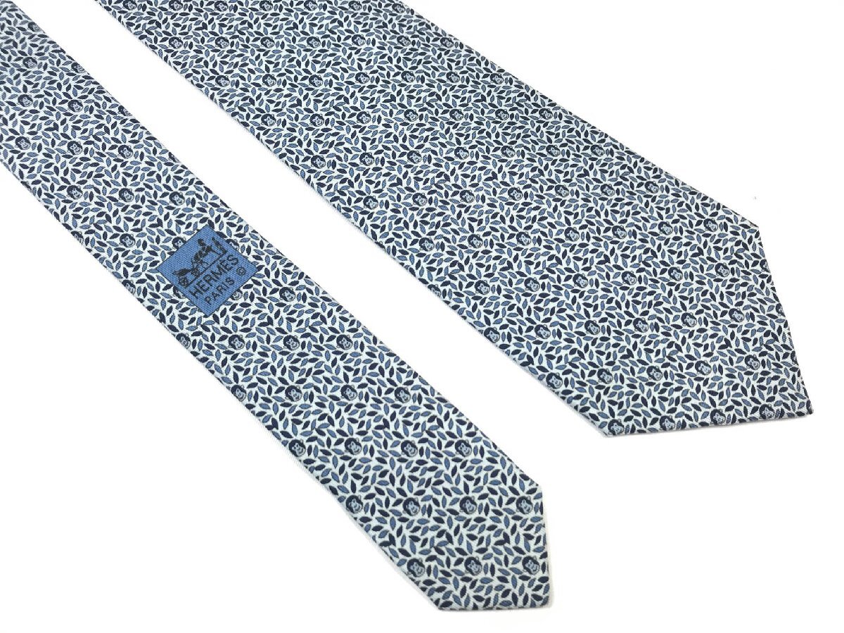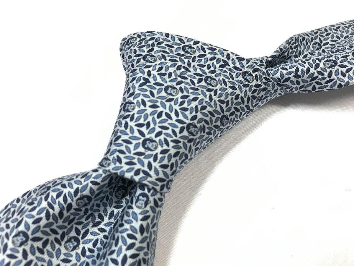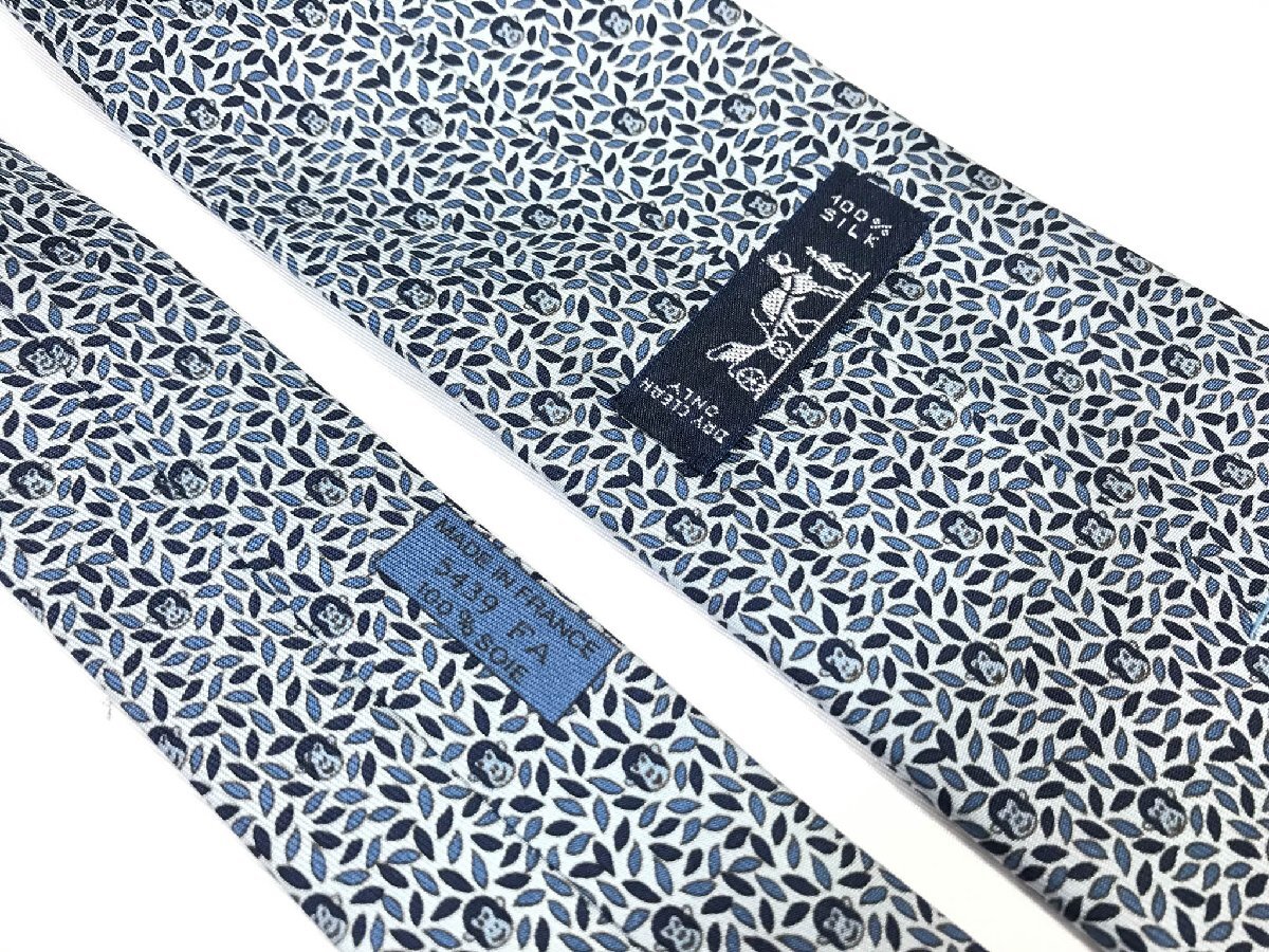 HH未使用 【エルメス HERMES】 ゴリラ×リーフ柄プリント♪ シルク ネクタイ (メンズ) ネイビー系 フランス製 ◯10ME7571◯