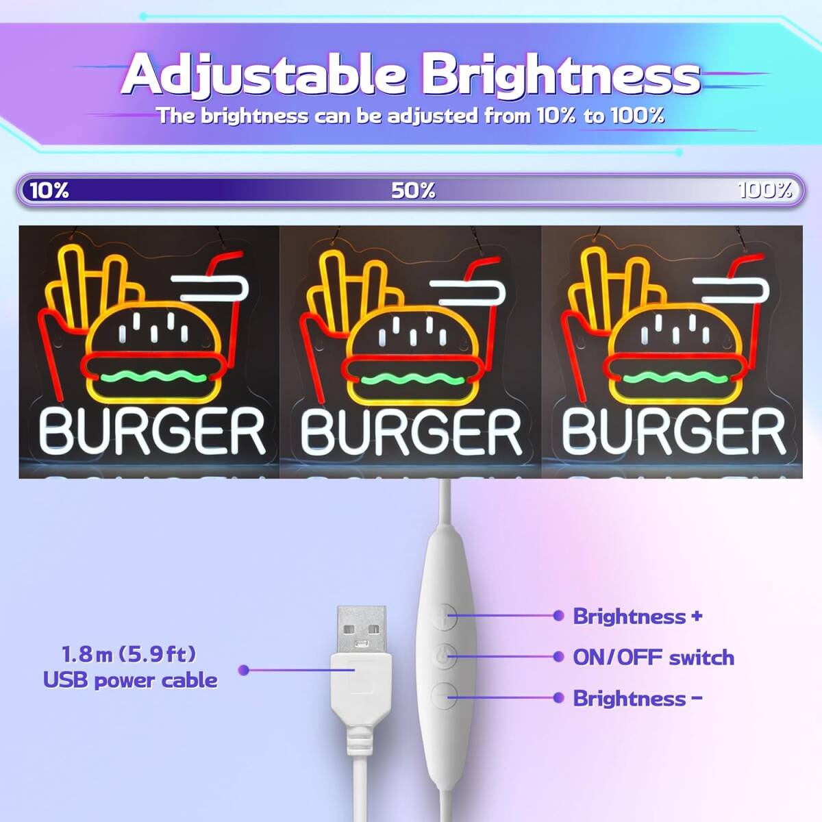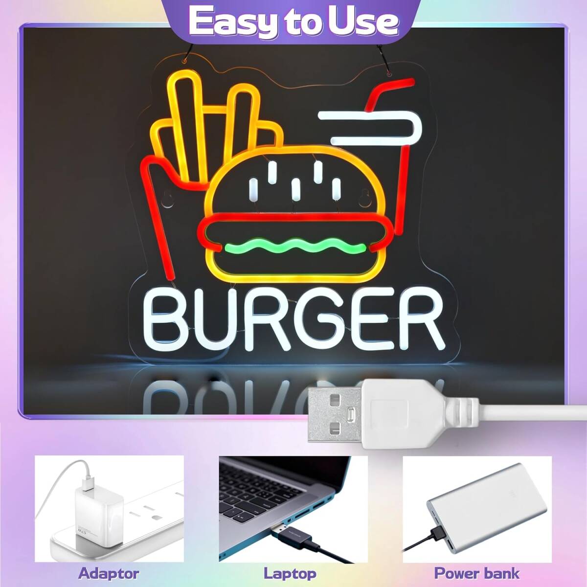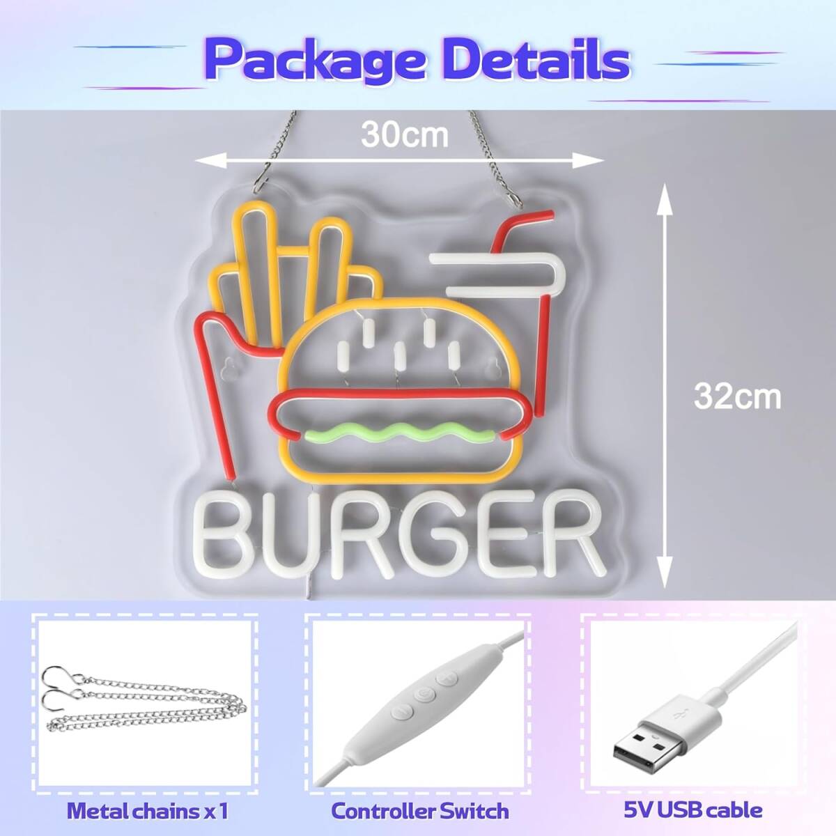 ネオンサイン ハンバーガー 洋食店ネオンライト標識看板 店舗インテリア 居酒屋 飲食店 LED ネオン管ライト USBパワード 32×30cm