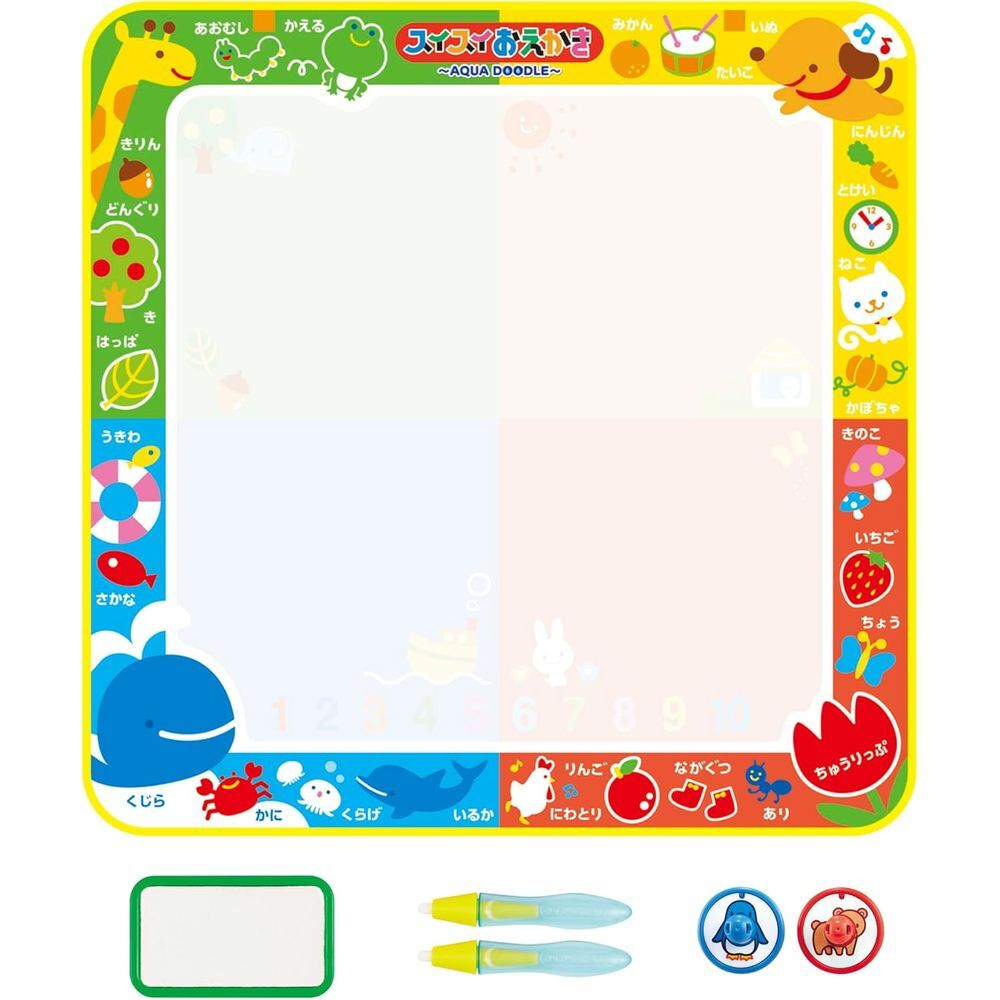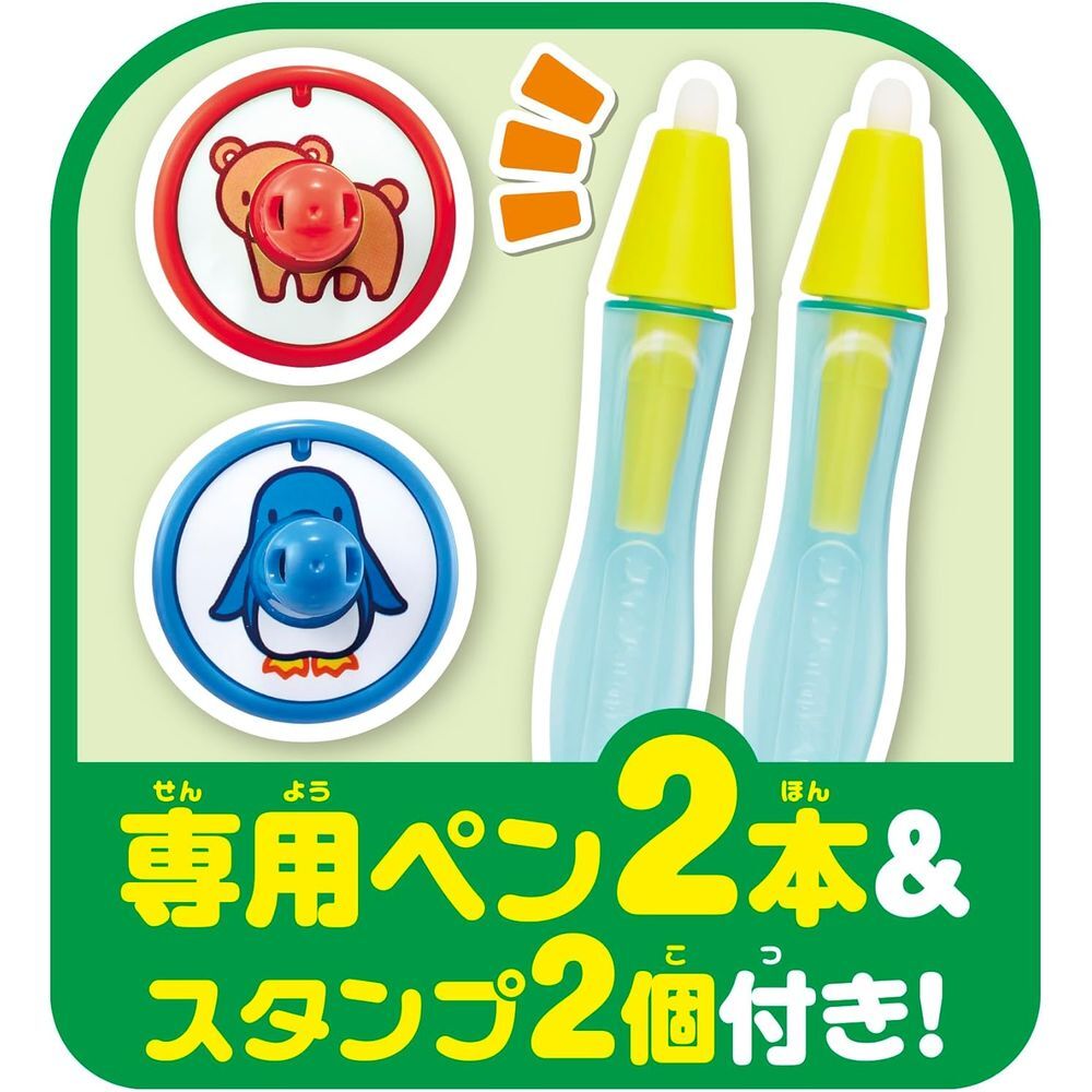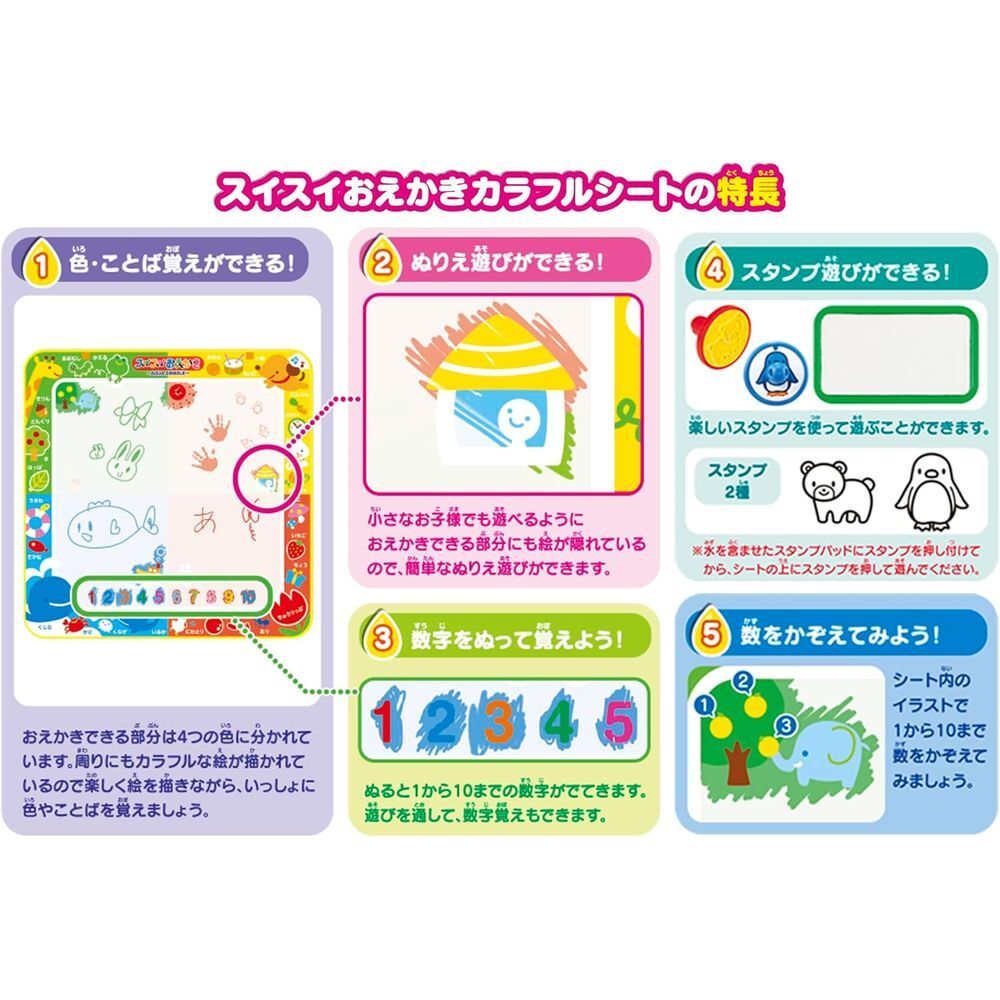・スイスイおえかきカラフルシートのペン2本&スタンプセットです。・水で描くから汚れない!乾くと消えるので何回でもおえかきできます!・人間工学に基づいた形状の持ちやすいペンで、はじめてのペン練習にもピッタリ。・4色で描けて、色・言葉・数字覚えもできるおえかきセット。