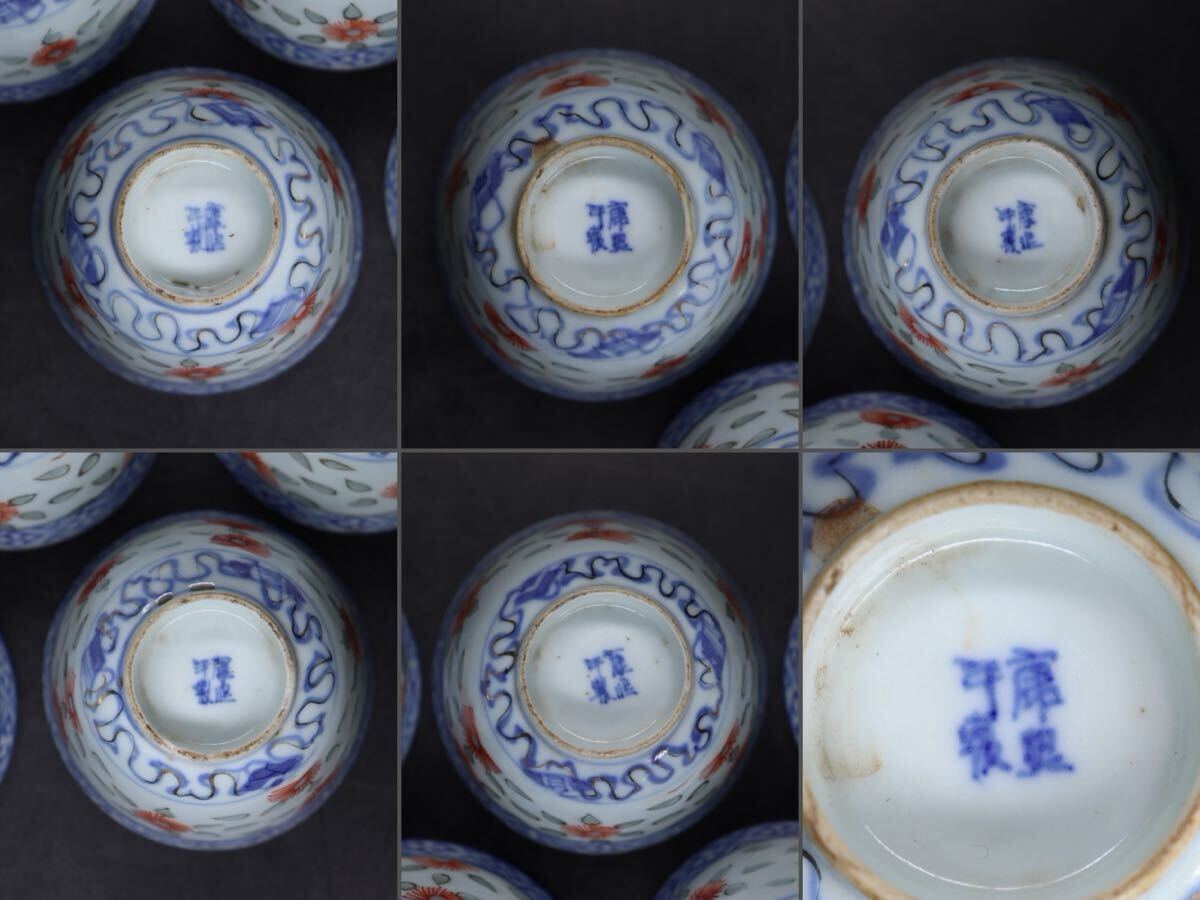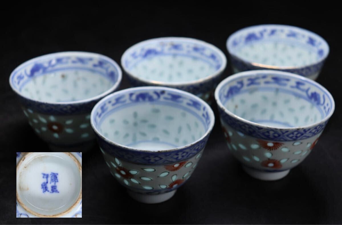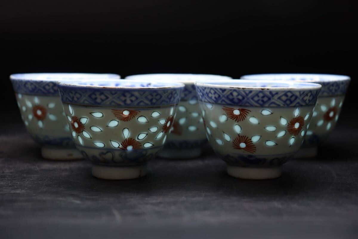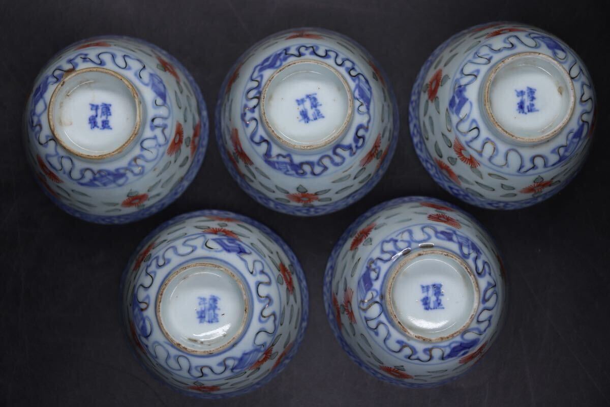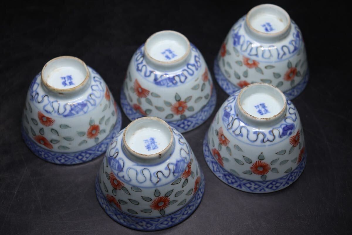 | 康熙年製 銘 蛍手 色絵 草花紋 煎茶碗 五客 / 清 康熙 中国美術 茶器 煎茶道具 .G1587 |