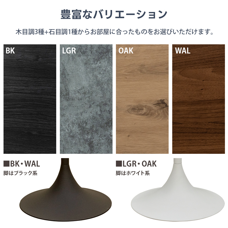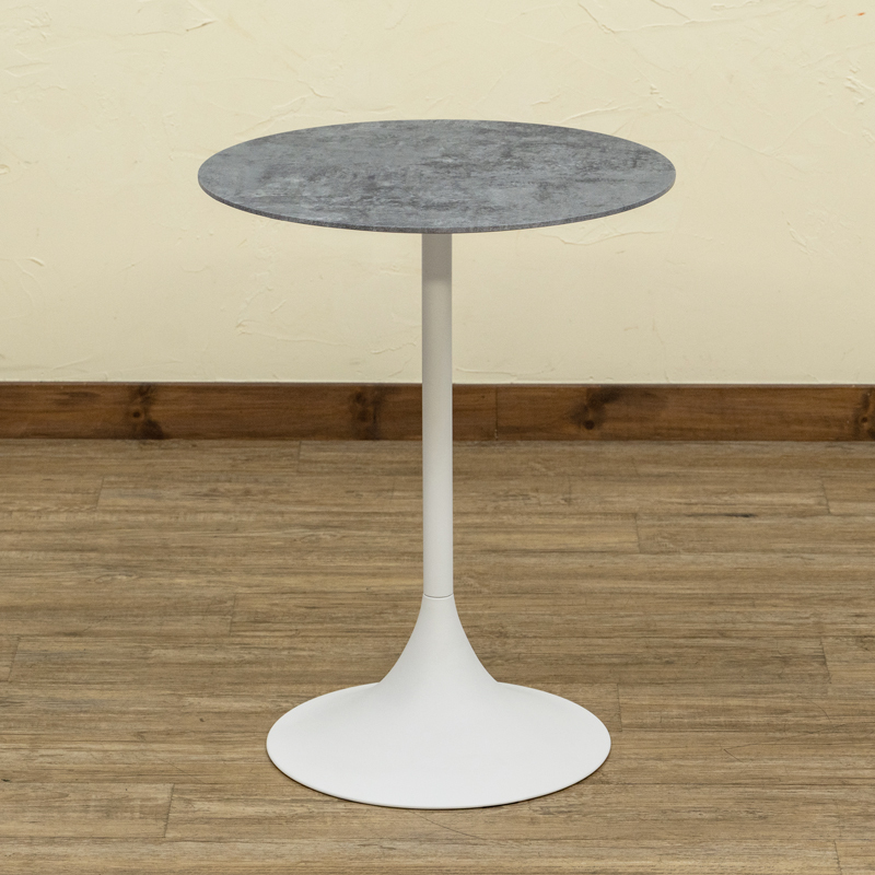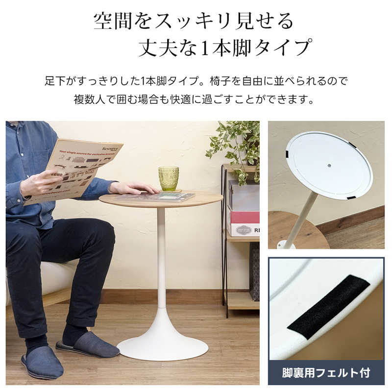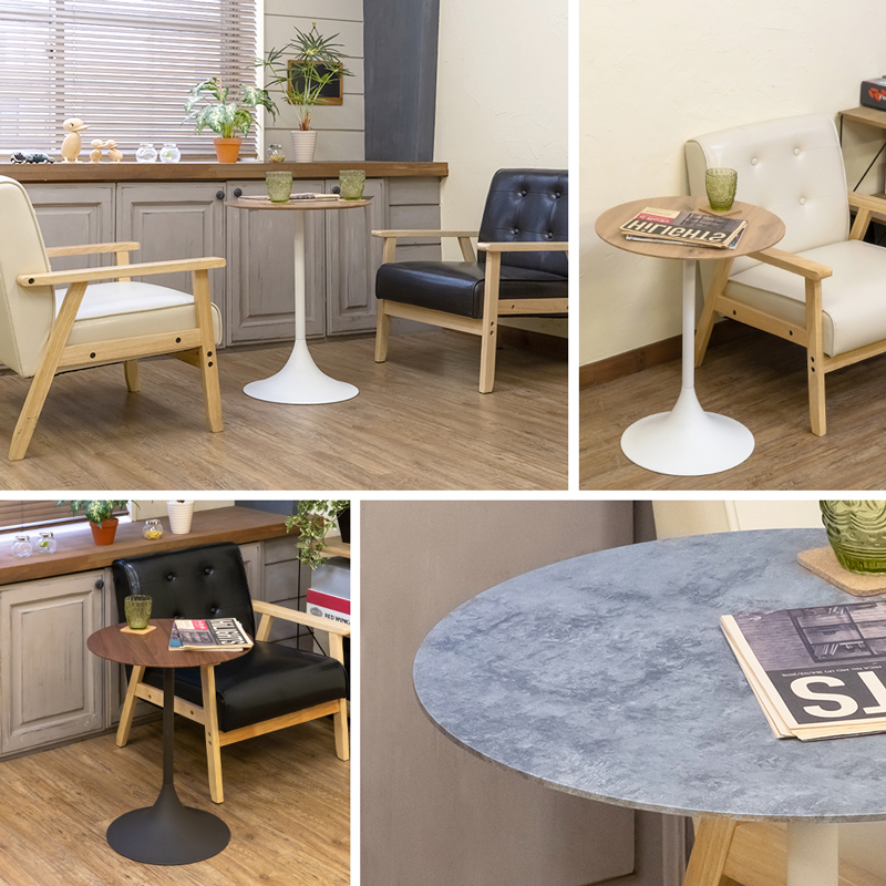 | 商品説明 | 組立品(15分)※工具不要 直径50cmの丸型天板が特徴のコンパクトなカフェテーブルです。 落ち着いたスチール製の脚部と、黒、コンクリート、木目柄(オーク、ウォールナット)の 選べる天板が、リビングスペースにおしゃれなアクセントを添えます。 高さ約65cmで、ソファーの傍らに最適です。 1本脚のスッキリしたシルエットと、様々な材質を再現した丸型天板が特徴のカフェテーブル。 幅50cmの手頃なサイズでチェアーとの間やソファー脇など多様なシーンで活躍します。 スラリと伸びた1本脚に丸型のベースで安定感もあり足下も広くなっています。 天板はPVC貼りで水分に強くお手入れも簡単。4種類の柄からお選びいただけます。 |