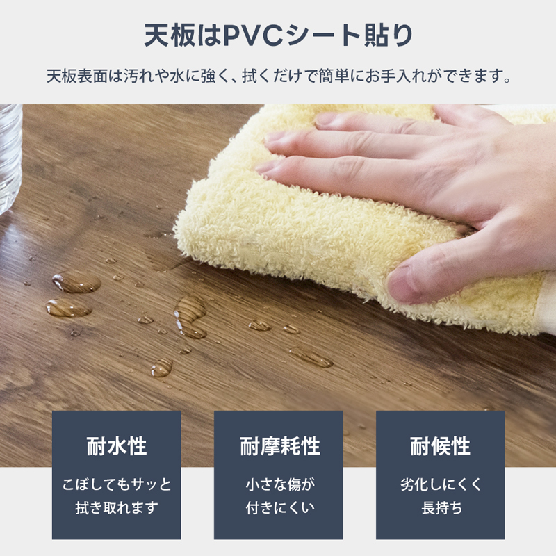 | 材質 | 天板:合成樹脂化粧繊維板(PVC貼り) ベース、支柱:スチール(エポキシ粉体塗装) 脚裏用フェルト付き |