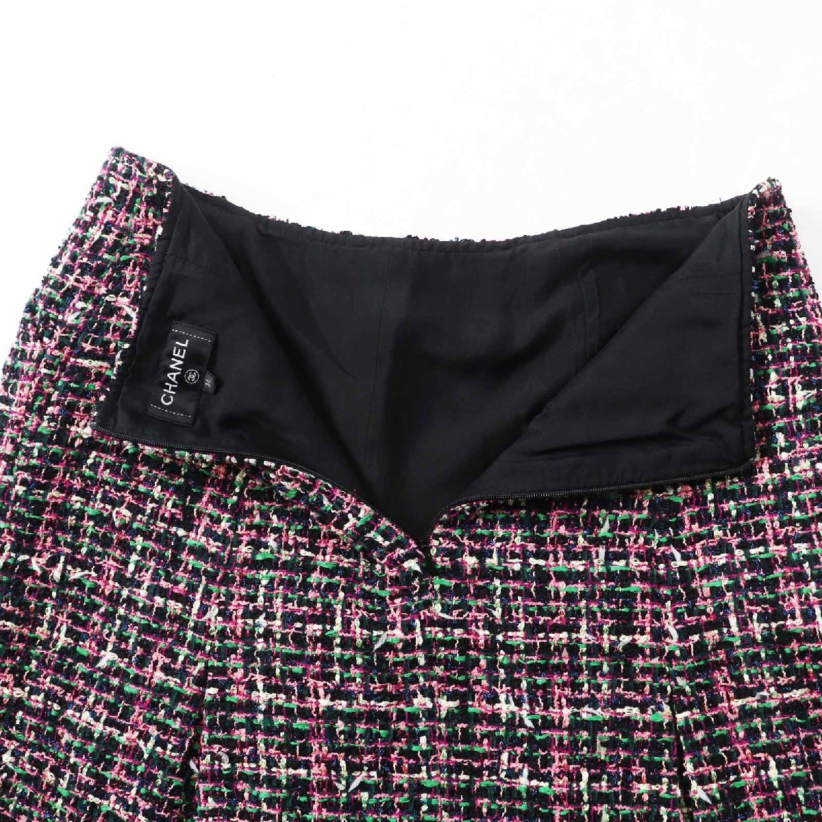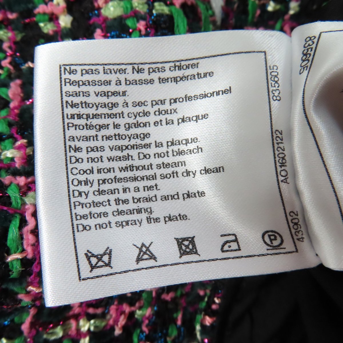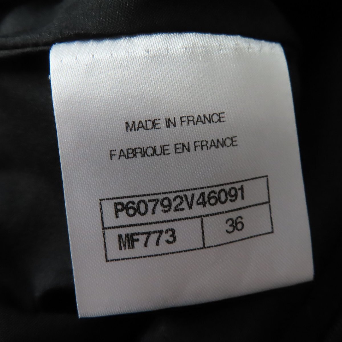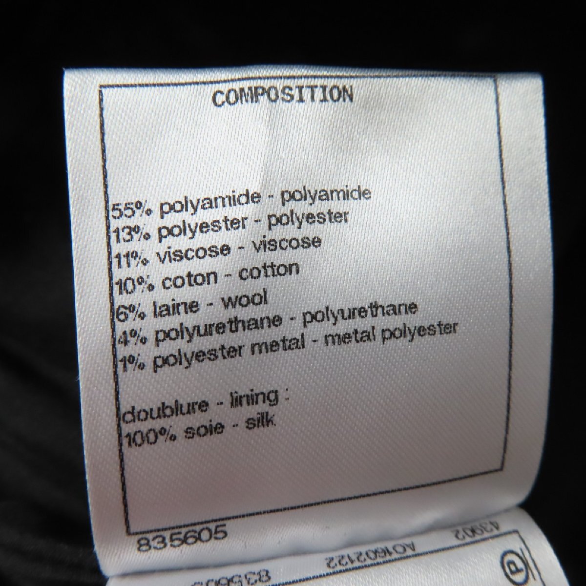 | 素材 (material) | 本体:ポリアミド55% :ポリエステル13% :ビスコース11% :コットン10% :ウール6% :ポリウレタン4% :メタル1% 裏地:シルク100% | ||||||||||||||||