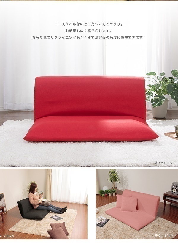 商品説明 | こたつにもあわせやすいロータイプのリクライニングソファ。 【仕様】 ■サイズ: 約幅1,000×奥行750~1,100×高さ120~450 ■座面高: [座面の厚さ]約120mm [座面奥行き]約555mm ■重量: 約7kg ■カラー: テクノブラウン・テクノブラック・テクノピンク・ダリアングリーン・ダリアンレッド・デニム調インディゴブルー ■材質: [表生地]ポリエステル100% [中身]ウレタン・スチールパイプ ■特長: 背は14段階リクライニング ■生産国: 日本 |
