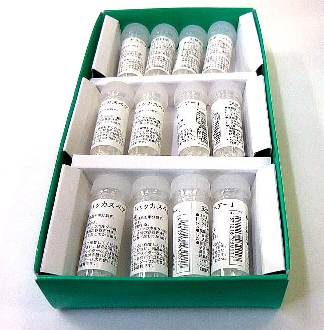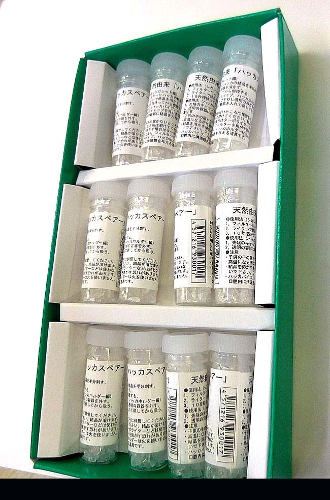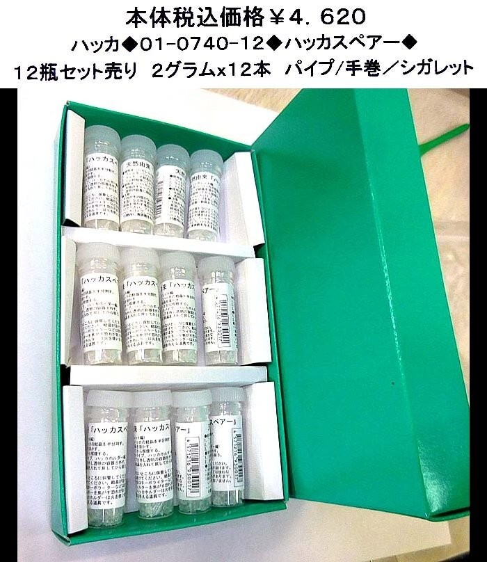 現物を写真撮影、お手元にこの写真の品が届きます。12瓶価格です!!1瓶¥385x12瓶=¥4.620→1箱12瓶入¥3.927。シガレット等にも使用出来ます。食品扱いのハッカです。色んな使用方法がありますのでご利用下さい。使用方法。手巻きタバコを作るとき、巻紙にフィルターを乗せ、フィルター寄りに粒結晶を1かけら置き、タバコ葉を詰めてゆきます。または、タバコのフィルターの上に1粒置き、ライターの火を遠火にして結晶を溶かして下さい。色んな使用方法がありますのでご利用下さい。1瓶2グラム入x14瓶=28gです。ビンゴが出品している全ての商品は、店頭販売、他オークション販売、ショッピング販売等重複し販売しております。時間差で売れ切れや、出荷点検検等で傷が付いていたり破損している事もあります。従いまして、お買い上げ頂きましても出荷出来ない場合も有りますので、予めご了承の上お買い求め下さい。尚、同じ型の商品が取り寄せ可能の場合は、改めてその旨お伝え致し、ご了承の際は数日お待ち頂く事になります。天然素材で作られているマドロスパイプ等は同じシェープでも木目が違いますのでご了承下さい。ご注文商品は他商品と同梱配送出来ますので、何個ご注文されても送料は1口分です。1.レターパック発送 ¥600 日時指定不可。(郵便レターパック)。2.宅配便発送税込み ¥880日時指定必須(沖縄/離島は別途価格)。必ず 受取日時 をご指定下さい。(例:15日 18~20 時必着)再配達防止の為。 (業者は当社にお任せ)。3.代金引換発送引手数料税込み ¥1、210 日時指定必須(沖縄/離島は別途価格)。 必ず 受取日時 をご指定下さい。(例:15日 18~20 時必着)再配達防止の為。(業者は当社にお任せ)。
