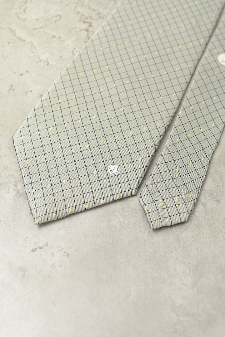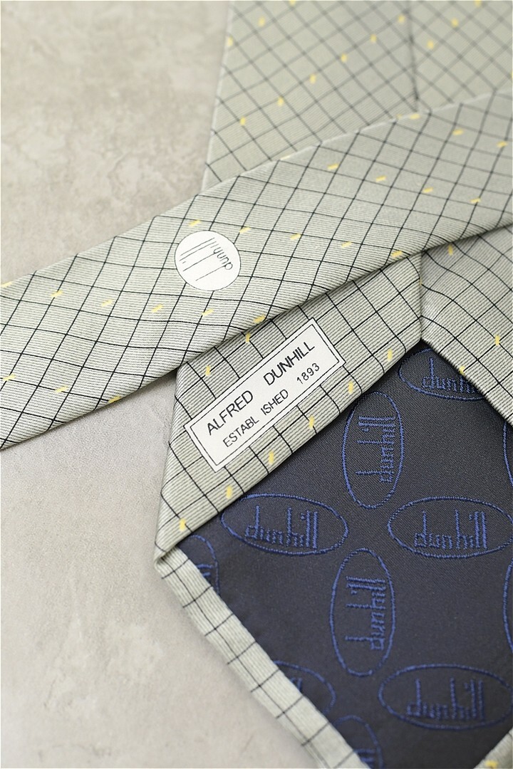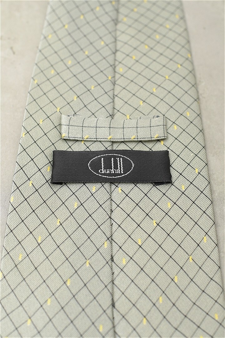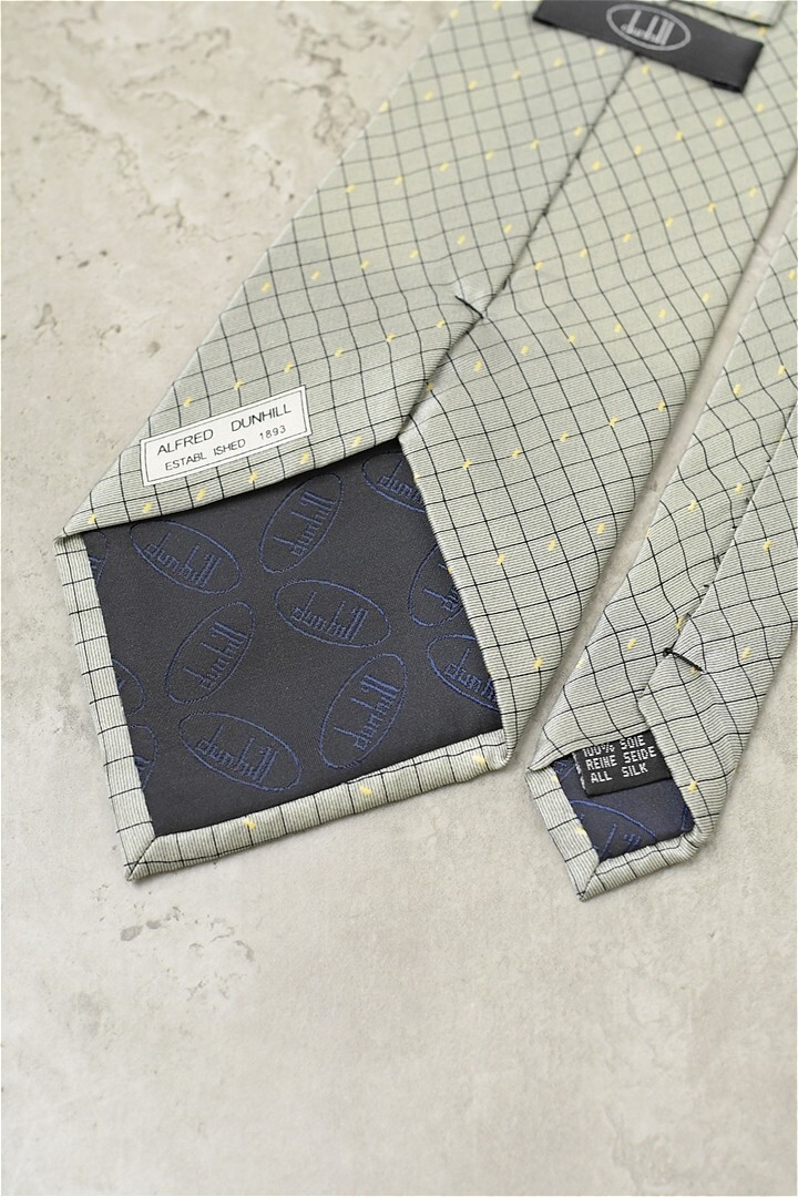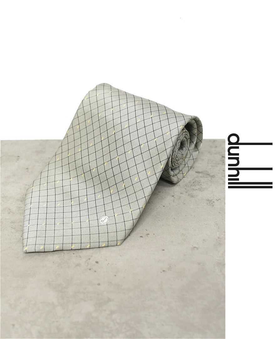 Y123/美品 ALFRED DUNHILL ネクタイ ワイドタイ 剣先幅10cm シルク 総柄 チェック ストライプ ロゴ 光沢 グリーングレー モスグレー