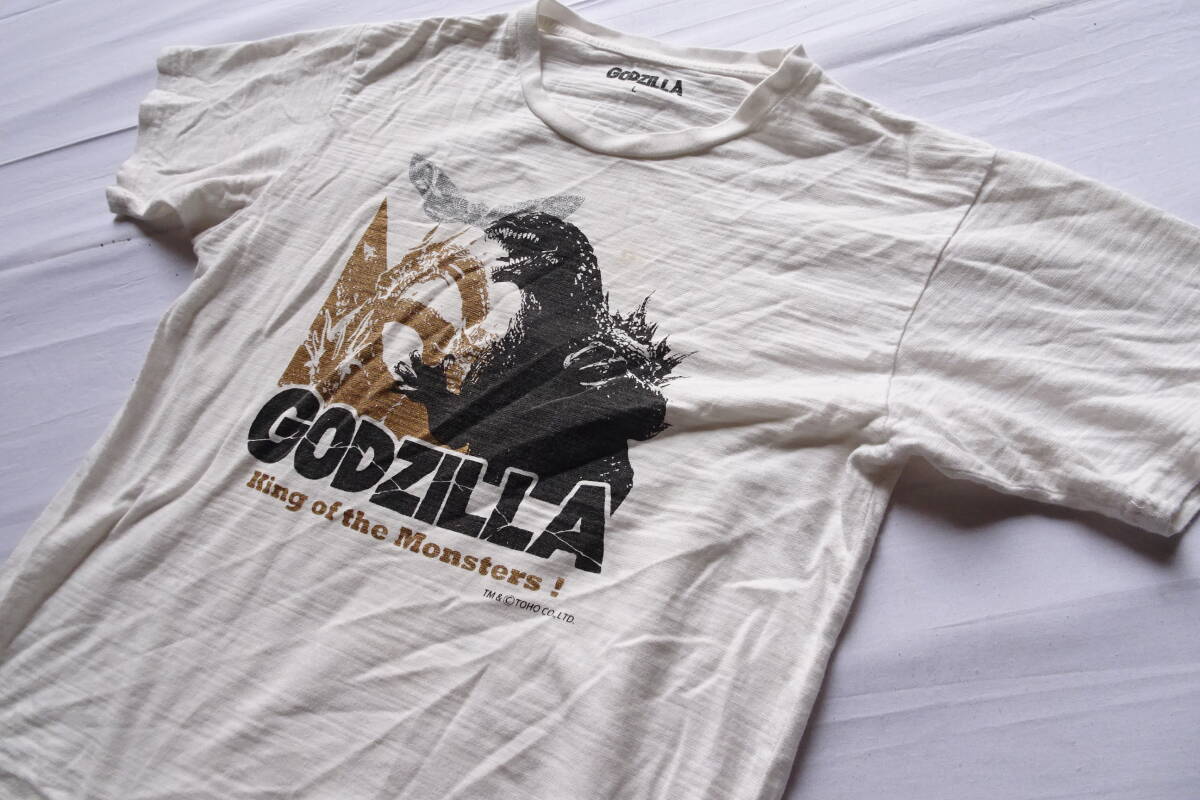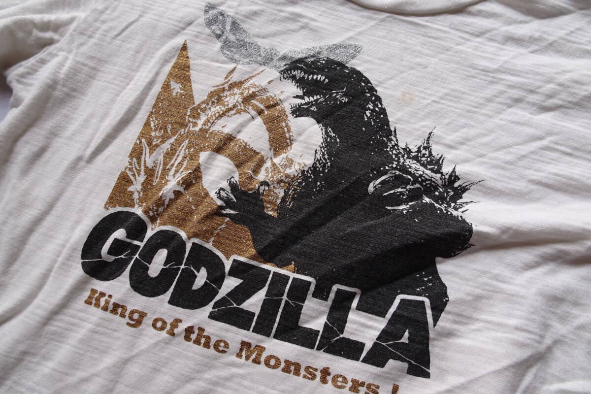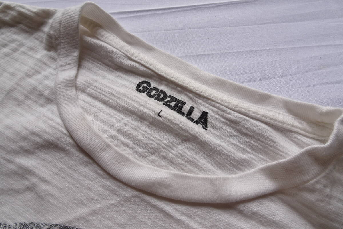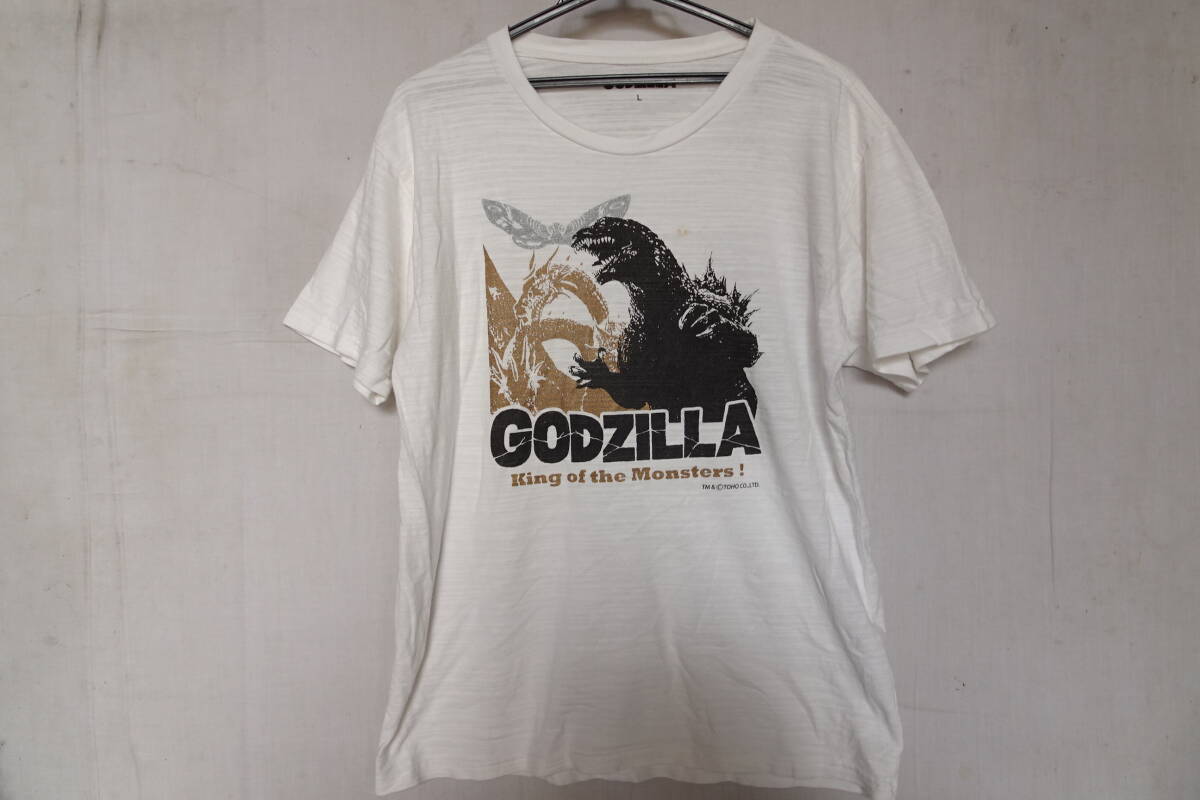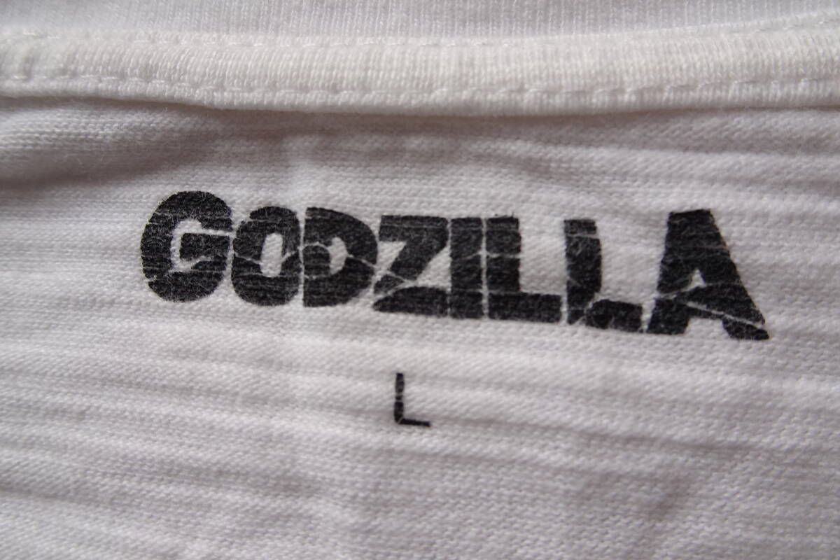GODZILLA/ゴジラ/半袖Tシャツ/フロントプリント/東宝シネマ/映画/横にスジの入った生地/白/ホワイト/Lサイズ(5/26R7)