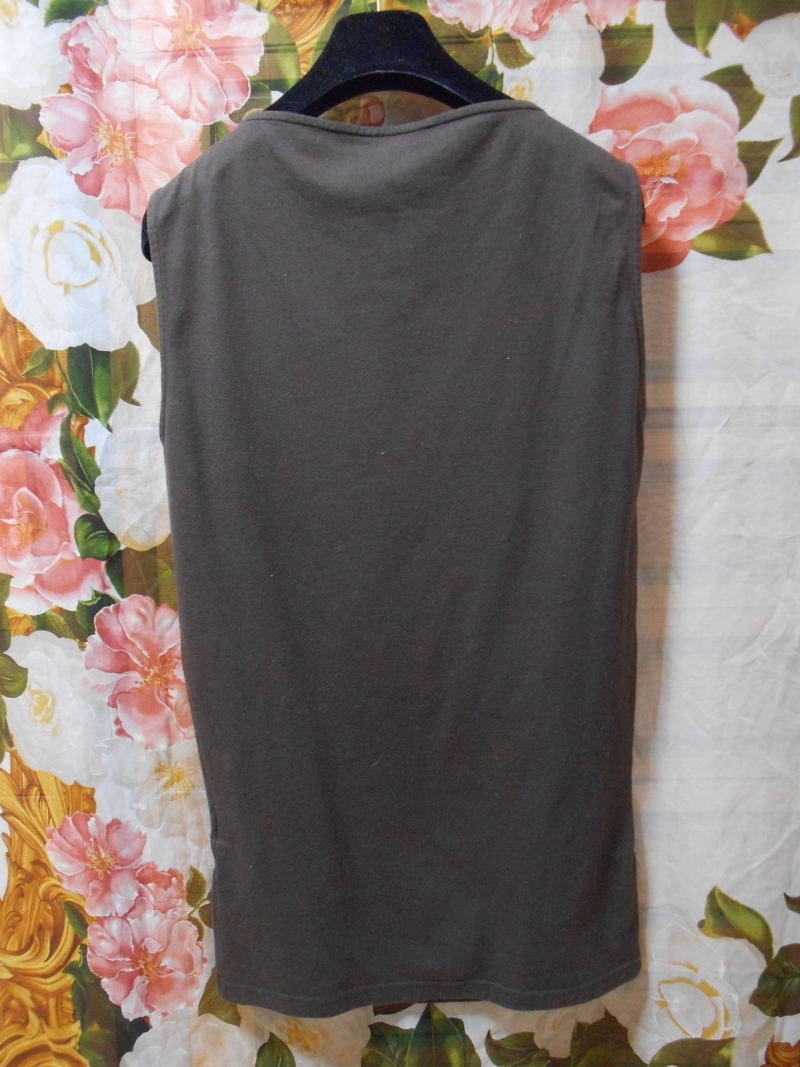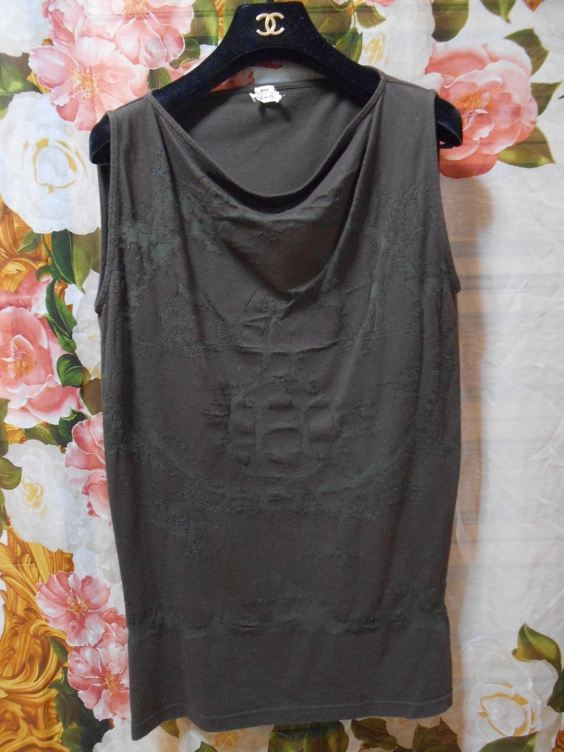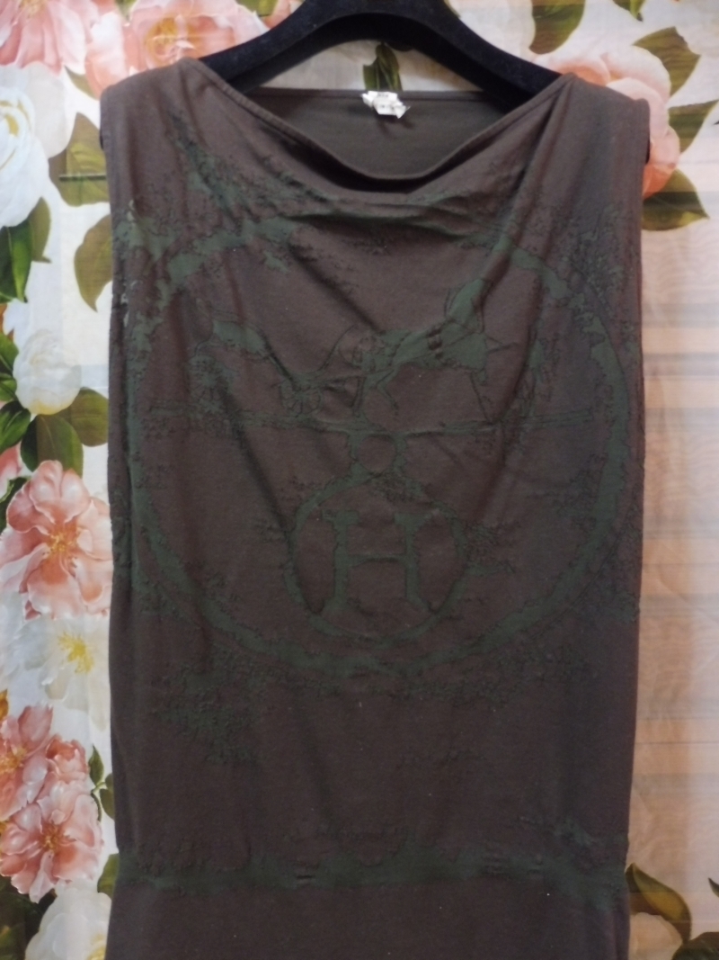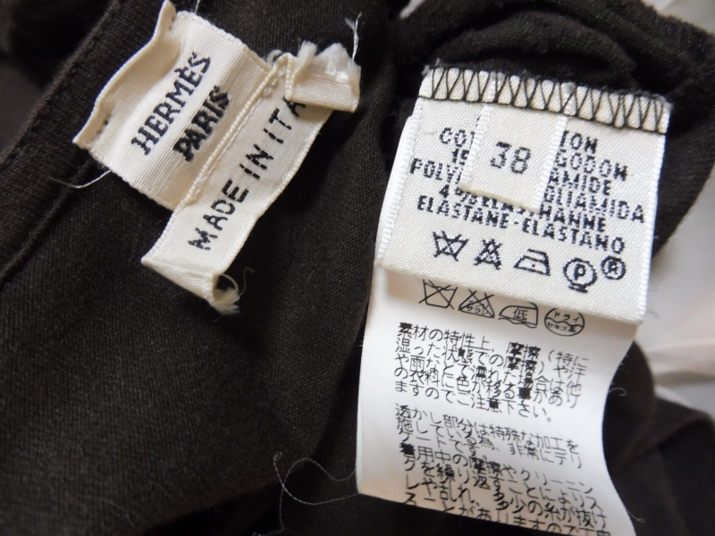 エルメスのスペシャルトップス。素材表記コットン81%、ナイロン15%、エラスタン4%。サイズ表記38。平置き採寸は肩の端から端まで39㌢、腕下身幅45㌢、着丈60㌢。ブラウンカラーの地にカットレース調でデユックとタイガのグリーンカラーエルメスマーク。ボートネック。タンクトップともフレンチスリーブともとれるデザイン。イタリア製、国内正規品。参考価格19万円。5回未満使用品。