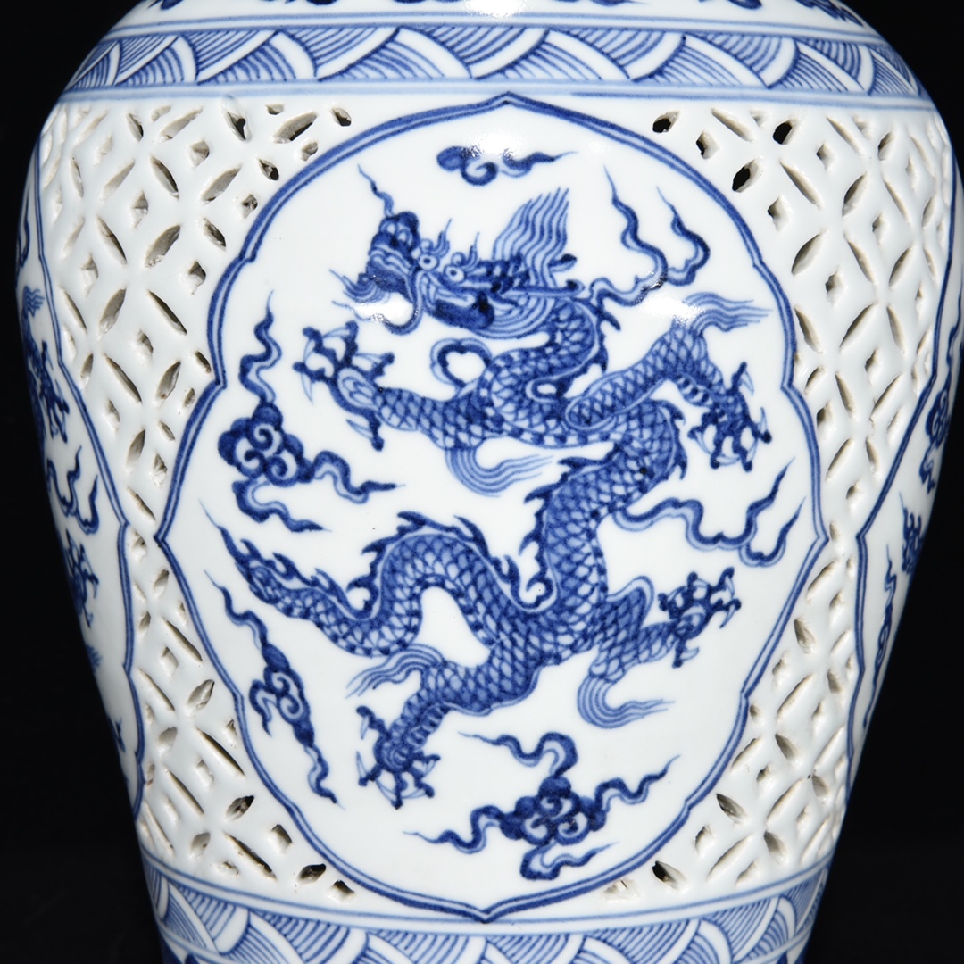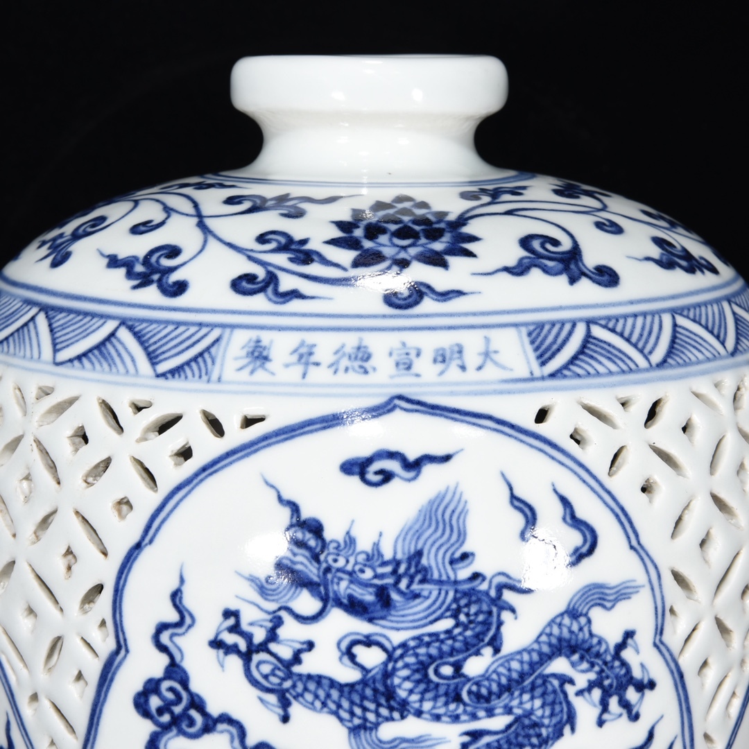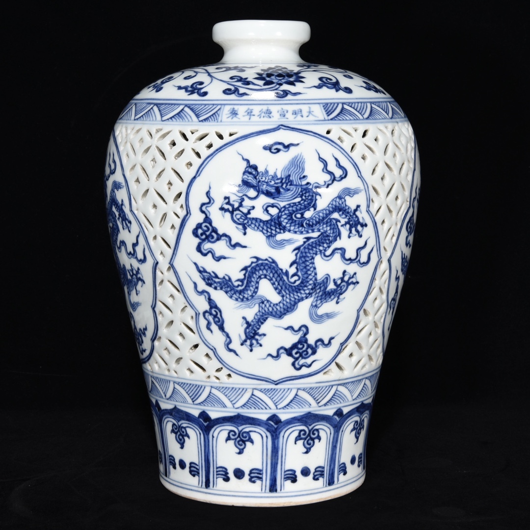 *珍品旧蔵* 明 宣德年制 鏤空 青花 龍紋 梅瓶 陶芸 古陶磁器 中国磁器 極細工 唐物 中国古玩 骨董品 古美味 H45