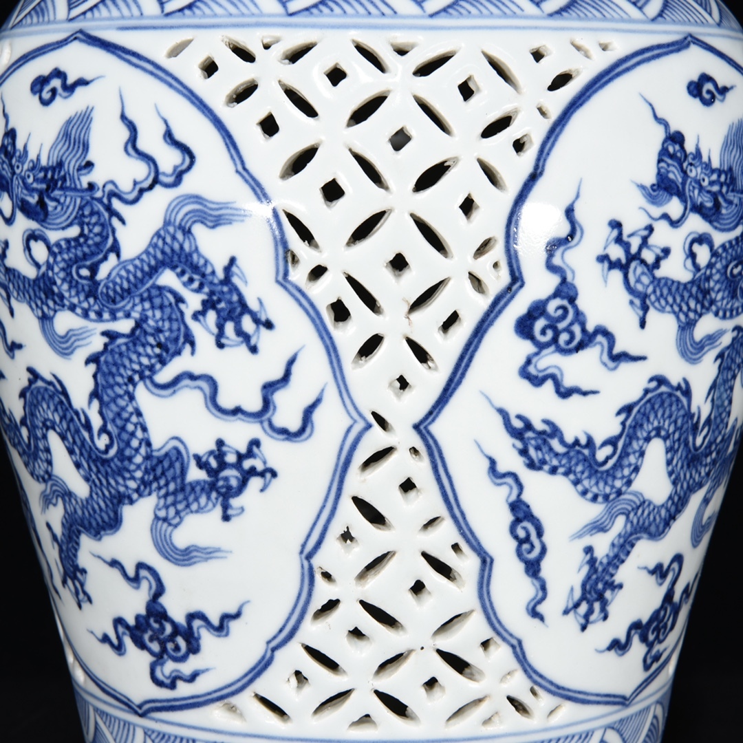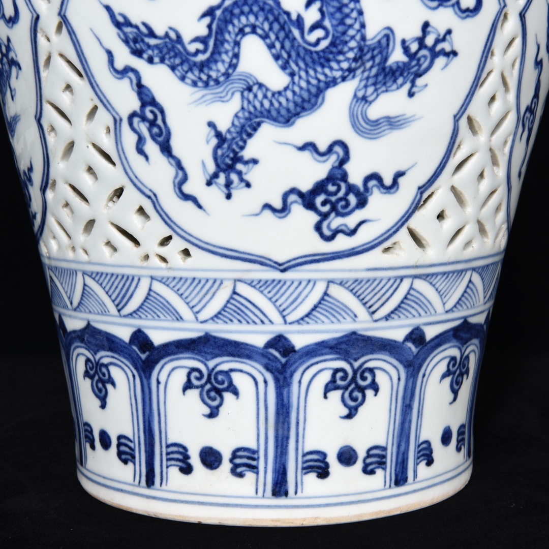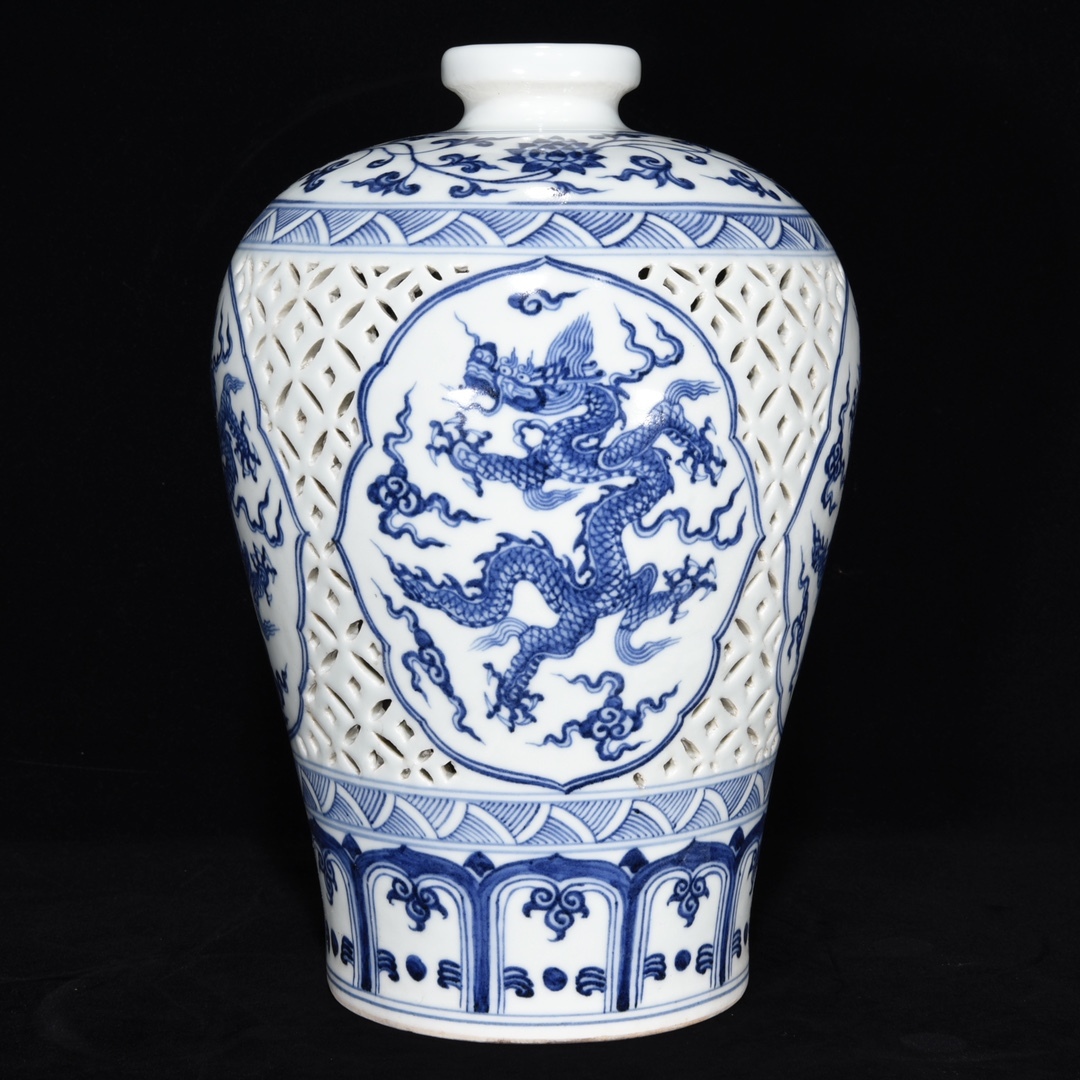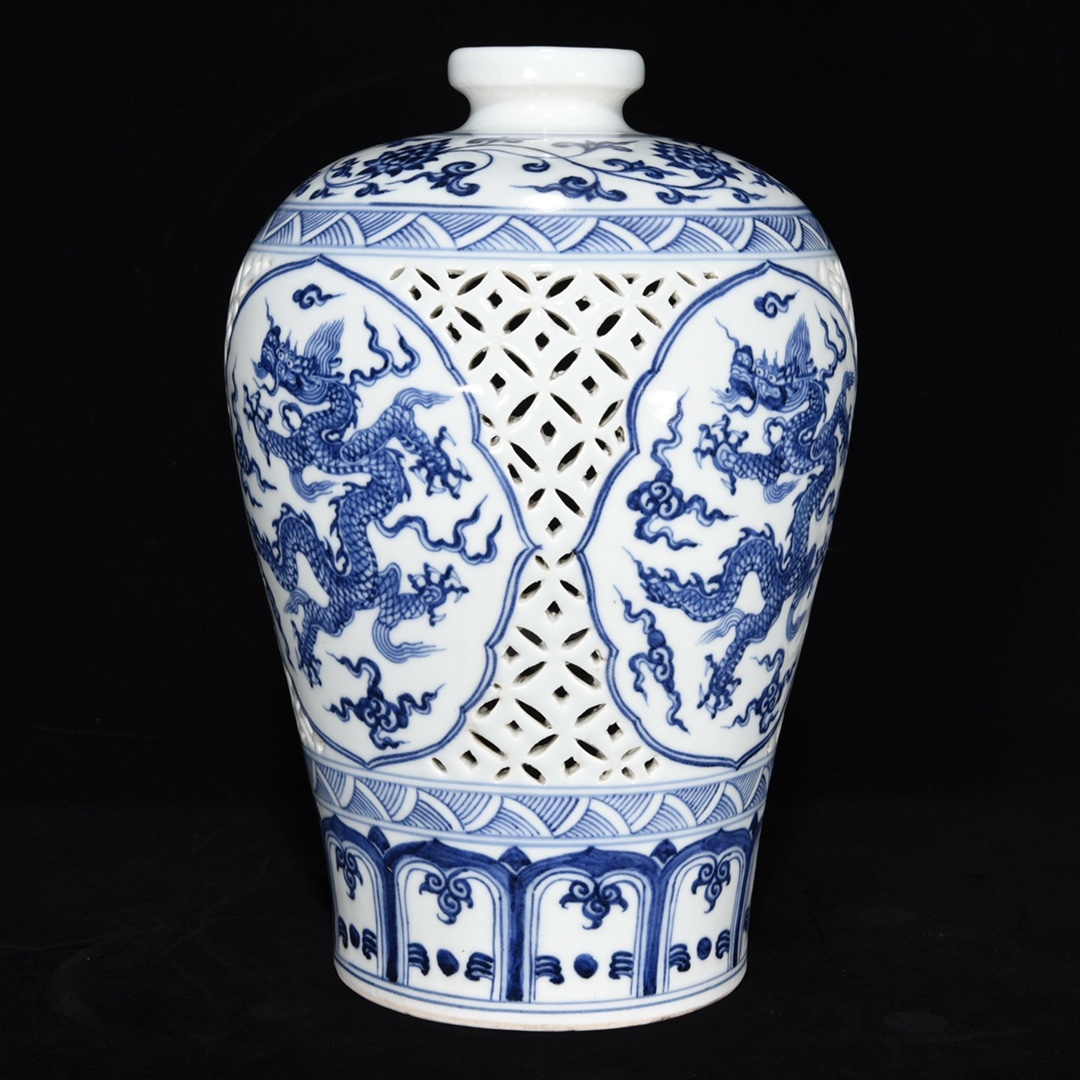 *珍品旧蔵* 明 宣德年制 鏤空 青花 龍紋 梅瓶 陶芸 古陶磁器 中国磁器 極細工 唐物 中国古玩 骨董品 古美味 H45