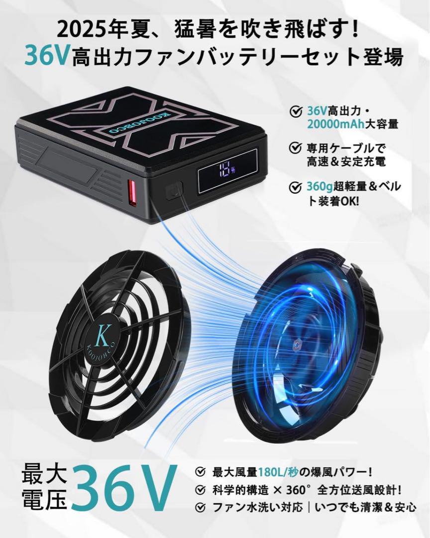【2025年最新作 36V超高出力ファンバッテリーセット】36Vの高出力・最大180L/秒の風量を誇るファン付き作業服用ファンバッテリーセットが登場!空調作業服用ファンは航空力学を応用した流線型の5枚大面積羽根を搭載し、風扇の前後カバーには85度のアークデザインが採用され、風の抵抗を最大限に減少させます。一日中連続使用できる20000mAhの大容量専用バッテリーで、ワンボタンで20V、24V、28V、32V、36Vの5段階に切り替えが可能
