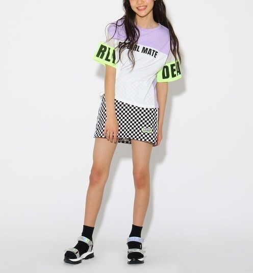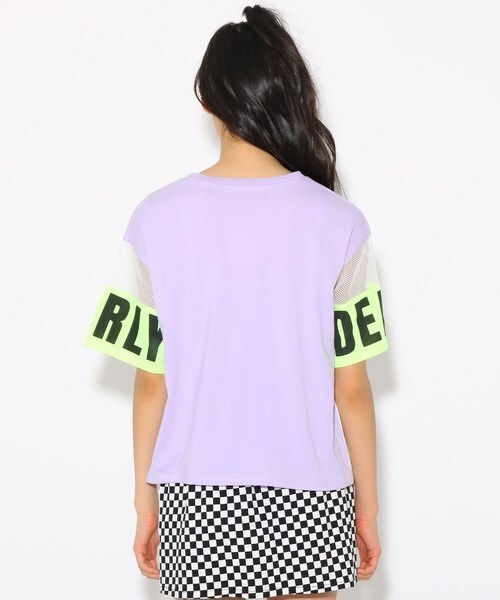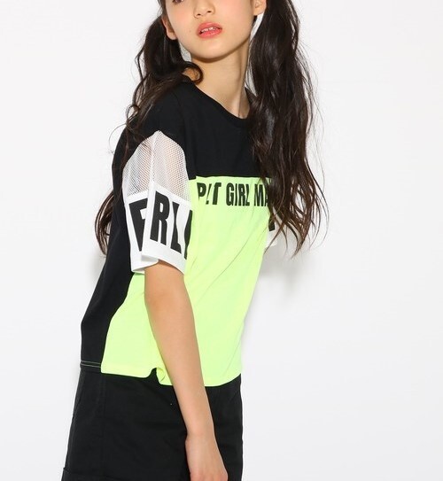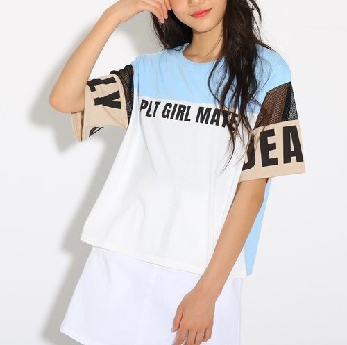 袖は透け感のある素材を組み合わせたカラーブロックで、大きなロゴが目をひきます。