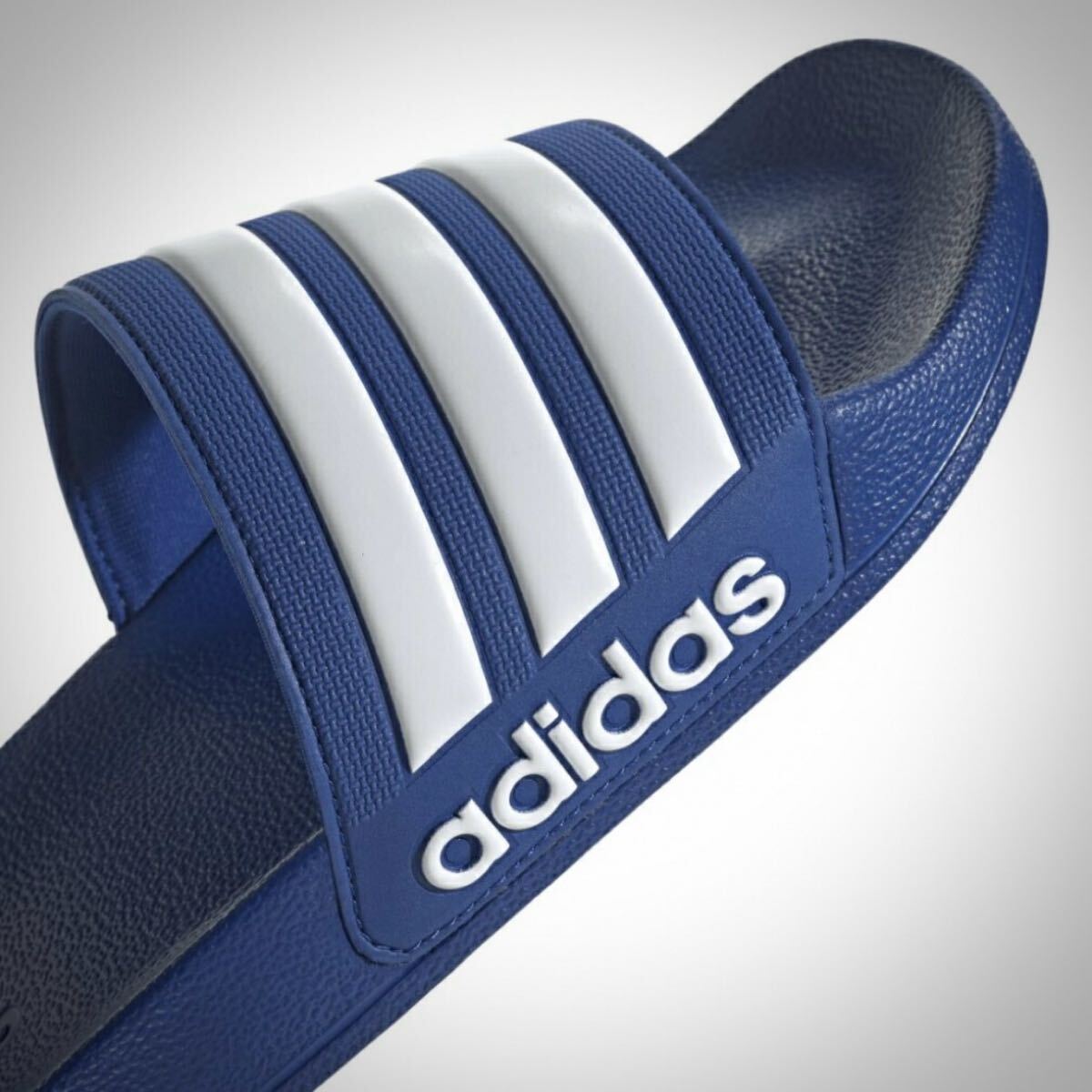 アディダスロゴとスリーストライプスをあしらって、アイコニックなアディレッタスタイルを完成させている。