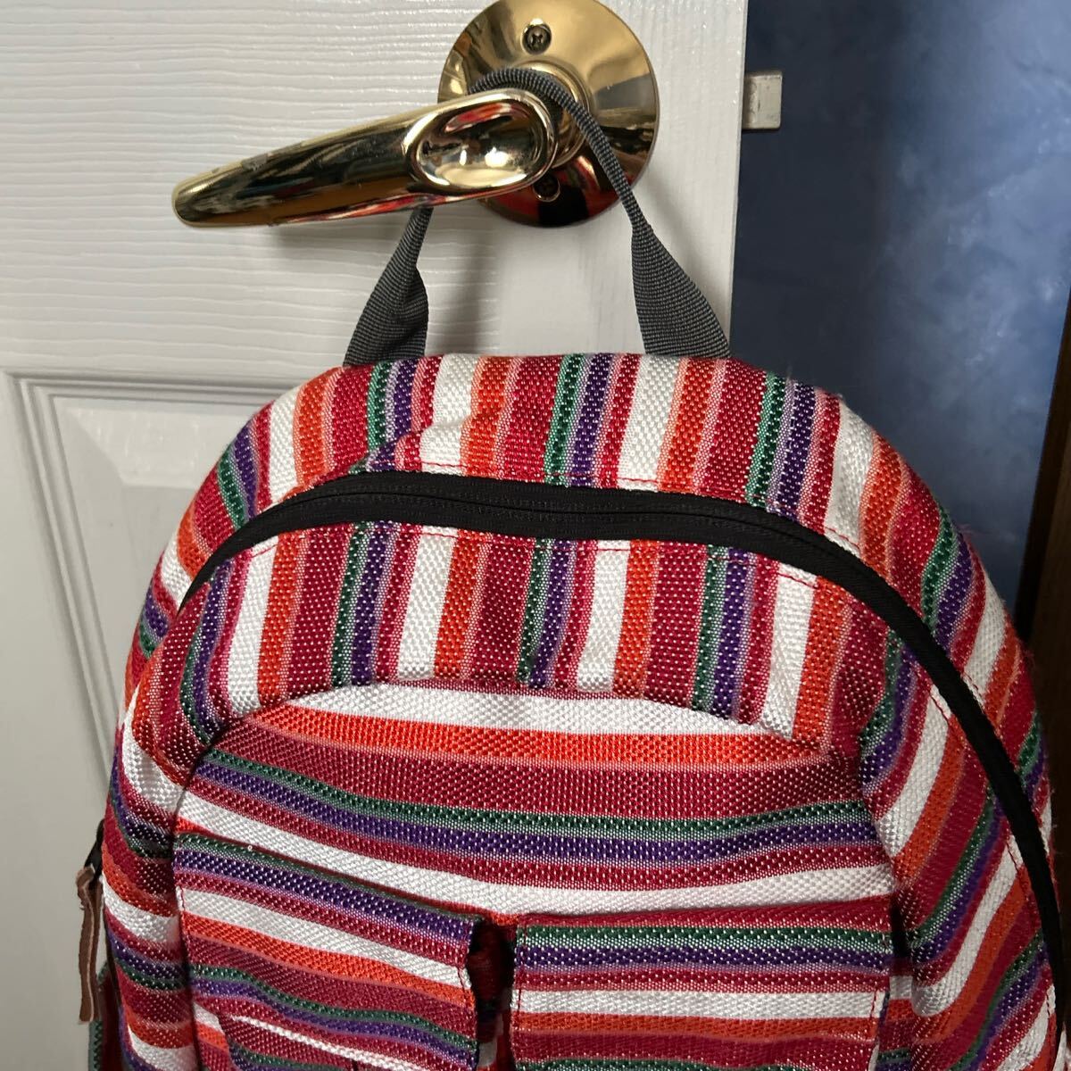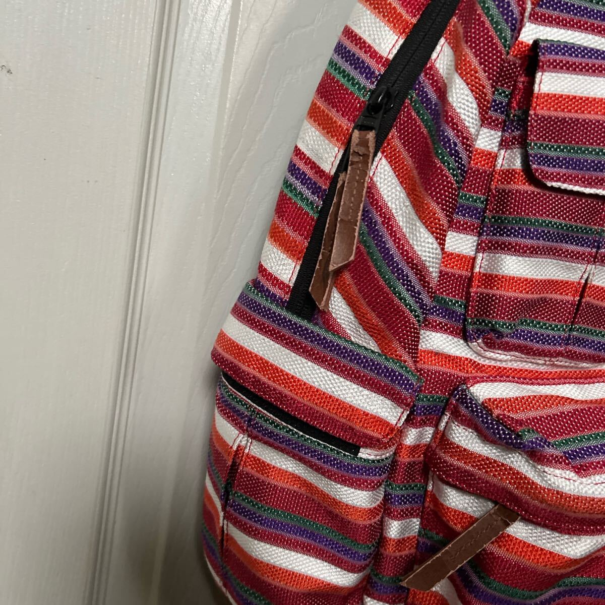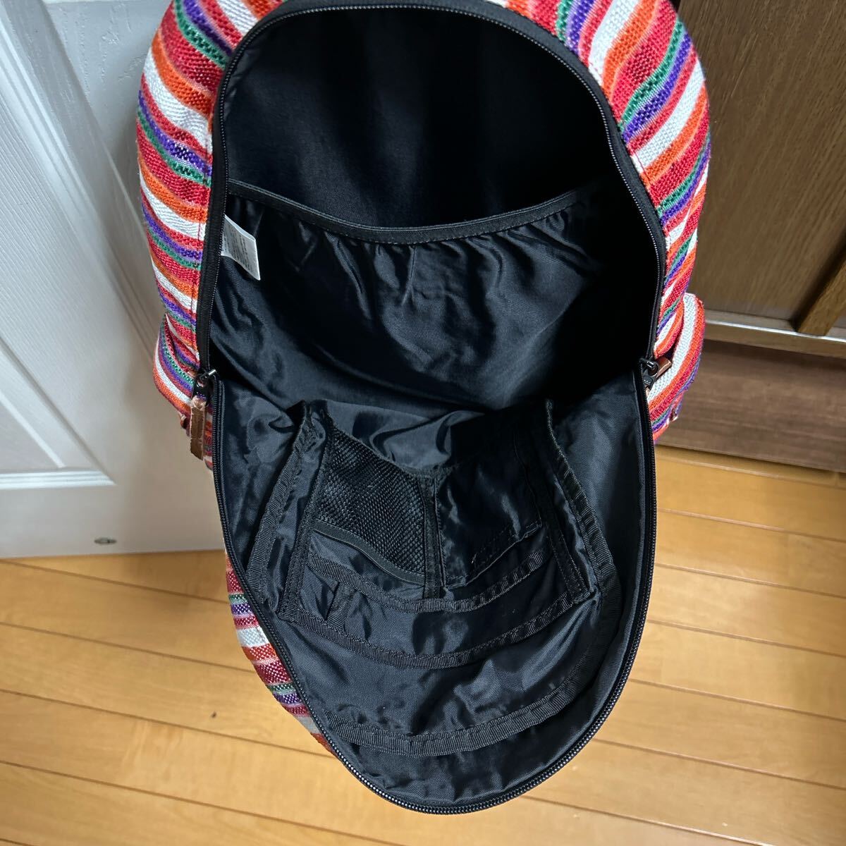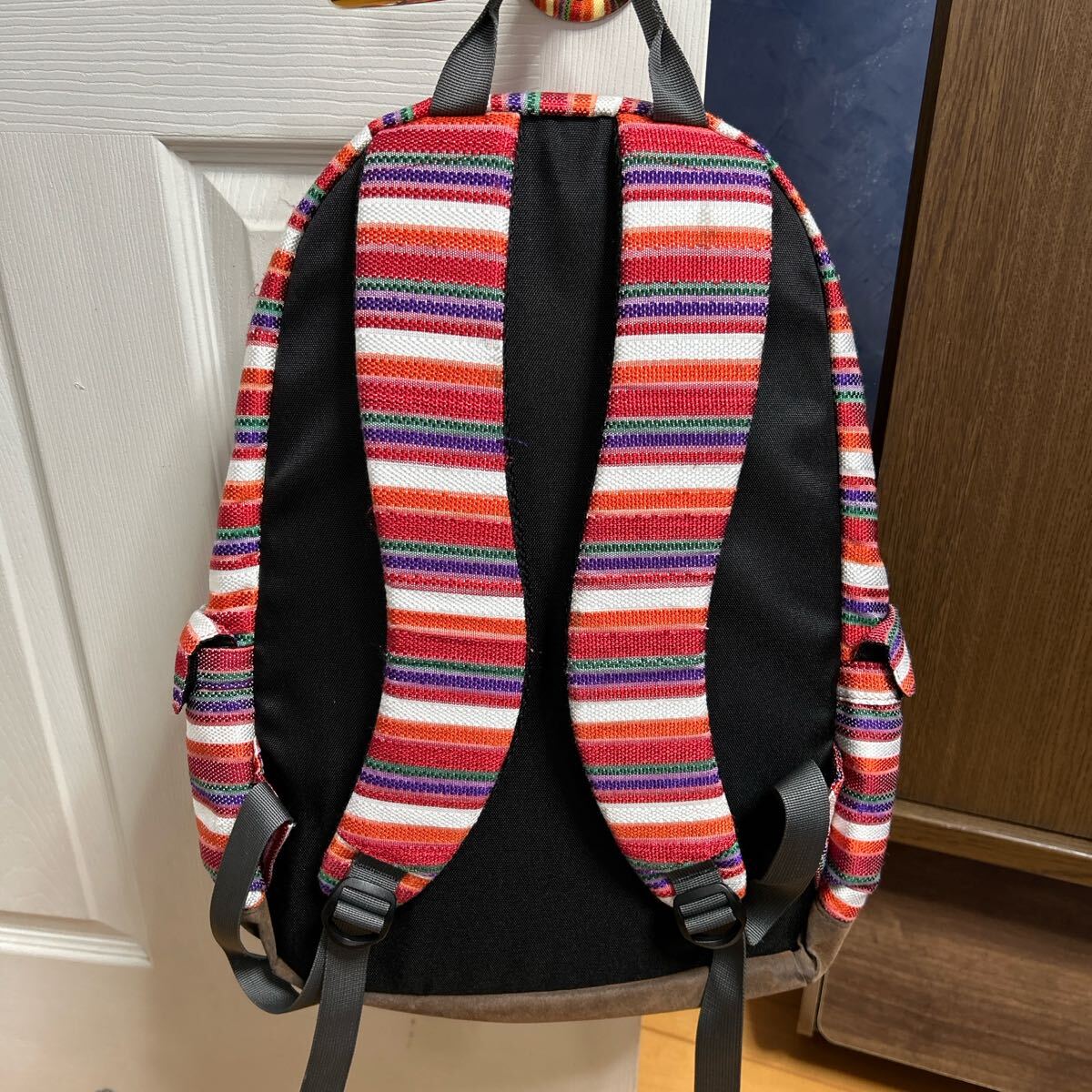 カラフルなストライプデザインのリュック、調整可能なショルダーストラップ付き。