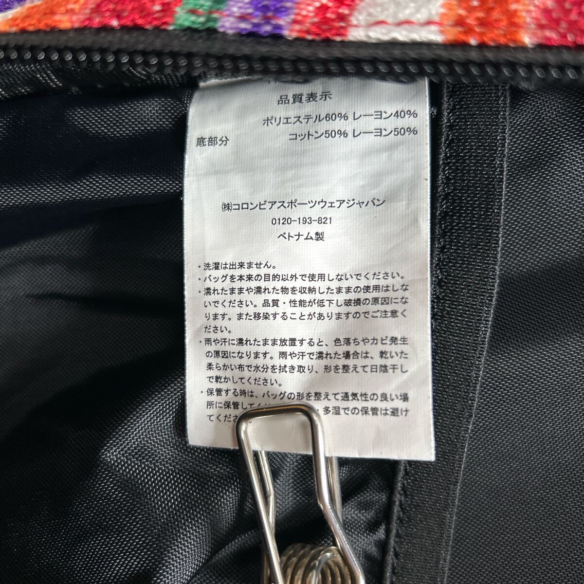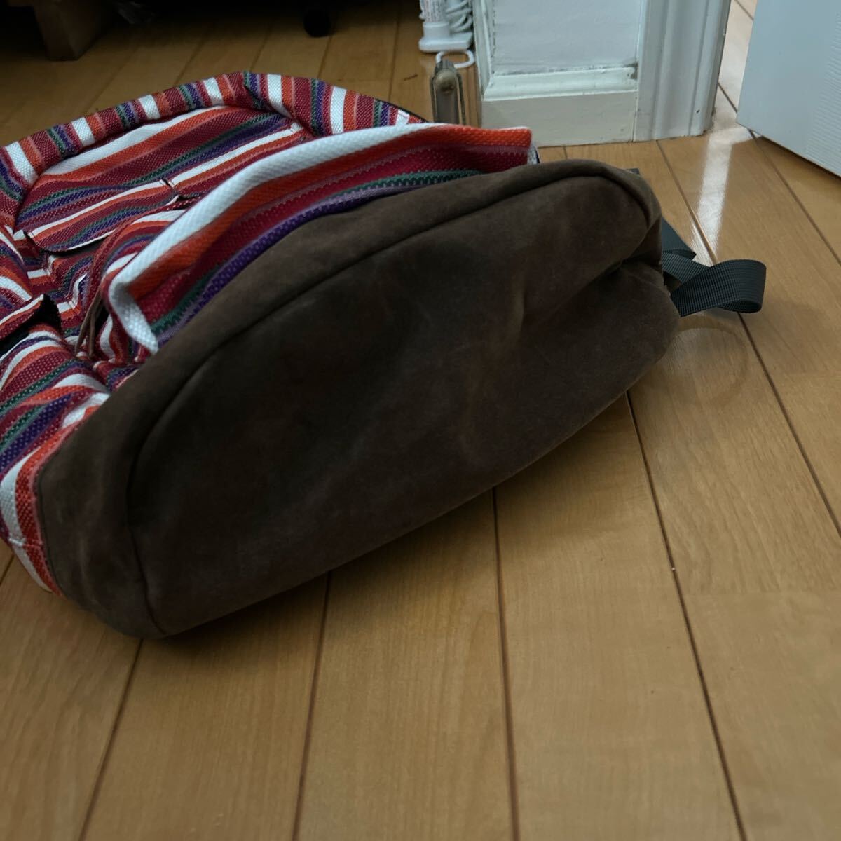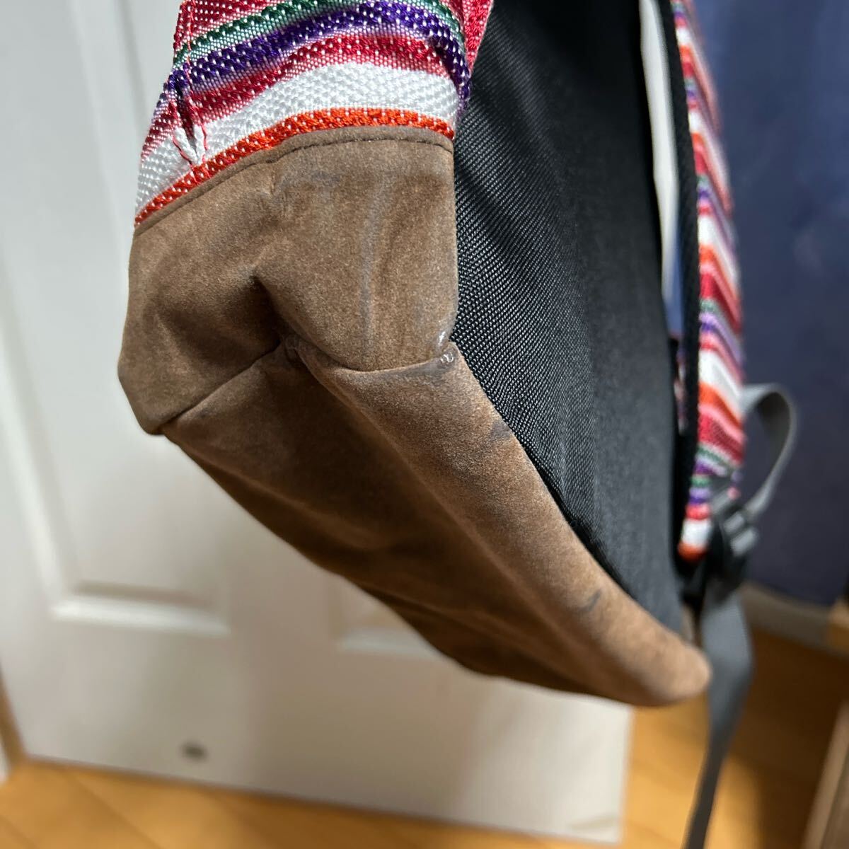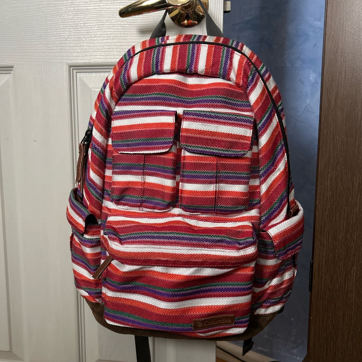 カラフルなストライプデザインのリュック、調整可能なショルダーストラップ付き。