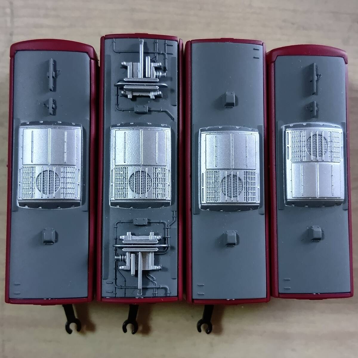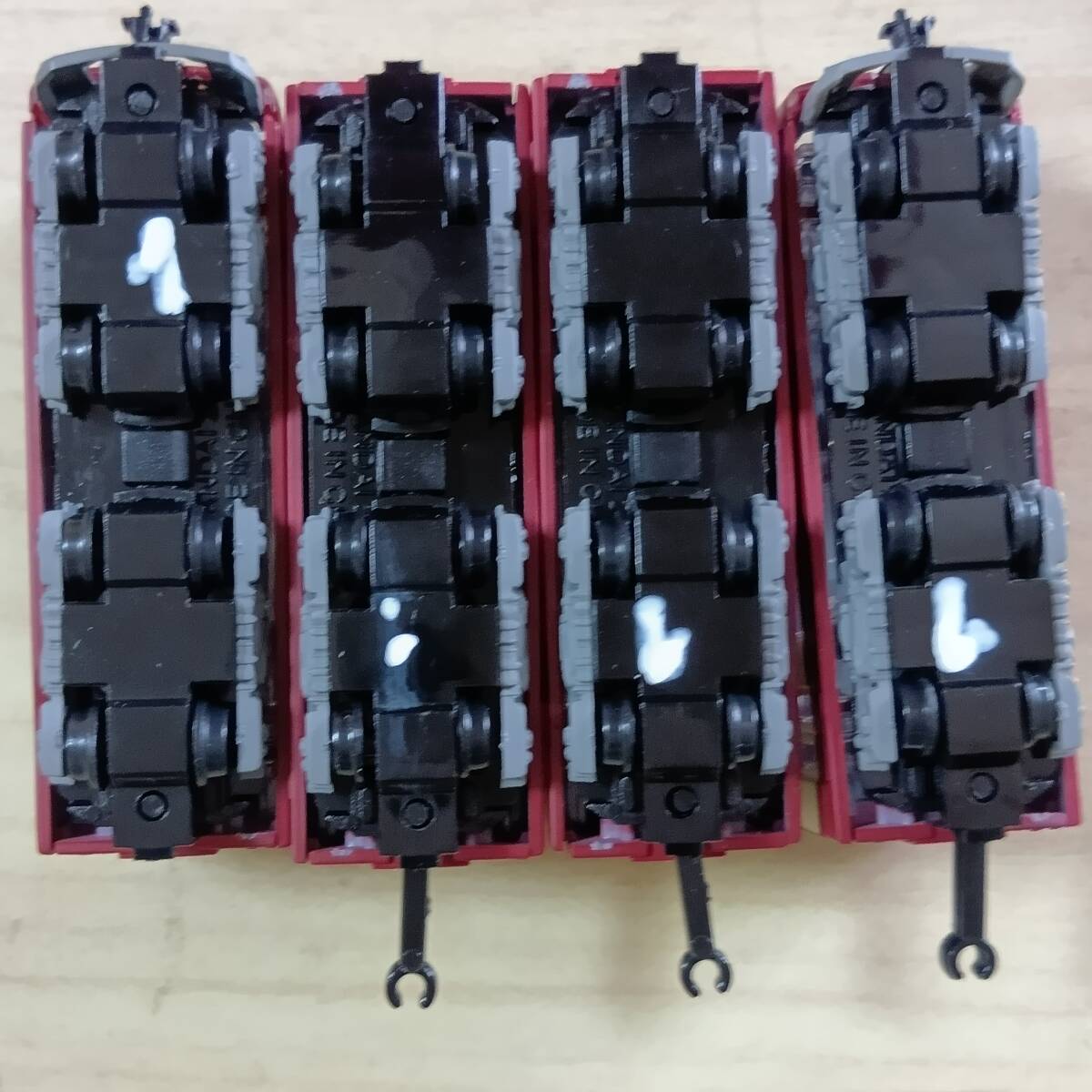 写真のもの送ります。きれいなものもあれば、塗装はげ、色付き、傷、欠品、壊れている(ボディー割れ、スカート割れ他)ものもあります。組間違いや他車部品(妻、レリーフ、パンタグラフ、スカート他)が使われている場合もあります。それらが、ついていない車両もあります。