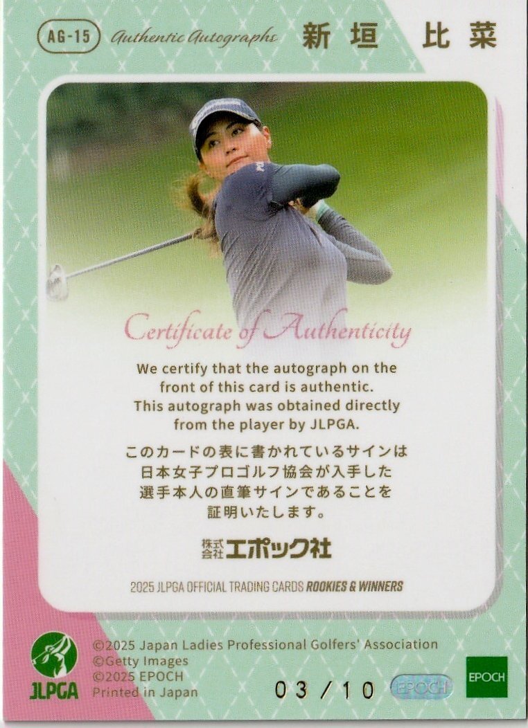 【AG-15 新垣比菜】3/10 縦版直筆サインカード EPOCH 2025 JLPGA OFFICIAL TRADING CARDS ROOKIES & WINNERS