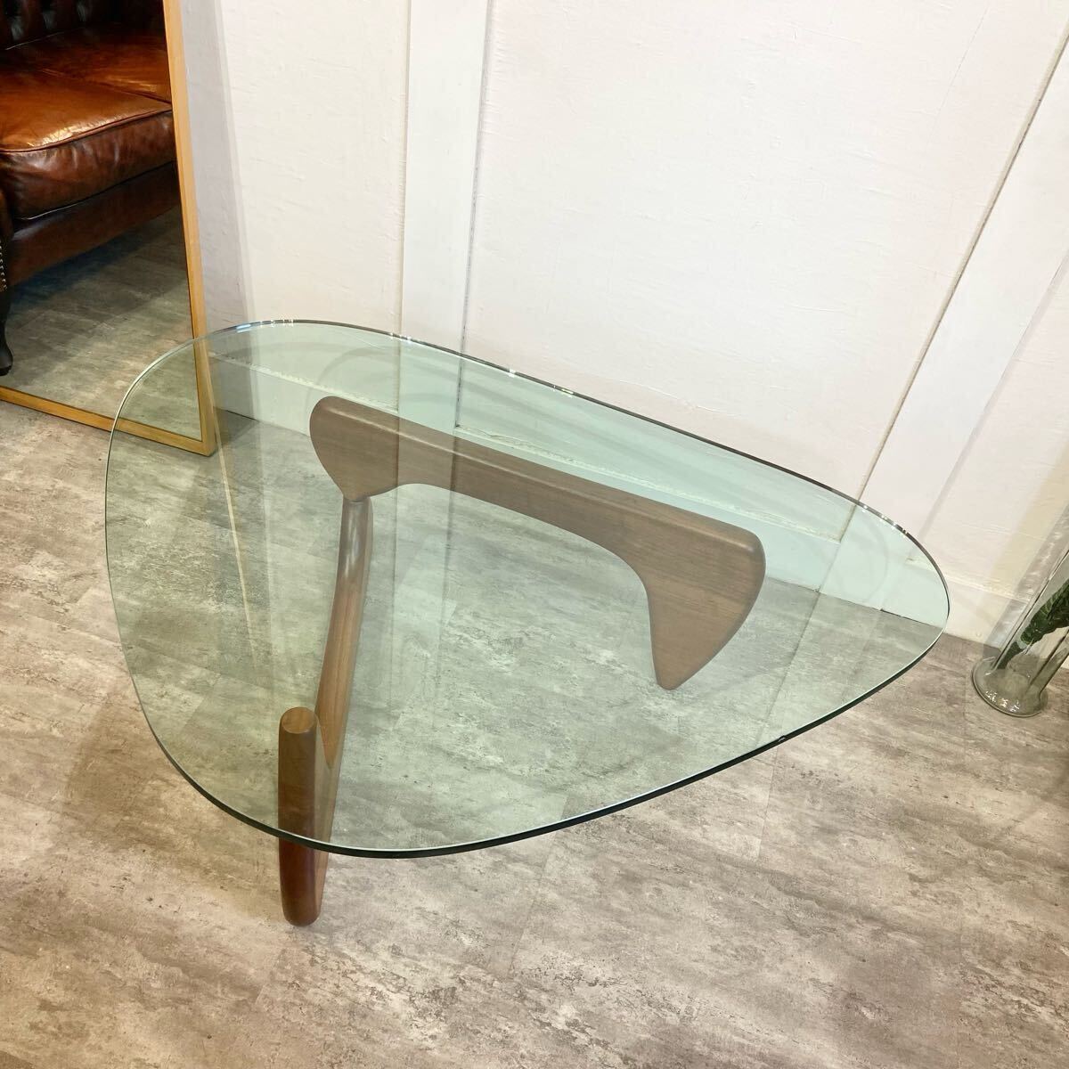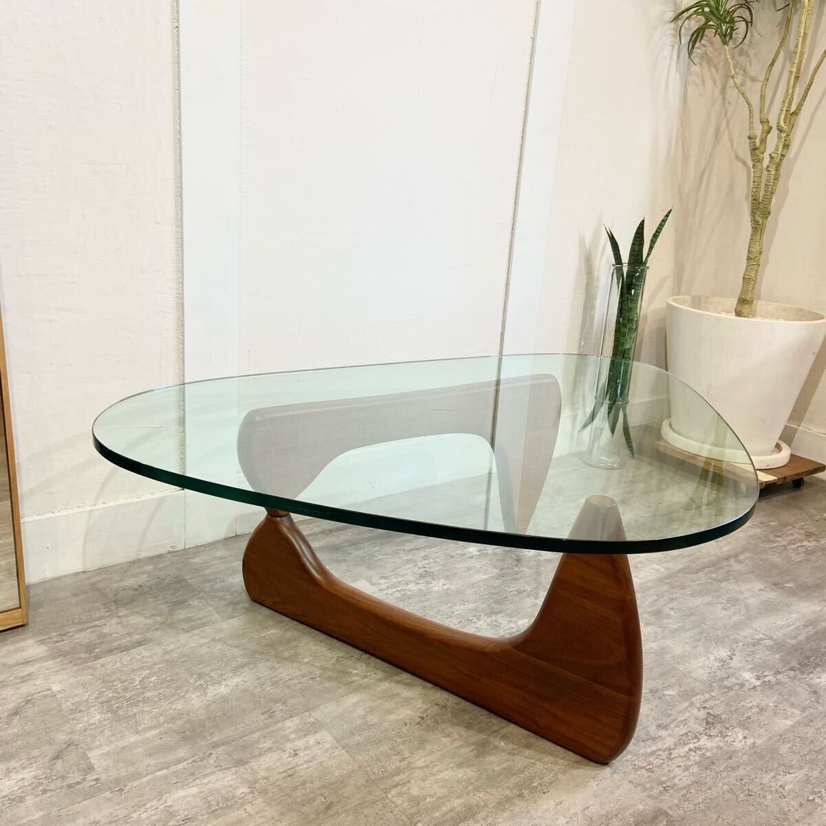 イサムノグチ・コーヒーテーブルのリプロダクト品です。三角形のガラス天板を、特徴でもある有機的な曲線デザインのウッド脚が支える浮遊感あふれるデザインで、ミッドセンチュリーモダンのアイコン的な名作家具です。ミッドセンチュリーの雰囲気を取り入れたい方におすすめです。