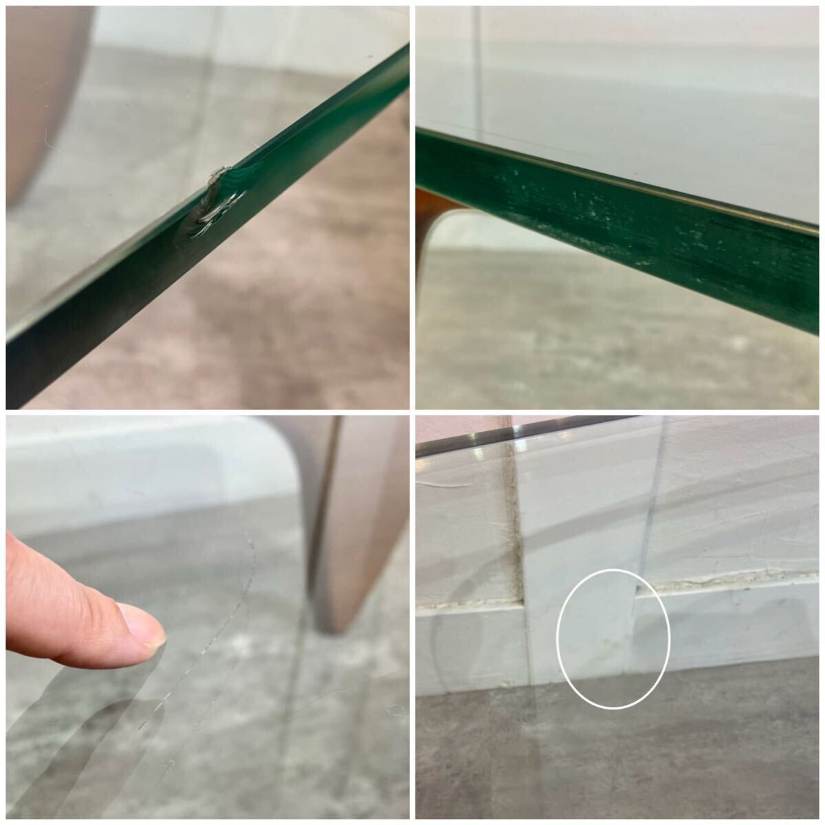 ・ガラス天板に1ヵ所、目立つカケがあります。また表面・エッジの部分に、目立つキズやガラスの汚れが多数あります。