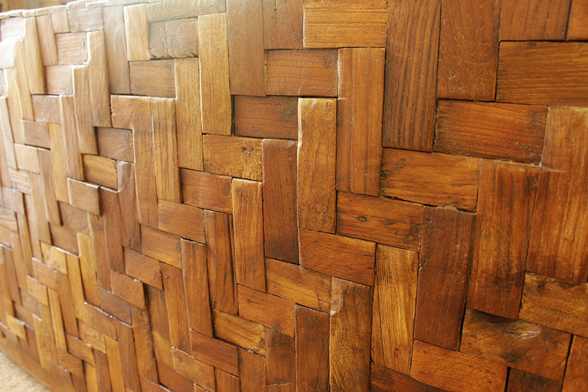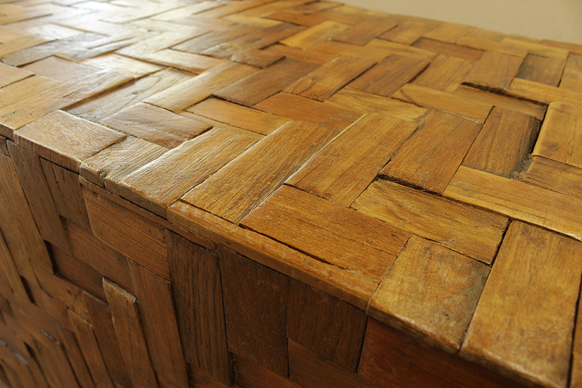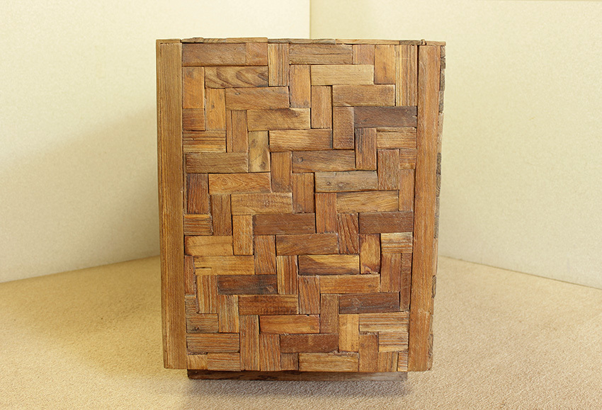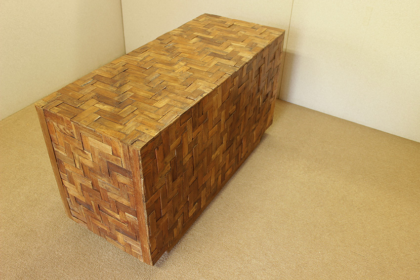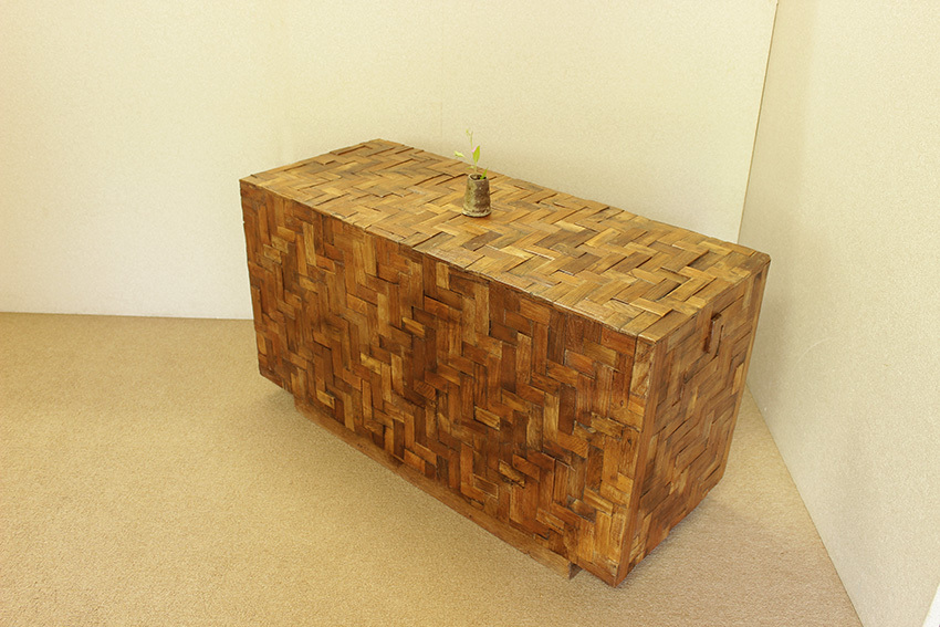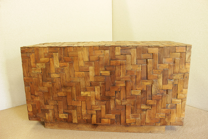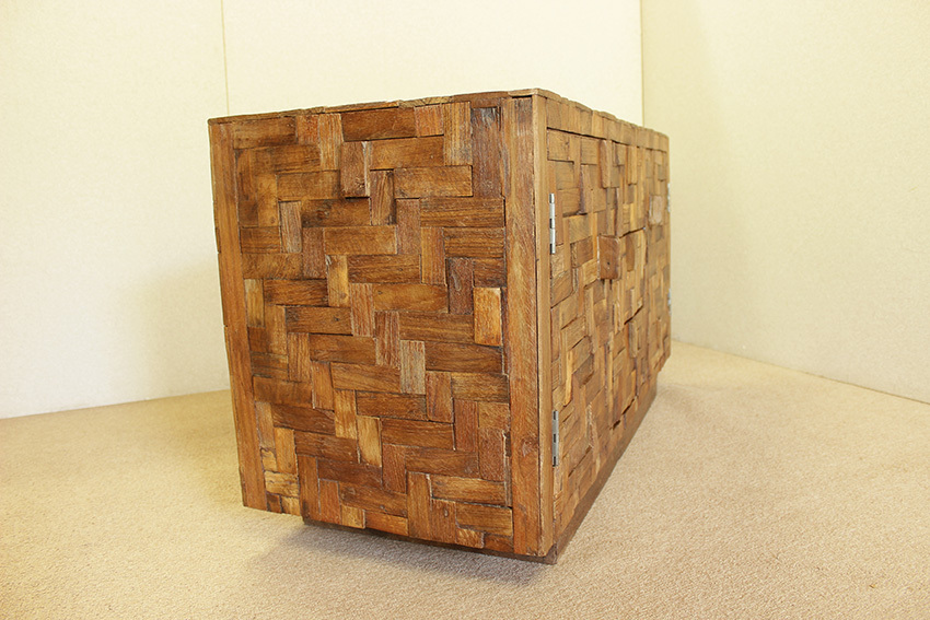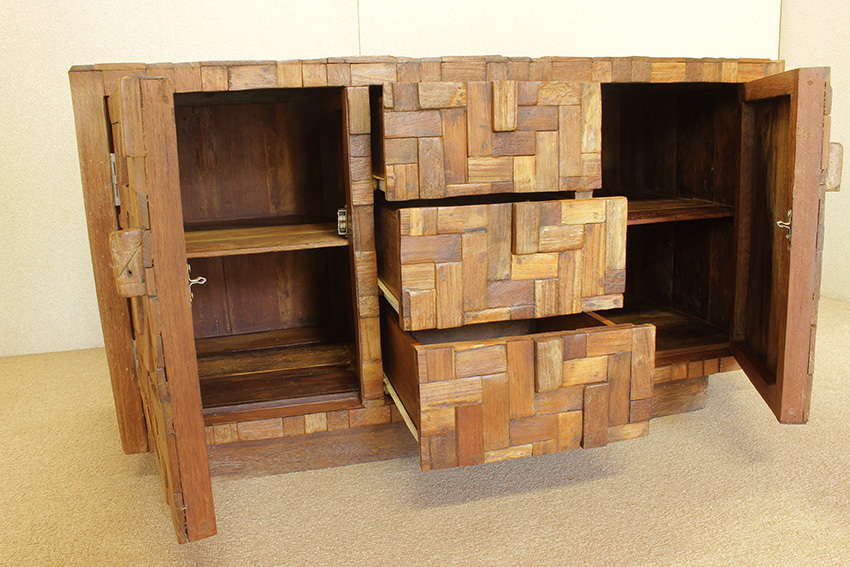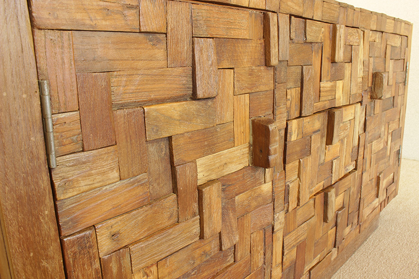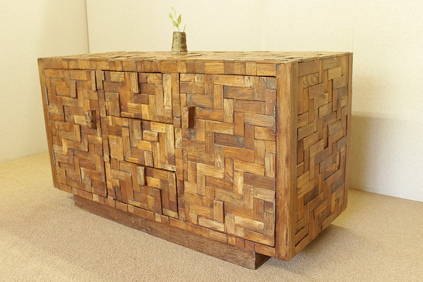 全面にチーク古木自然杢凹凸の美しい板を組みこんだ、寄木キャビネットです。