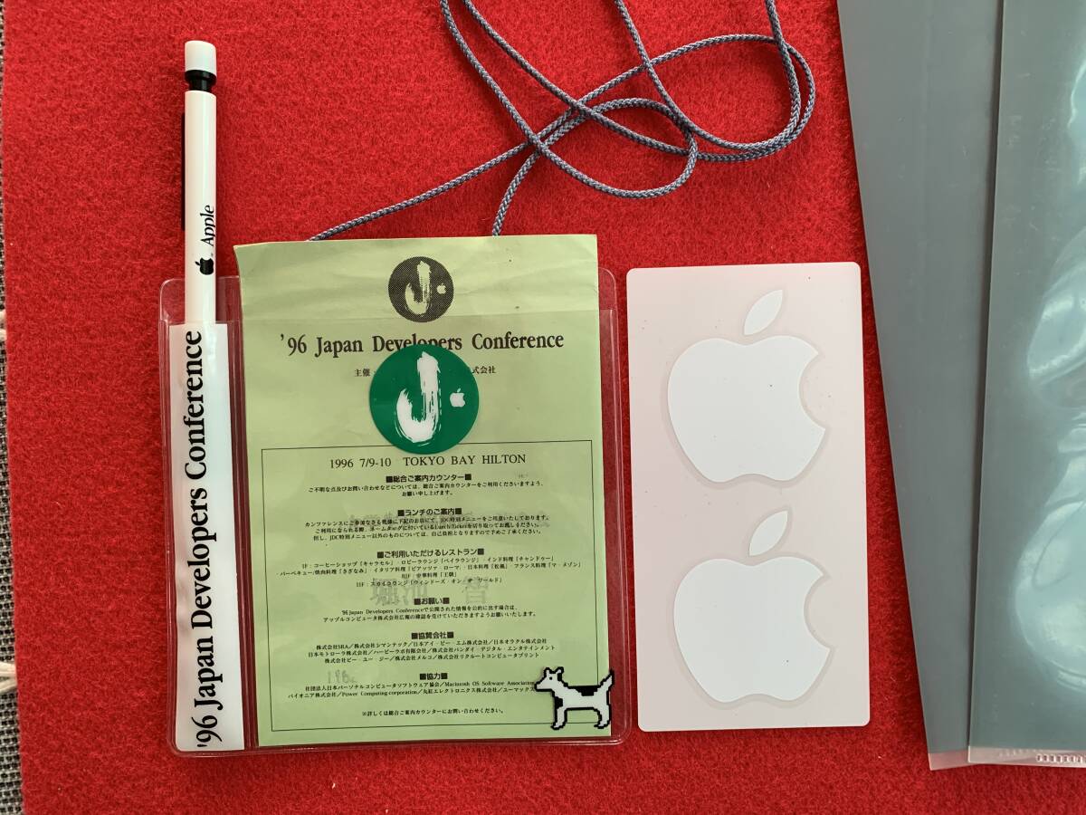 ●非売品でレアな、アップルコンピュータデベロッパーカンファレンス Japan Developers Conference 入館証と、アップルシャープペン。クアップルリアファイル2枚、アップルステッカーのセットです。